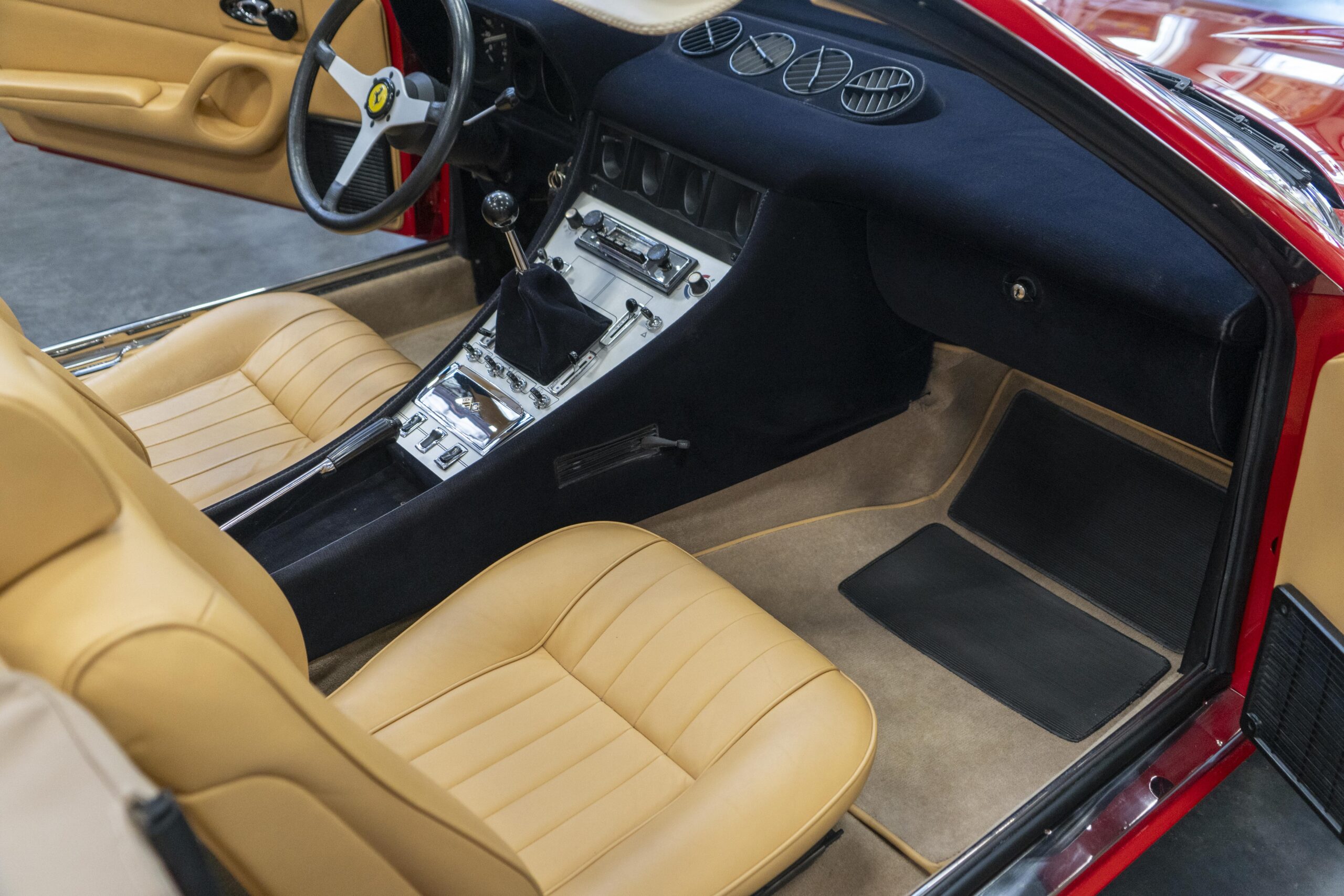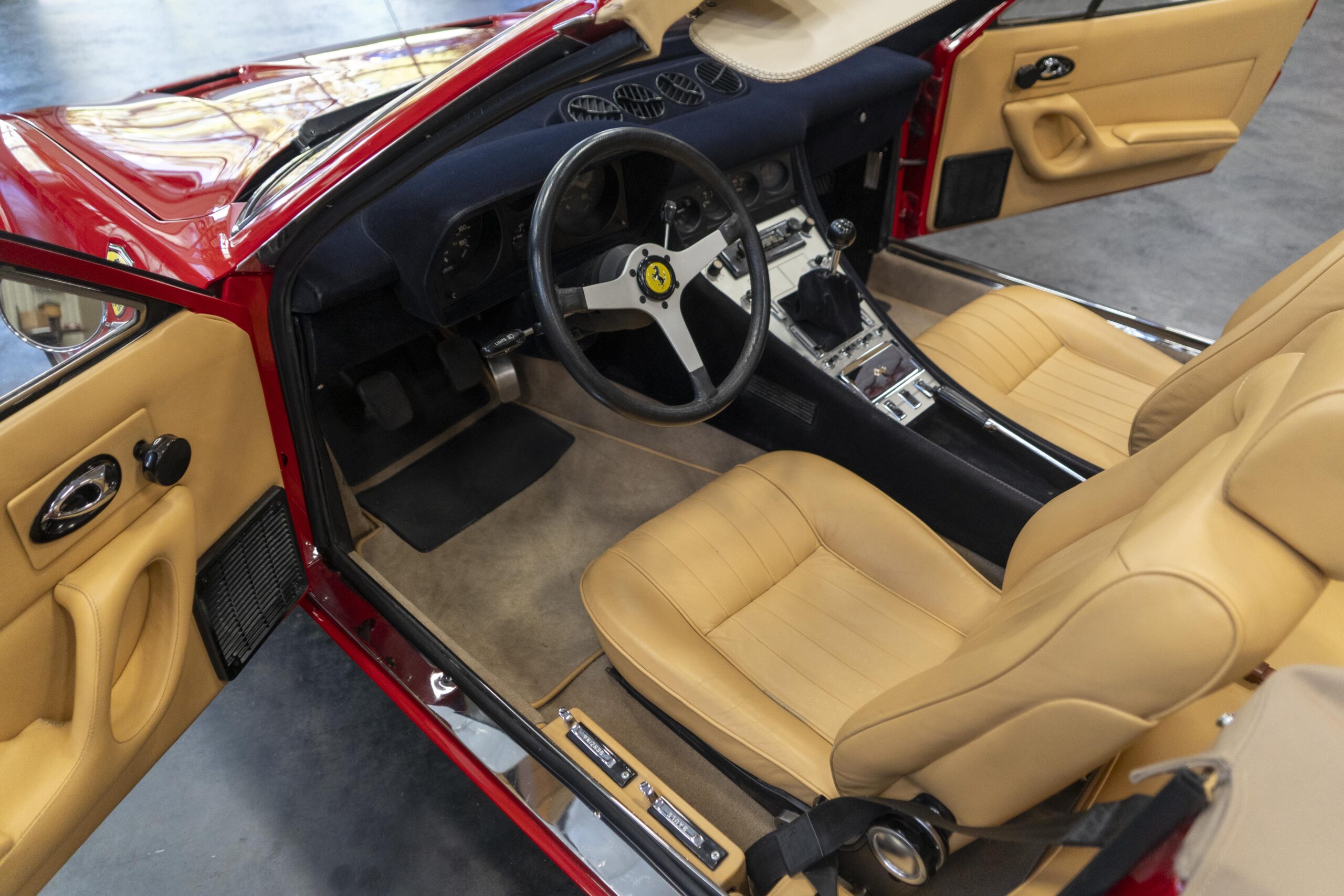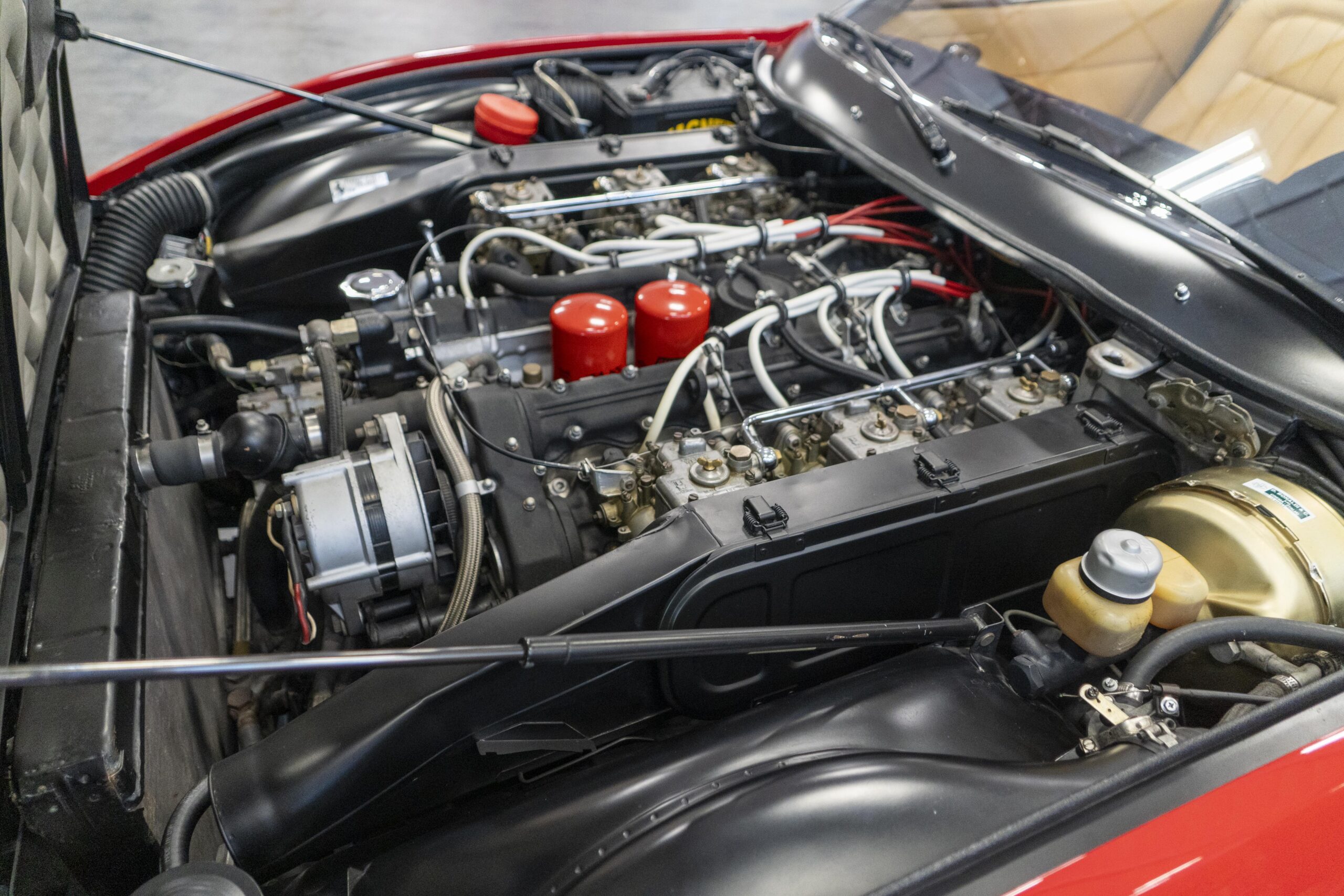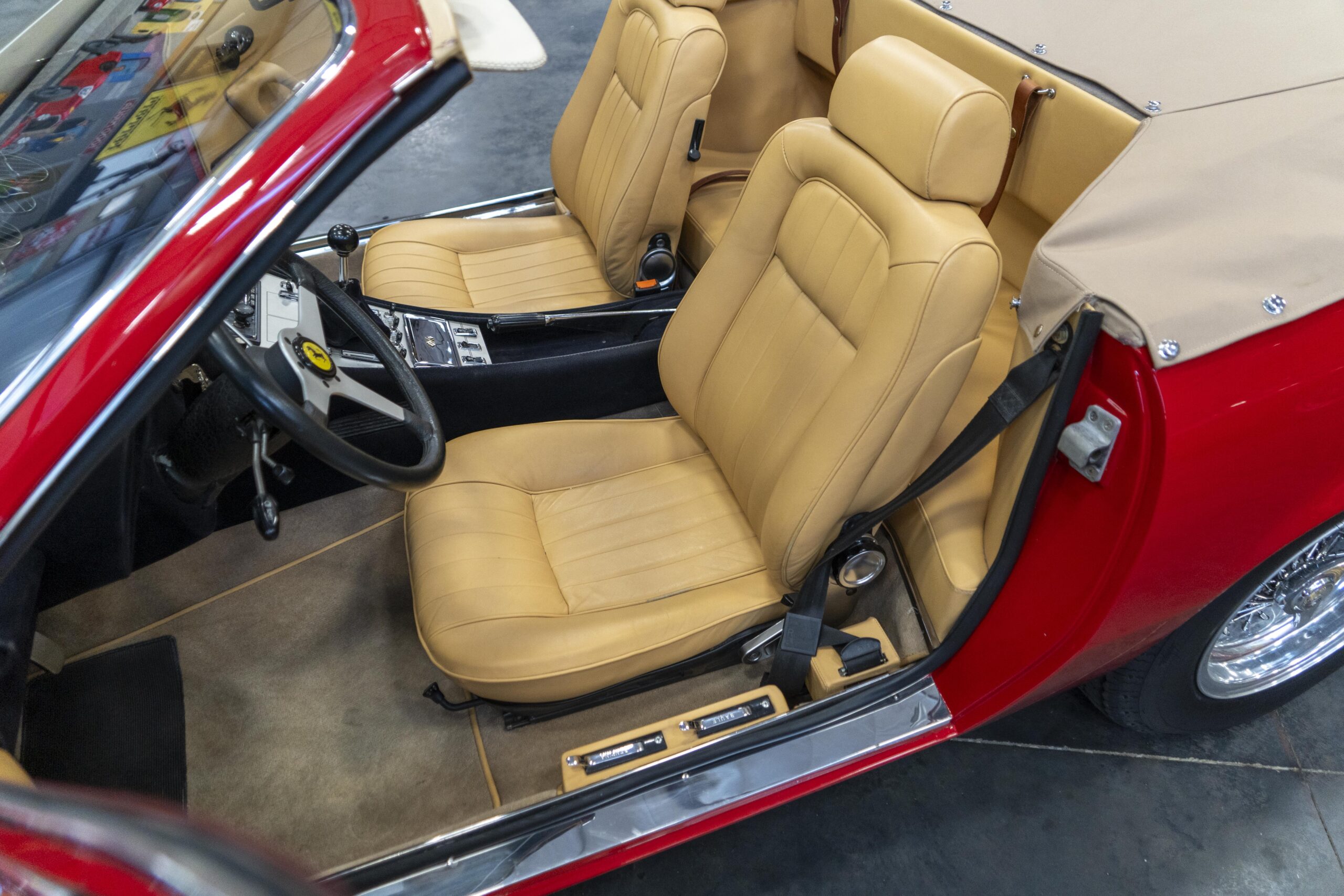 Ferrari 365 GTC/4 Spyder s/n 14745 is gorgeous with the top down, elegant with the top up and striking with the hardtop in place! She sits on an excellent set of 7 1/2″ x 15″ Borrani 4075 wheels with three-eared knockoffs and wears a set of Pirelli Cinturato HS 215/70 R15 tires with a correct 7 1/2″ x 15″ Borrani 4075 spare wheel and tire. 365 GTC/4 s/n 14745 is a Euro model and so doesn’t suffer through the power killing US smog pump, diverter valve, air injection tubing and air mixture tubes on the US models! Even better, because she is pre-1975 production Ferrari, 365 GTC/4 s/n 14745 is smog exempt in California and every other state.Â