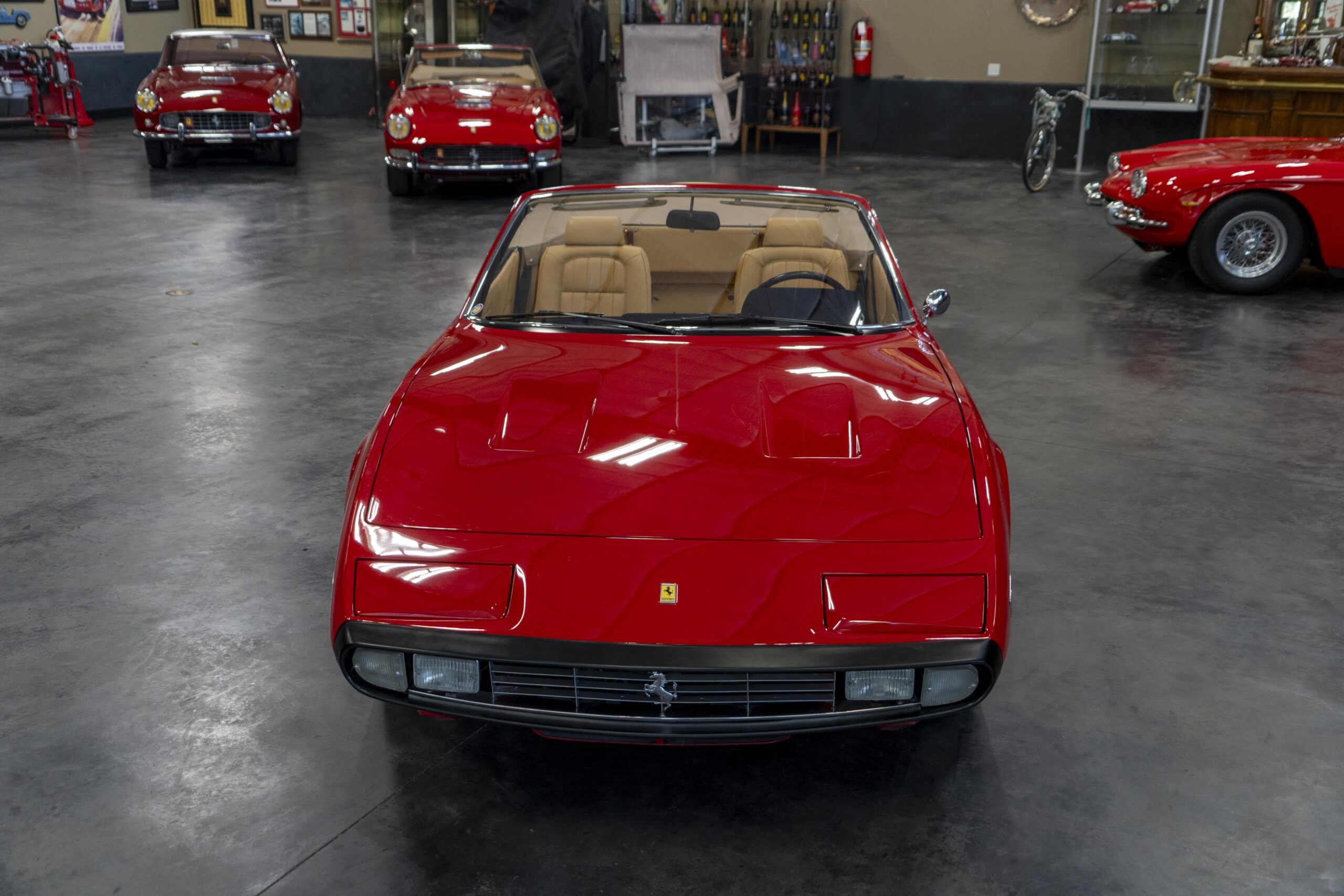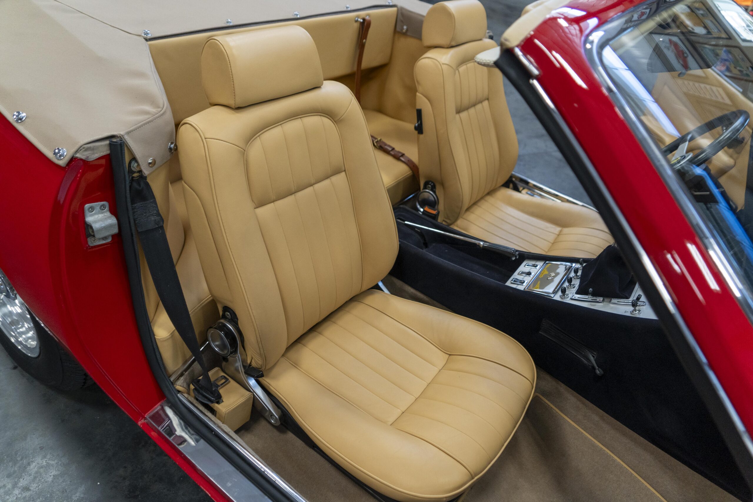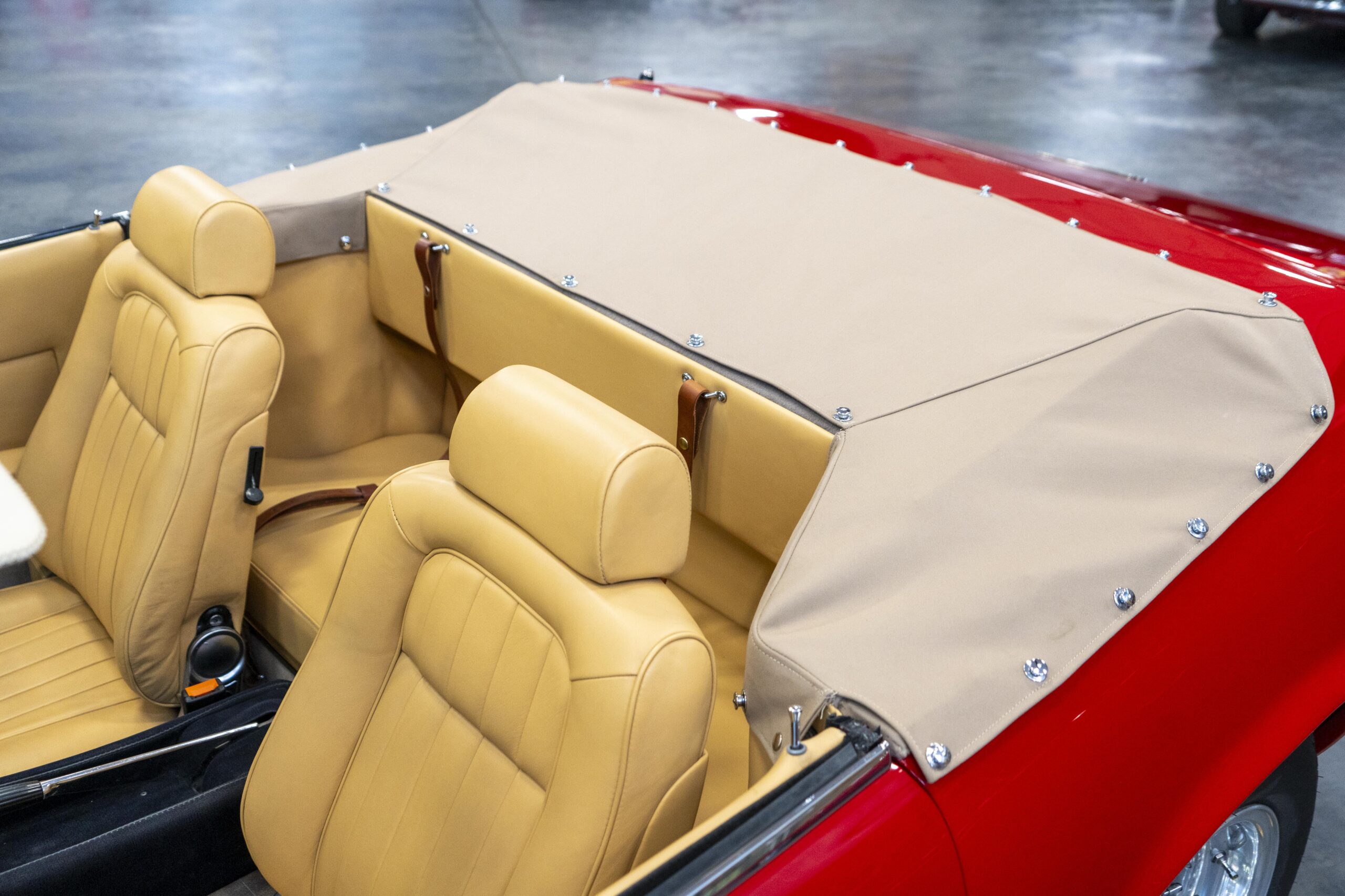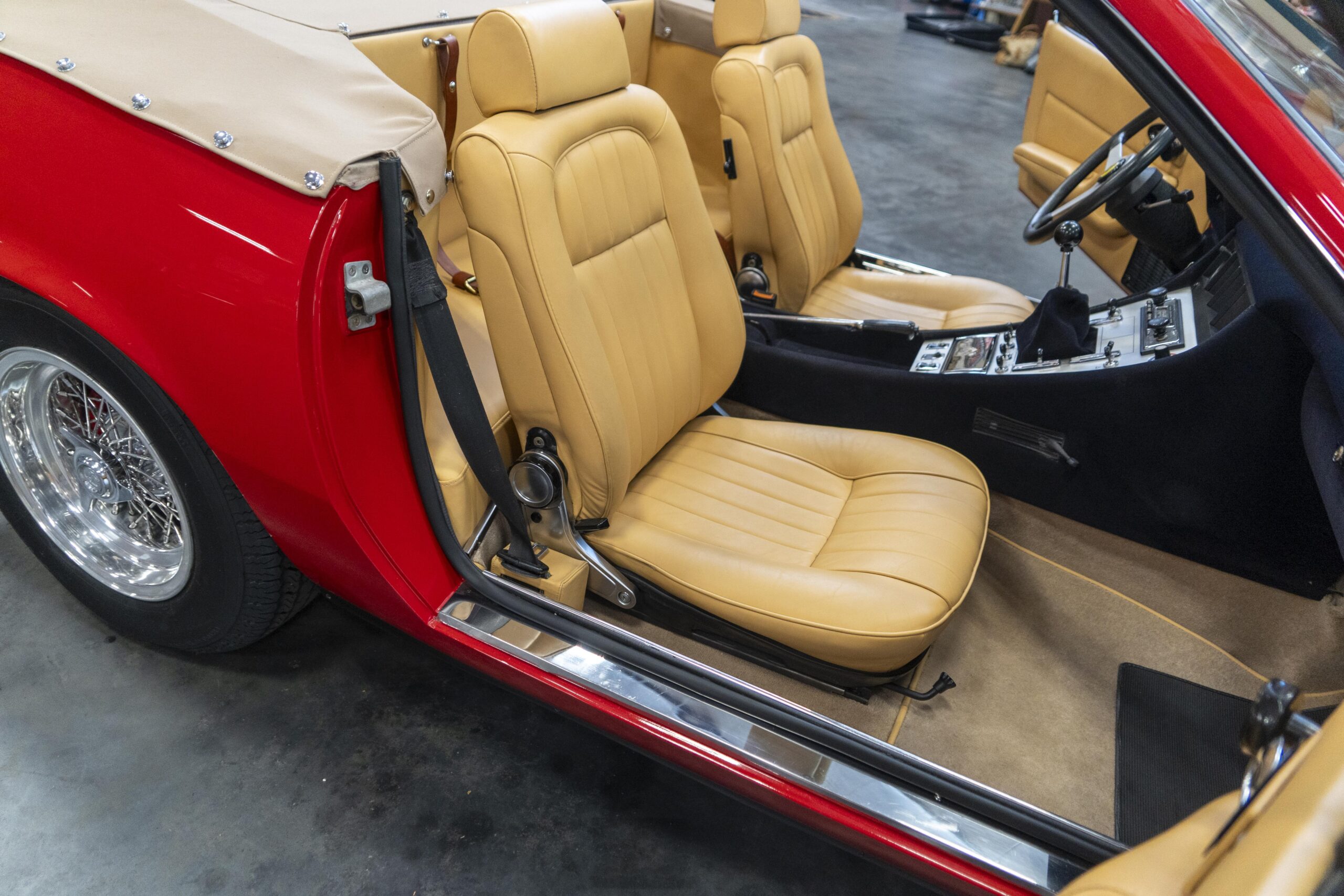 Ferrari 365 GTC/4 Spyder s/n 14745 is gorgeous with the top down, elegant with the top up and striking with the hardtop in place! She sits on an excellent set of 7 1/2″ x 15″ Borrani 4075 wheels with three-eared knockoffs and wears a set of Pirelli Cinturato HS 215/70 R15 tires with a correct 7 1/2″ x 15″ Borrani 4075 spare wheel and tire. 365 GTC/4 s/n 14745 is a Euro model and so doesn’t suffer through the power killing US smog pump, diverter valve, air injection tubing and air mixture tubes on the US models! Even better, because she is pre-1975 production Ferrari, 365 GTC/4 s/n 14745 is smog exempt in California and every other state.Â