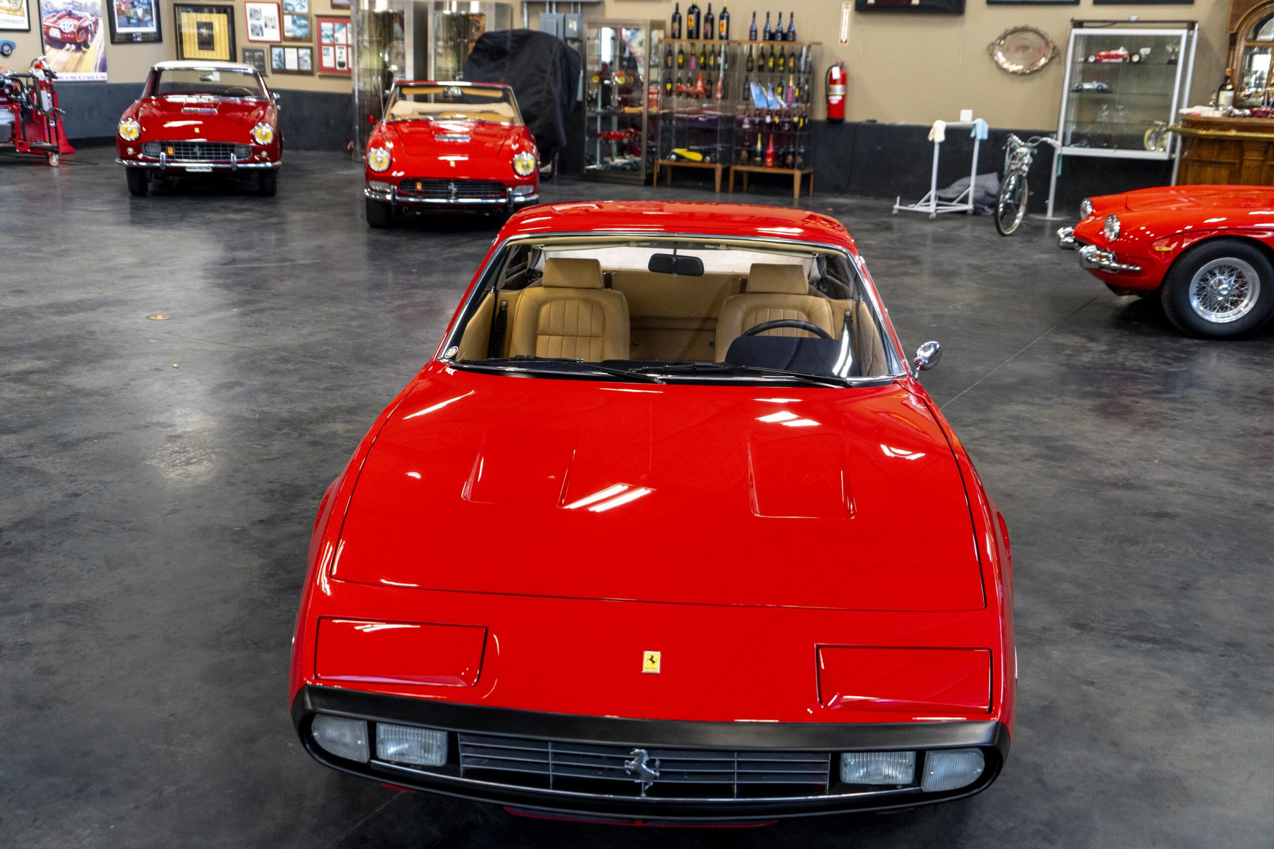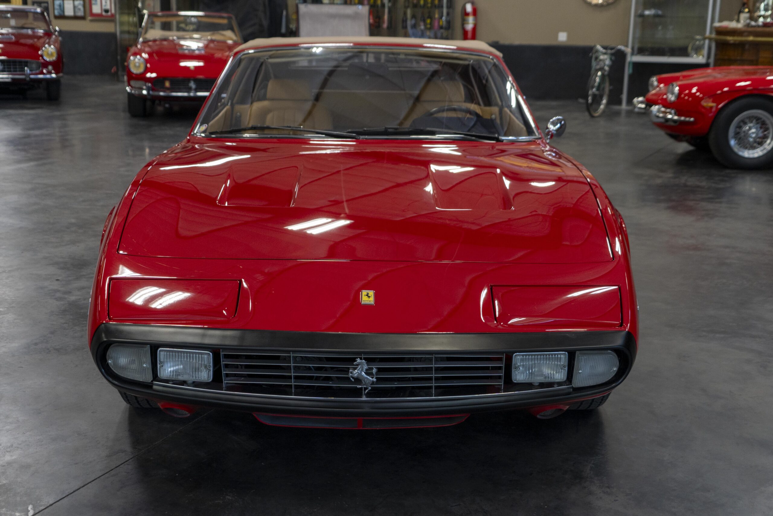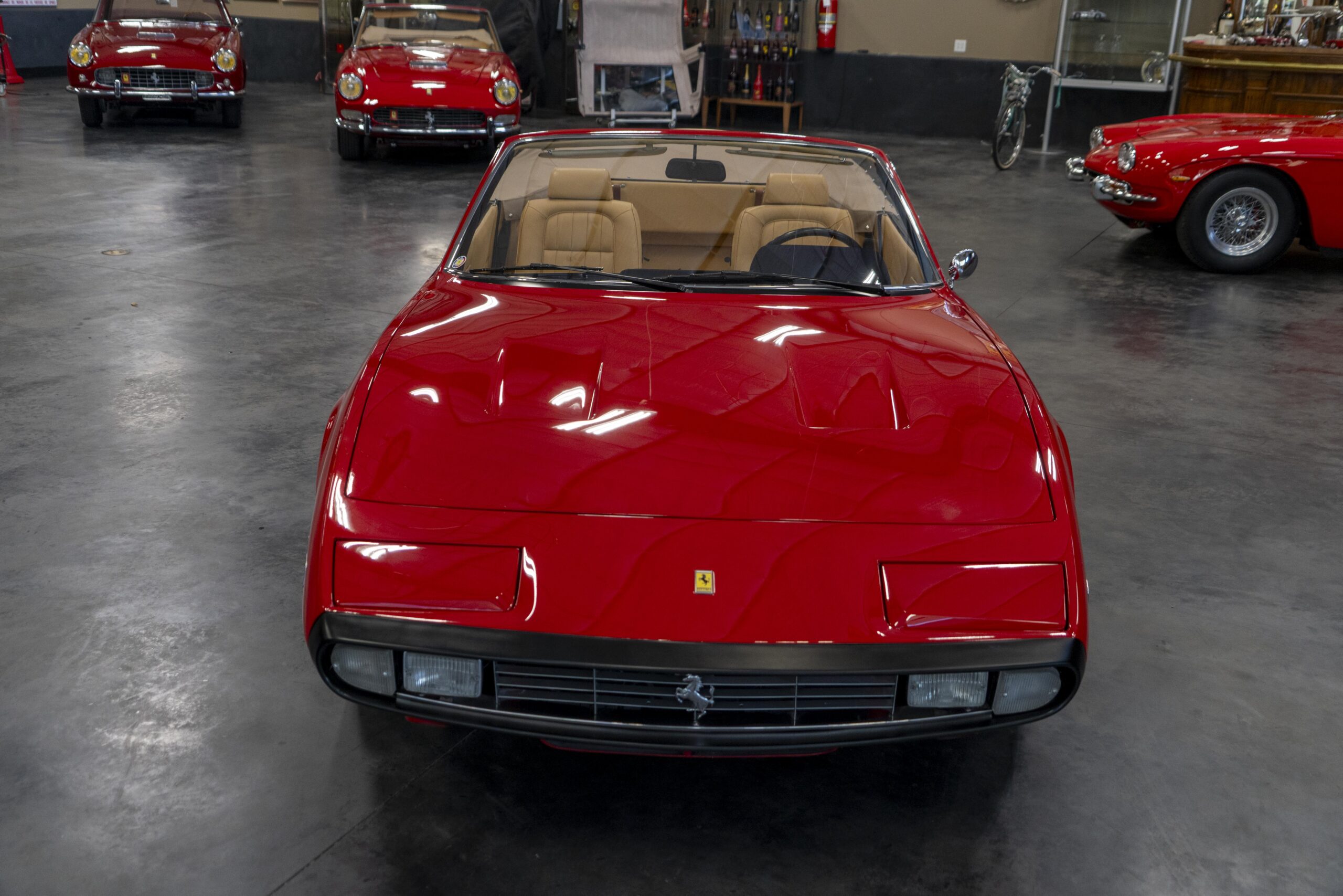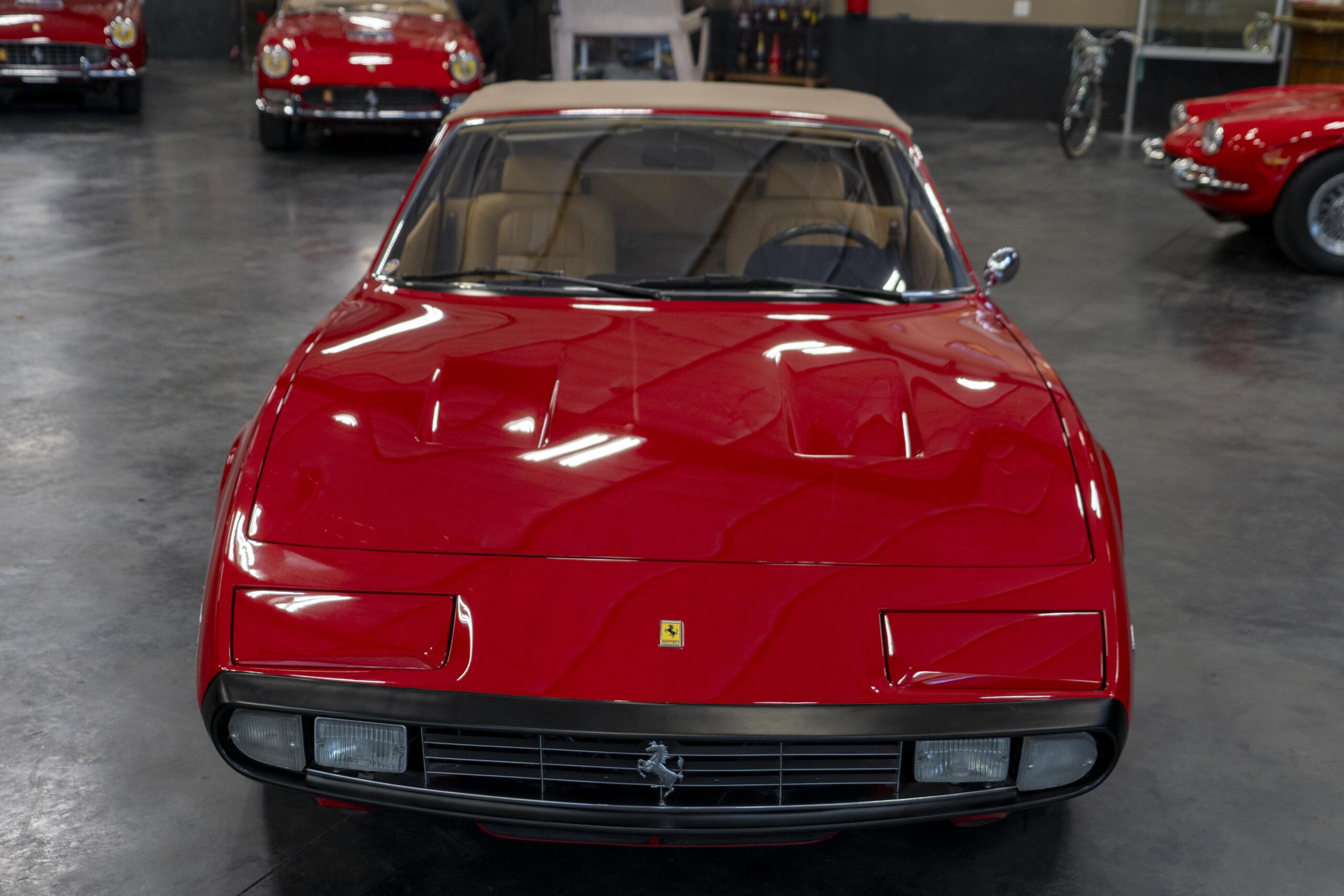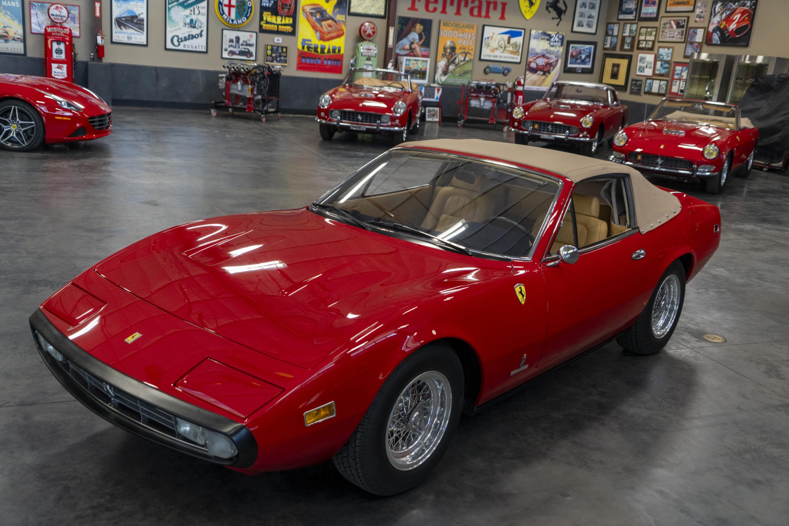 Ferrari 365 GTC/4 Spyder s/n 14745 is gorgeous with the top down, elegant with the top up and striking with the hardtop in place! She sits on an excellent set of 7 1/2″ x 15″ Borrani 4075 wheels with three-eared knockoffs and wears a set of Pirelli Cinturato HS 215/70 R15 tires with a correct 7 1/2″ x 15″ Borrani 4075 spare wheel and tire. 365 GTC/4 s/n 14745 is a Euro model and so doesn’t suffer through the power killing US smog pump, diverter valve, air injection tubing and air mixture tubes on the US models! Even better, because she is pre-1975 production Ferrari, 365 GTC/4 s/n 14745 is smog exempt in California and every other state.Â