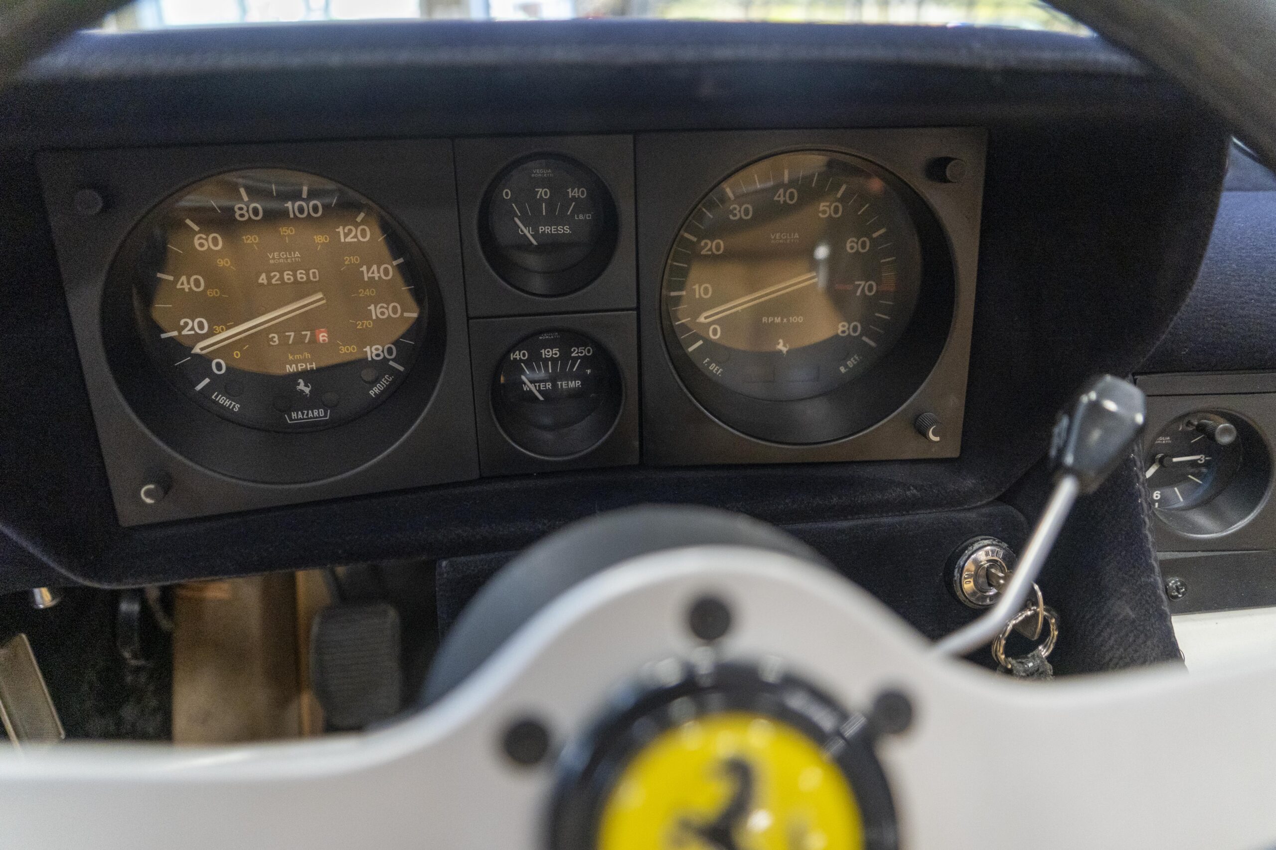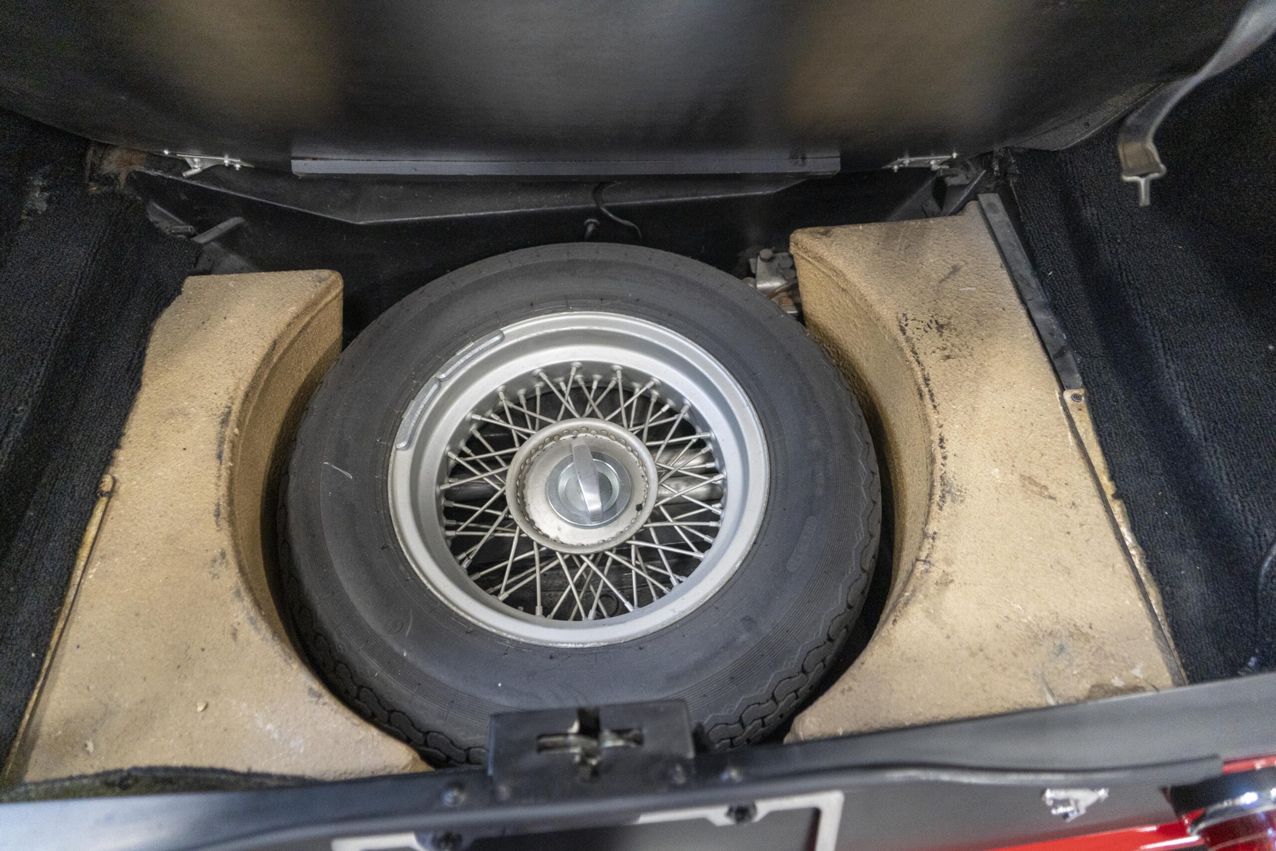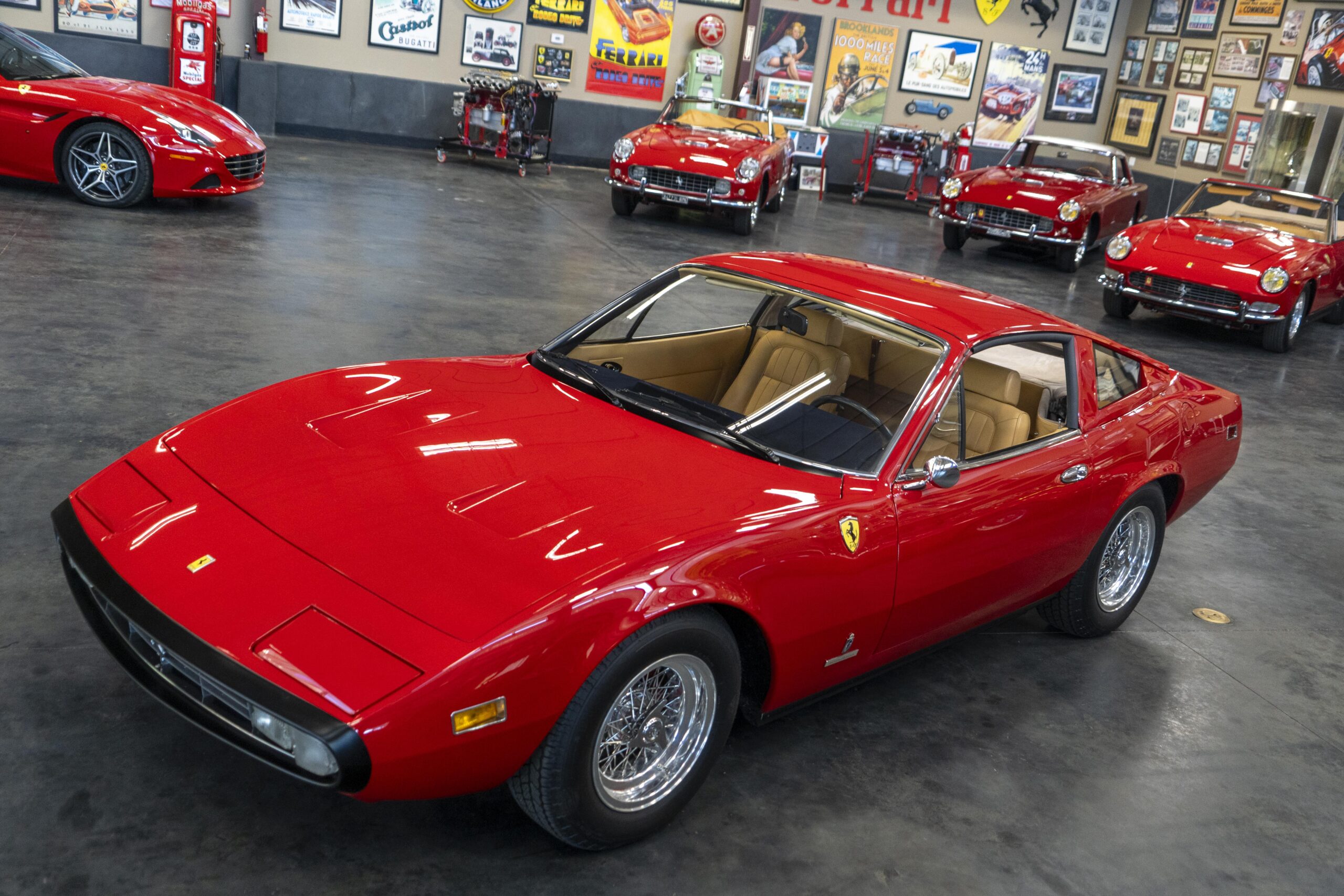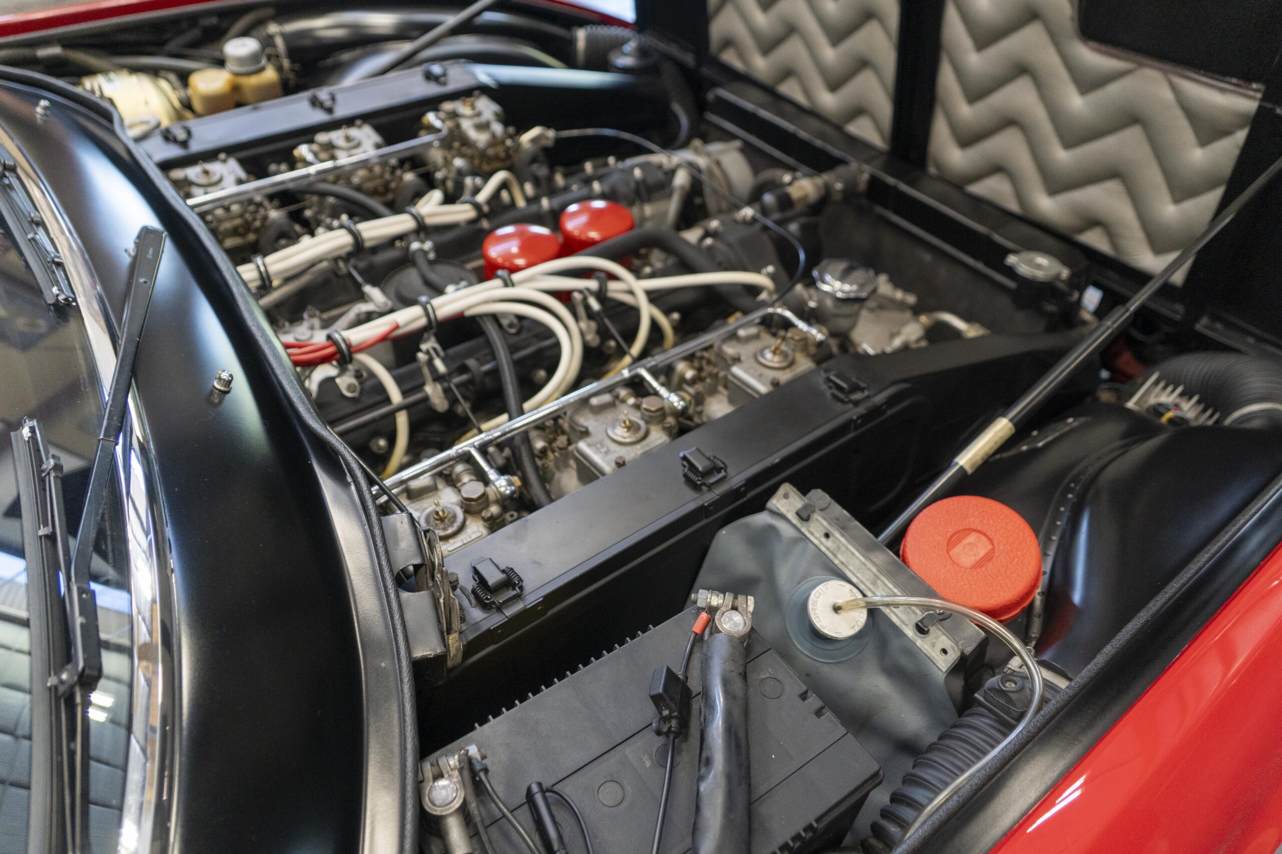 Ferrari 365 GTC/4 Spyder s/n 14745 is gorgeous with the top down, elegant with the top up and striking with the hardtop in place! She sits on an excellent set of 7 1/2″ x 15″ Borrani 4075 wheels with three-eared knockoffs and wears a set of Pirelli Cinturato HS 215/70 R15 tires with a correct 7 1/2″ x 15″ Borrani 4075 spare wheel and tire. 365 GTC/4 s/n 14745 is a Euro model and so doesn’t suffer through the power killing US smog pump, diverter valve, air injection tubing and air mixture tubes on the US models! Even better, because she is pre-1975 production Ferrari, 365 GTC/4 s/n 14745 is smog exempt in California and every other state.Â