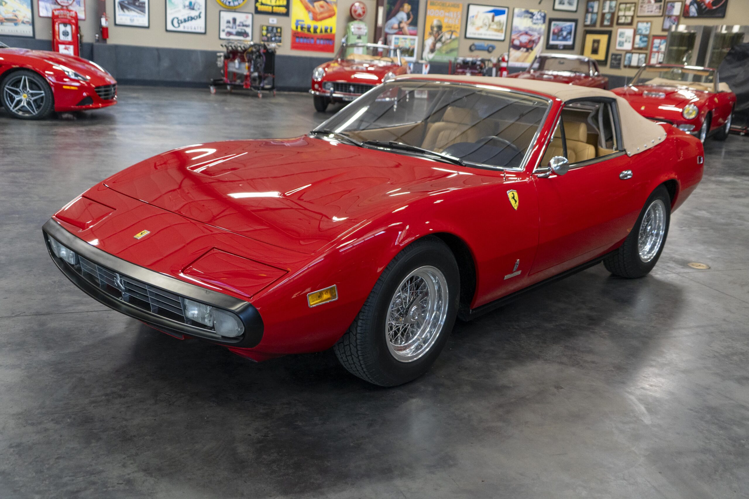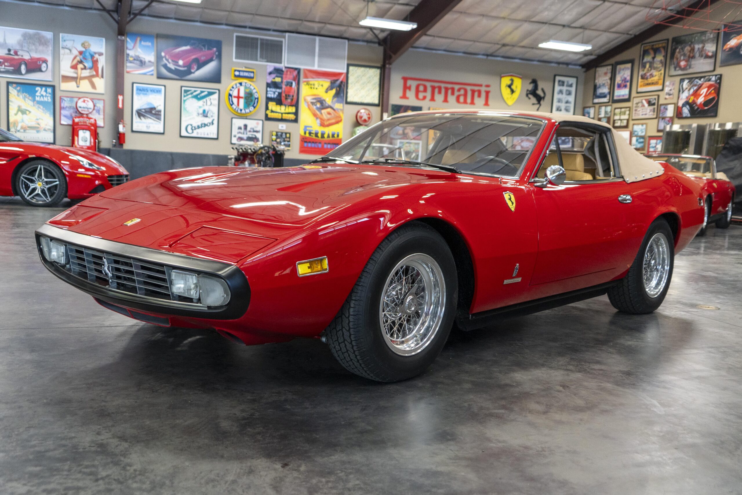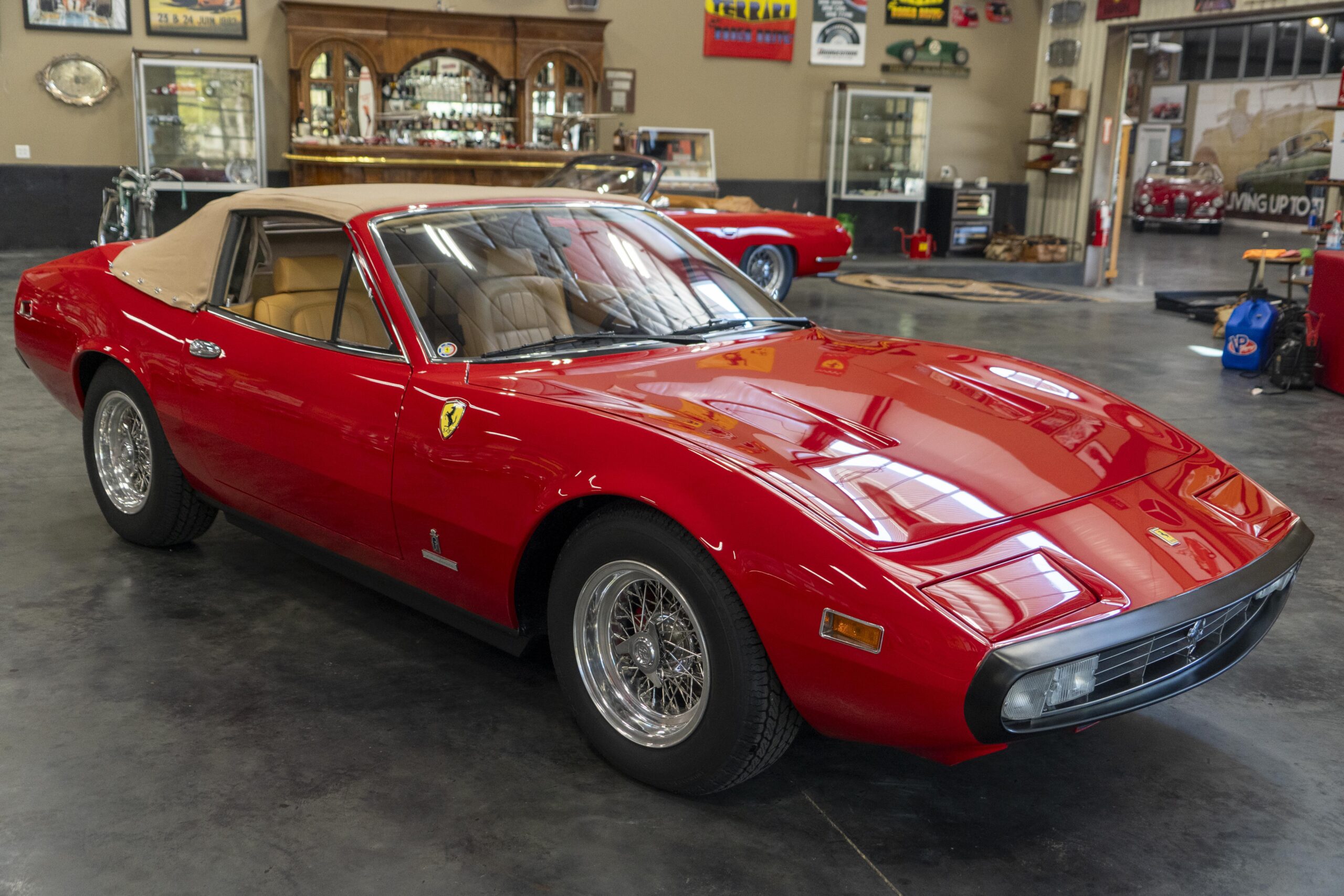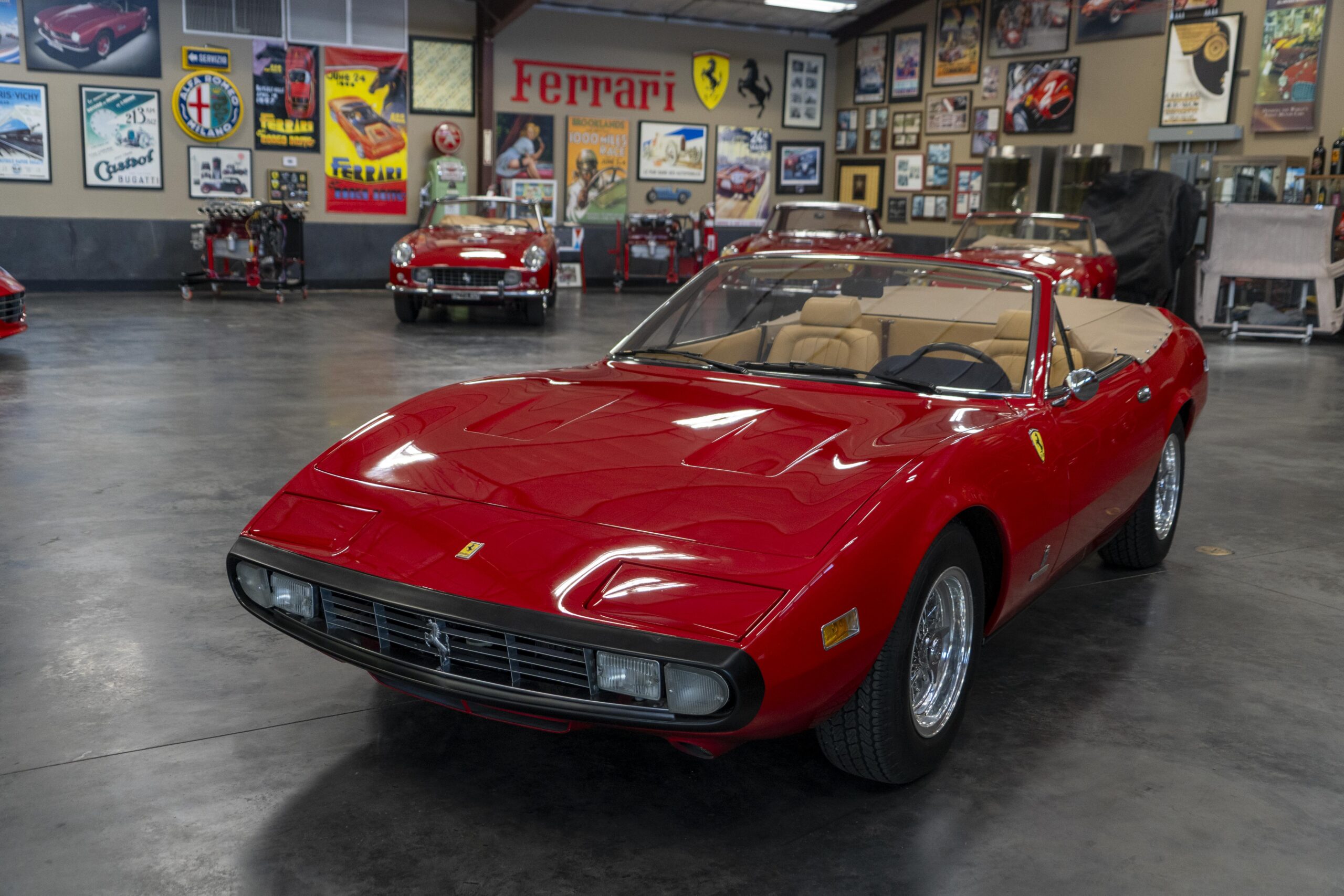 We are pleased to offer 1972 Euro model Ferrari 365 GTC/4 s/n 14745, now a 365 GTC/4 Spyder conversion with both the spyder conversion and a unique one-off lift-off hardtop done by Newport Specialty Cars in Huntington Beach, California. Today 365 GTC/4 s/n 14745 offers top-down driving in a great-looking; great-running; great-driving; great sounding and well-documented 365 GTC/4 that would be an instant stand-out at your local Cars & Coffee meet-up or on a weekend canyon run. Newport Specialty Cars in Huntington Beach are experts in Spyder conversions and they have done several hundred spyder and cabriolet conversions on Ferraris, Lamborghinis, Mercedes and more. Go to www.NewportConvertible.com for their website. In 2024 Ferrari 365 GTC/4 s/n 14745 was shipped to Newport Specialty Cars for both a spyder conversion priced at $79,500.00 and the building of a unique hardtop, priced at another $29,500.00 for a total of $109,000.00 USD! The drop-top is easy to use, going both up and down is a one-man operation, while removing or fitting the hardtop is a two man operation.Â