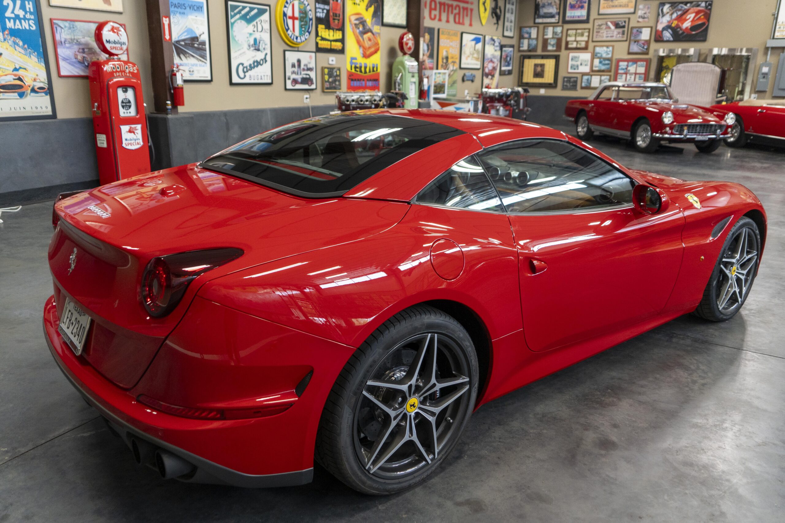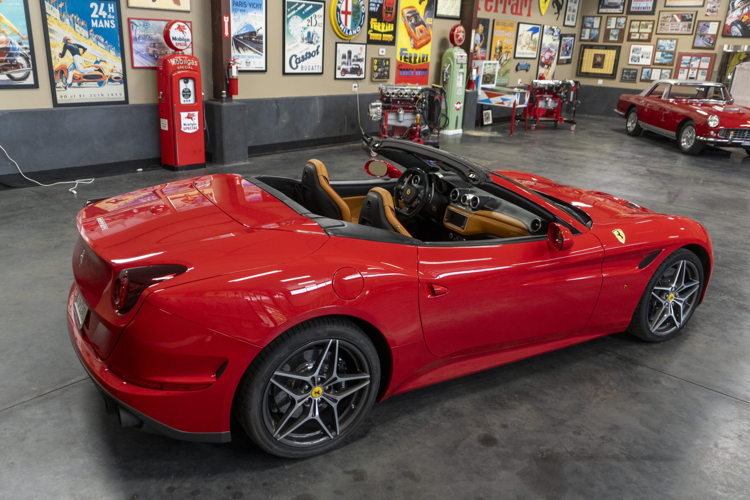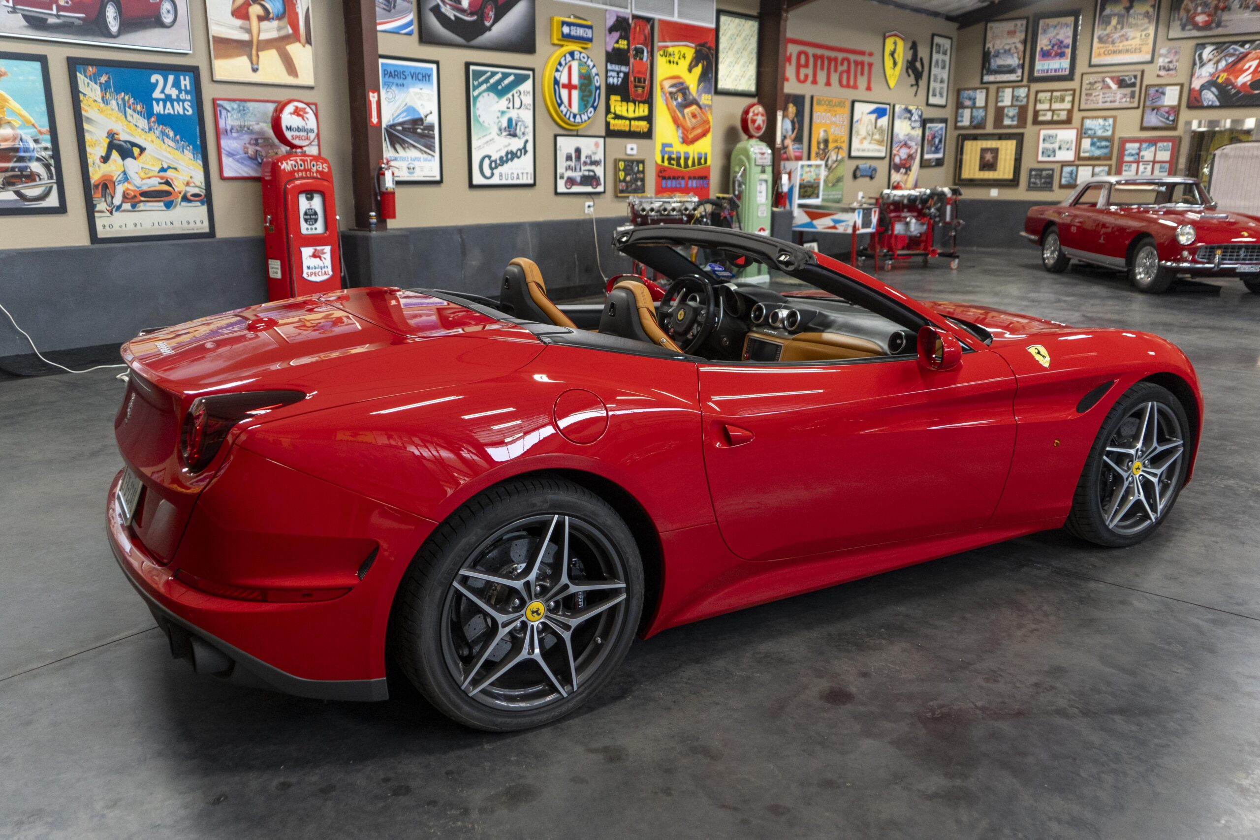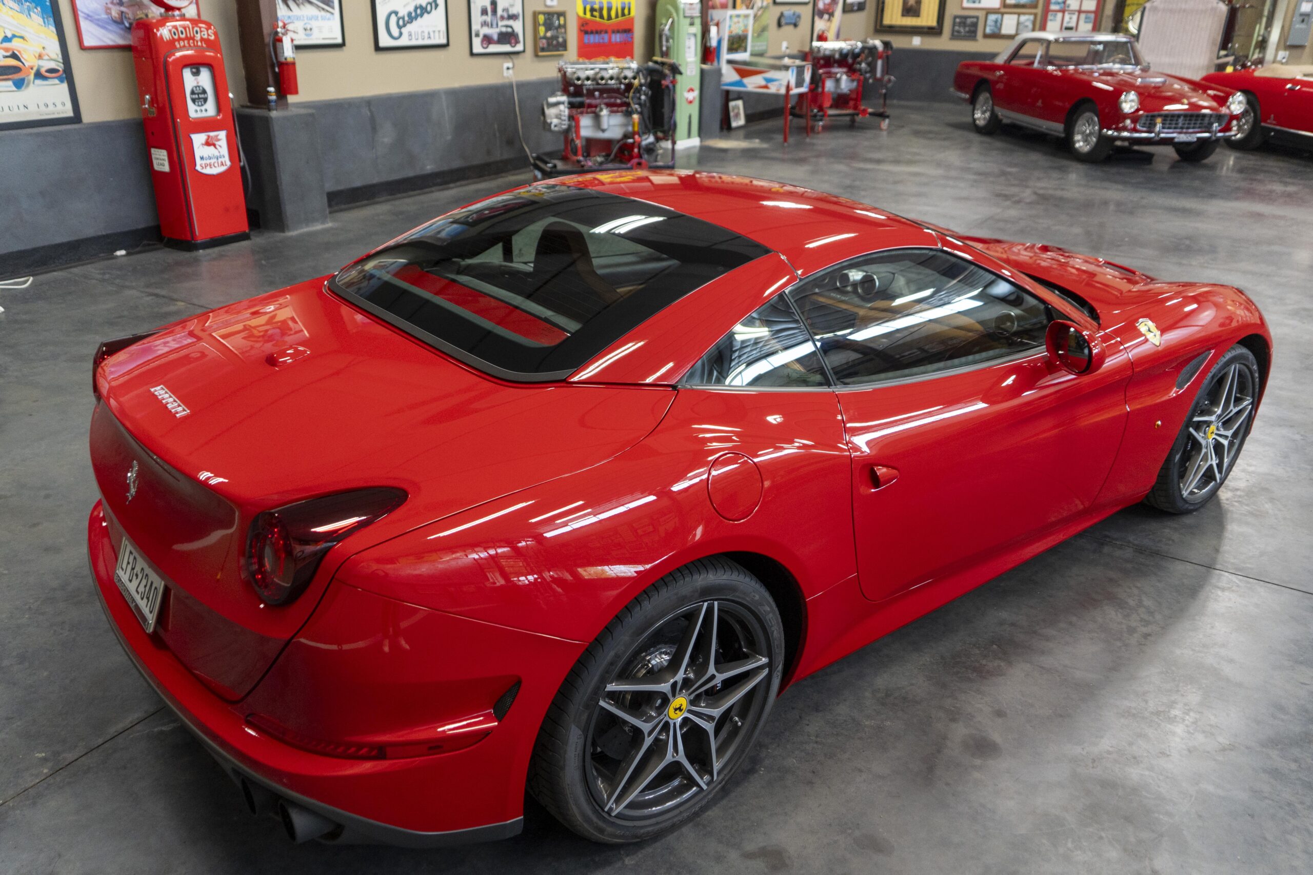 In 2014 the California T (with “T” meaning turbo) was introduced (as a 2015 model) at the Geneva Motor Show as the final evolution of the California, with new front sheet metal influenced by the F12. The grille was enlarged, the headlights were pulled back in the fenders and two broad hood vents were added for engine bay cooling. The most successful changes come at the rear as hiding a folded hardtop without eliminating trunk space was always going to make for a rather matronly rump, but by lowering the trunk lip fractionally and employing visual tricks like orienting the tailpipes horizontally instead of vertically and enlarging the diffuser, Ferrari created the impression of a much lower, wider car. A new interior featured an updated dash and very comfortable form fitting, leather-clad seats, making for low wind and tire noise levels. An all-new 3,855 cc twin turbocharged flat plane crankshaft V8 with a maximum boost of 18.9 psi produced 553 hp at 7,500 rpm, good enough for a top speed of 196 mph! It is interesting to note that Ferrari didn’t turbocharge the Cal T merely to increase power; it also did so to reduce emissions and improve efficiency. In addition, higher gearing inside the Cal T’s seven-speed dual-clutch gearbox improves fuel economy by about 15 percent. Even better, the optional Magneride Dual Mode Suspension package offers great handling, excellent balance, a much improved exhaust sound and new gearbox software, while the carbon-ceramic brakes haul it down from any speed with ferocity!