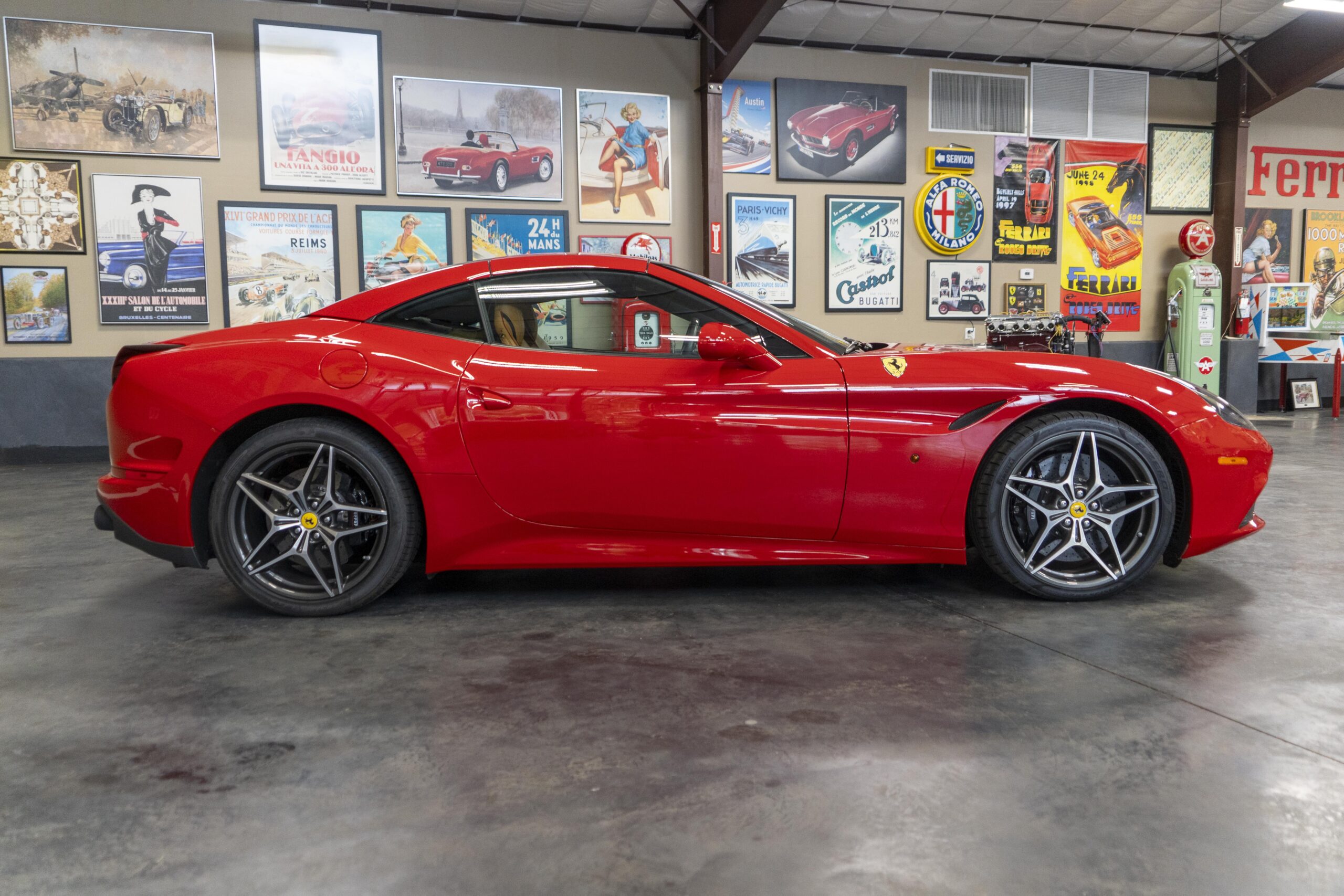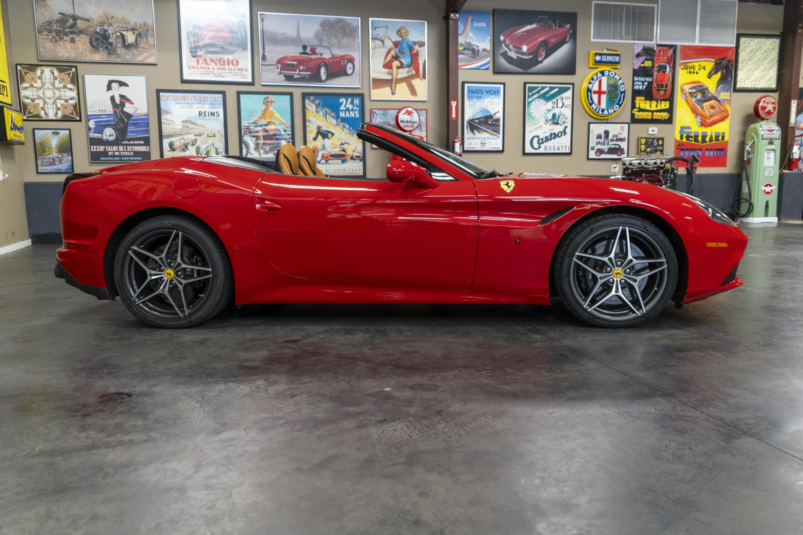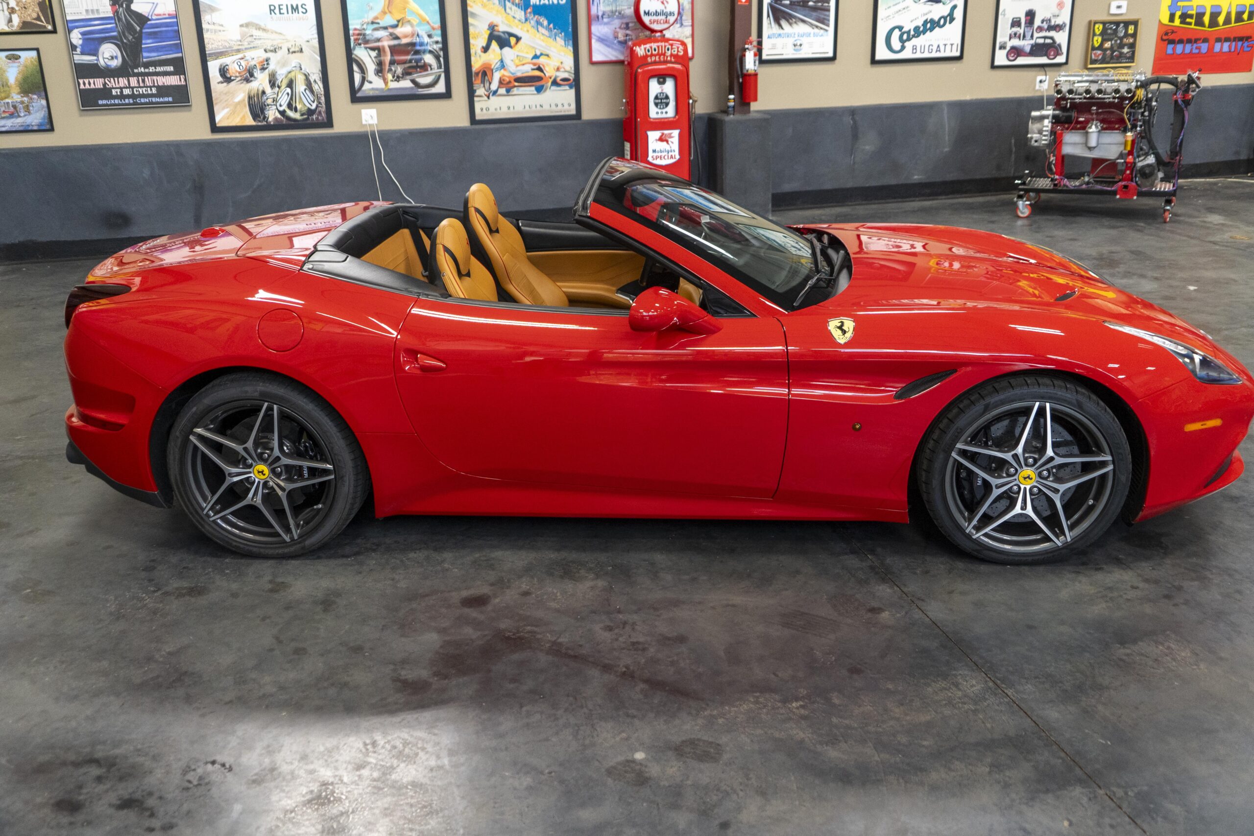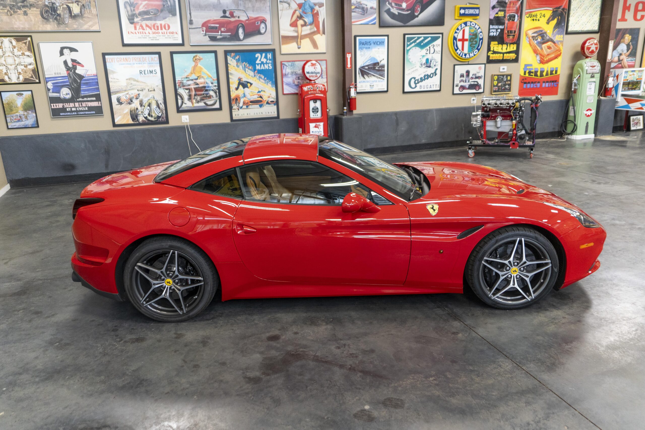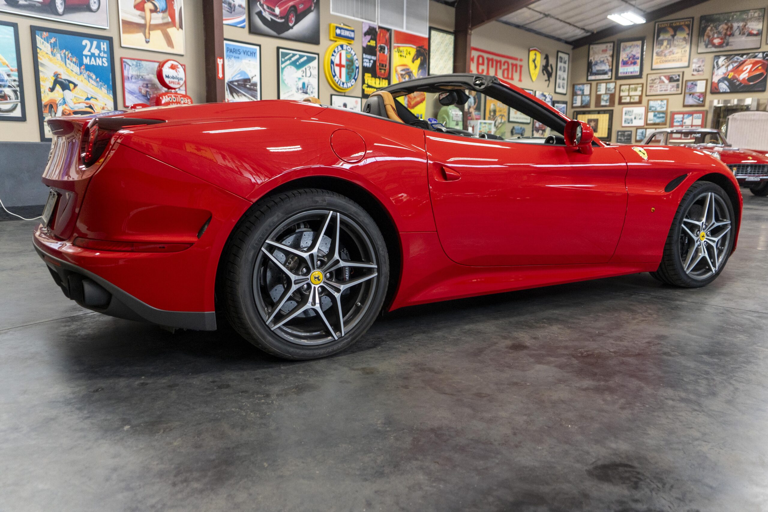 In 2014 the California T (with “T” meaning turbo) was introduced (as a 2015 model) at the Geneva Motor Show as the final evolution of the California, with new front sheet metal influenced by the F12. The grille was enlarged, the headlights were pulled back in the fenders and two broad hood vents were added for engine bay cooling. The most successful changes come at the rear as hiding a folded hardtop without eliminating trunk space was always going to make for a rather matronly rump, but by lowering the trunk lip fractionally and employing visual tricks like orienting the tailpipes horizontally instead of vertically and enlarging the diffuser, Ferrari created the impression of a much lower, wider car. A new interior featured an updated dash and very comfortable form fitting, leather-clad seats, making for low wind and tire noise levels. An all-new 3,855 cc twin turbocharged flat plane crankshaft V8 with a maximum boost of 18.9 psi produced 553 hp at 7,500 rpm, good enough for a top speed of 196 mph! It is interesting to note that Ferrari didn’t turbocharge the Cal T merely to increase power; it also did so to reduce emissions and improve efficiency. In addition, higher gearing inside the Cal T’s seven-speed dual-clutch gearbox improves fuel economy by about 15 percent. Even better, the optional Magneride Dual Mode Suspension package offers great handling, excellent balance, a much improved exhaust sound and new gearbox software, while the carbon-ceramic brakes haul it down from any speed with ferocity!