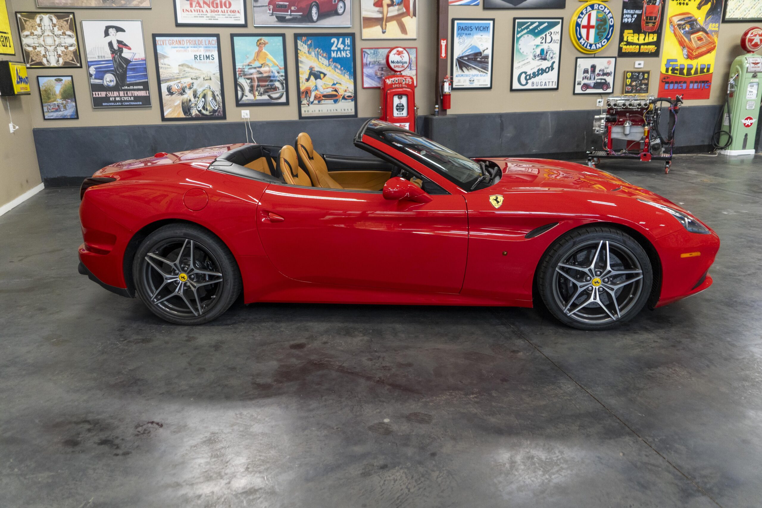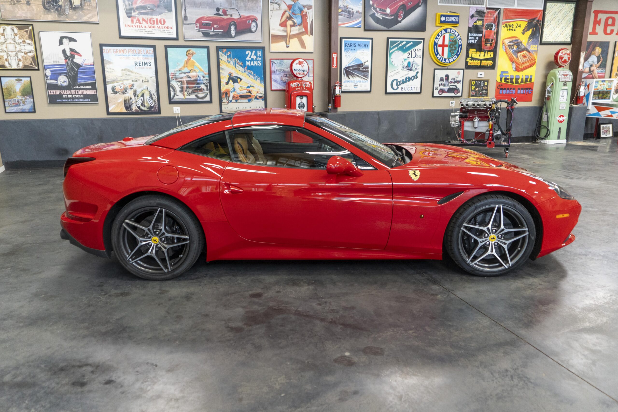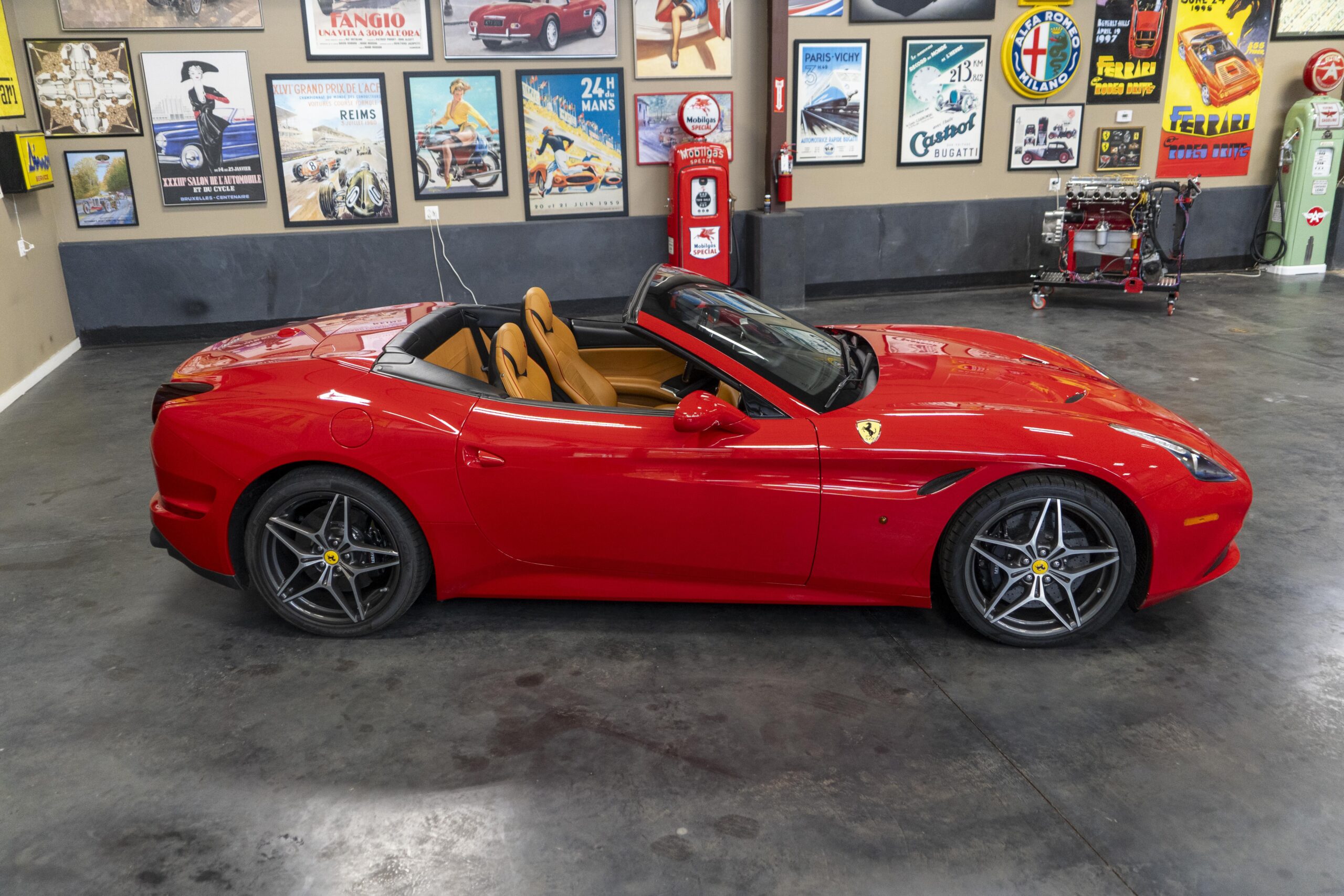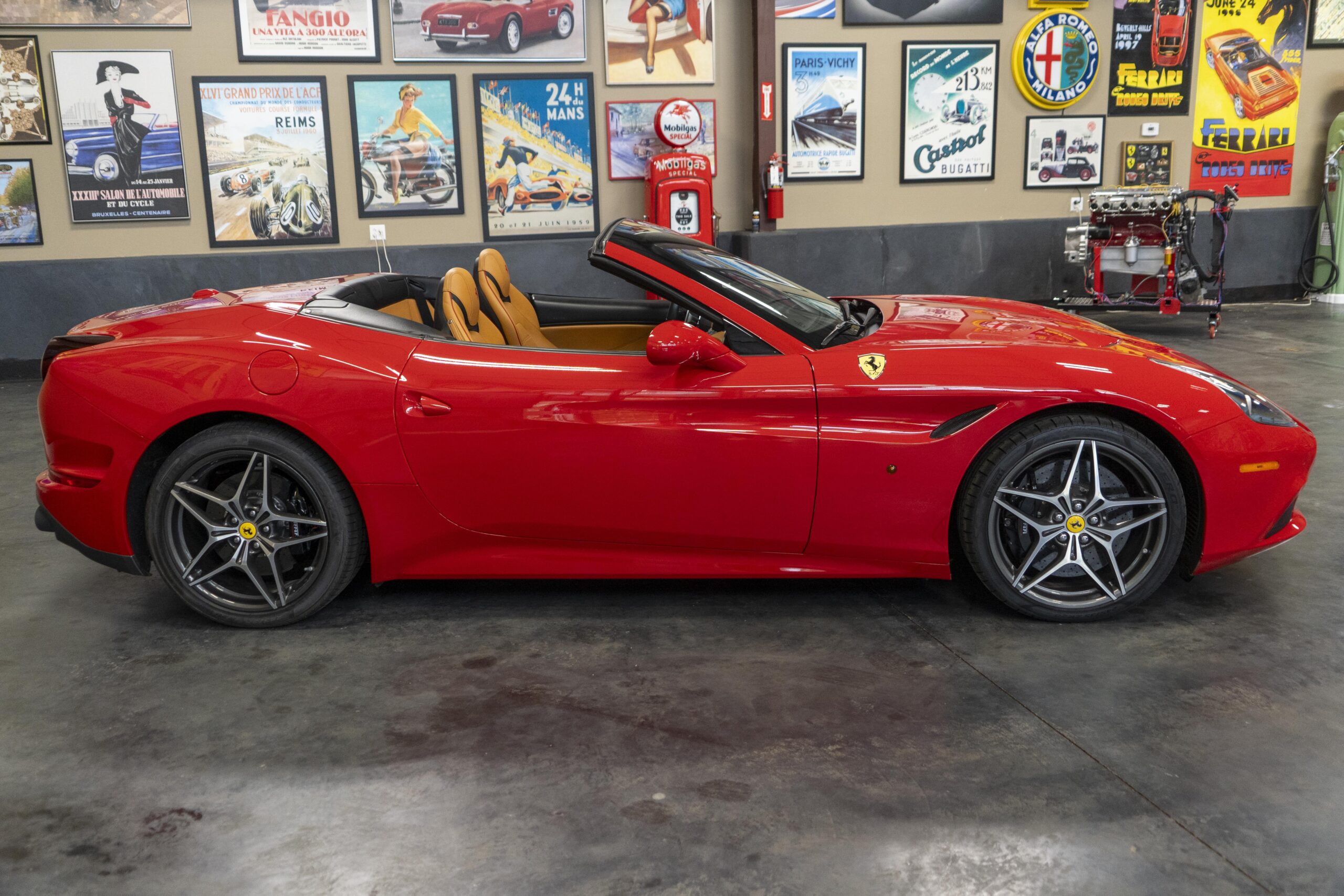 In 2014 the California T (with “T” meaning turbo) was introduced (as a 2015 model) at the Geneva Motor Show as the final evolution of the California, with new front sheet metal influenced by the F12. The grille was enlarged, the headlights were pulled back in the fenders and two broad hood vents were added for engine bay cooling. The most successful changes come at the rear as hiding a folded hardtop without eliminating trunk space was always going to make for a rather matronly rump, but by lowering the trunk lip fractionally and employing visual tricks like orienting the tailpipes horizontally instead of vertically and enlarging the diffuser, Ferrari created the impression of a much lower, wider car. A new interior featured an updated dash and very comfortable form fitting, leather-clad seats, making for low wind and tire noise levels. An all-new 3,855 cc twin turbocharged flat plane crankshaft V8 with a maximum boost of 18.9 psi produced 553 hp at 7,500 rpm, good enough for a top speed of 196 mph! It is interesting to note that Ferrari didn’t turbocharge the Cal T merely to increase power; it also did so to reduce emissions and improve efficiency. In addition, higher gearing inside the Cal T’s seven-speed dual-clutch gearbox improves fuel economy by about 15 percent. Even better, the optional Magneride Dual Mode Suspension package offers great handling, excellent balance, a much improved exhaust sound and new gearbox software, while the carbon-ceramic brakes haul it down from any speed with ferocity!