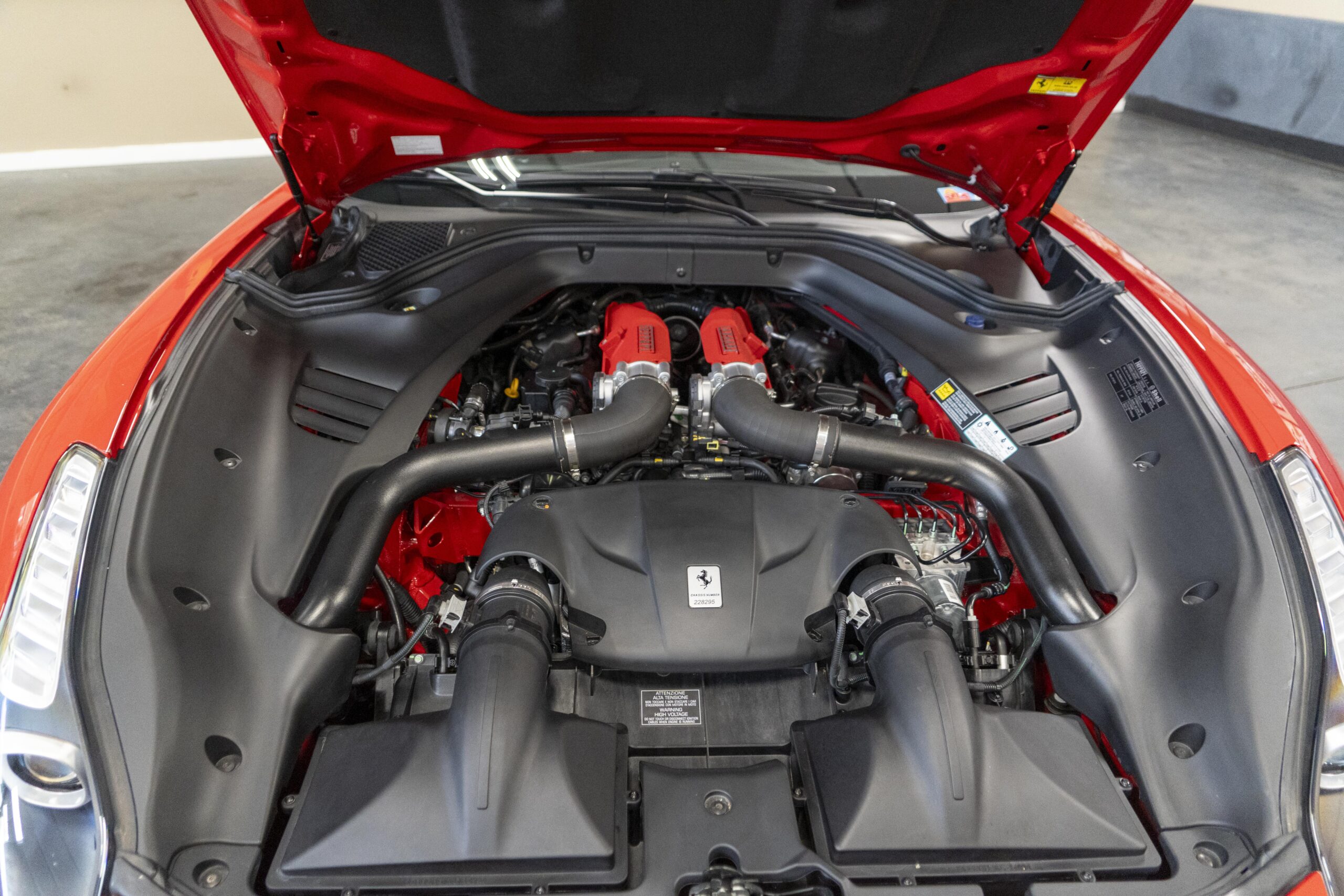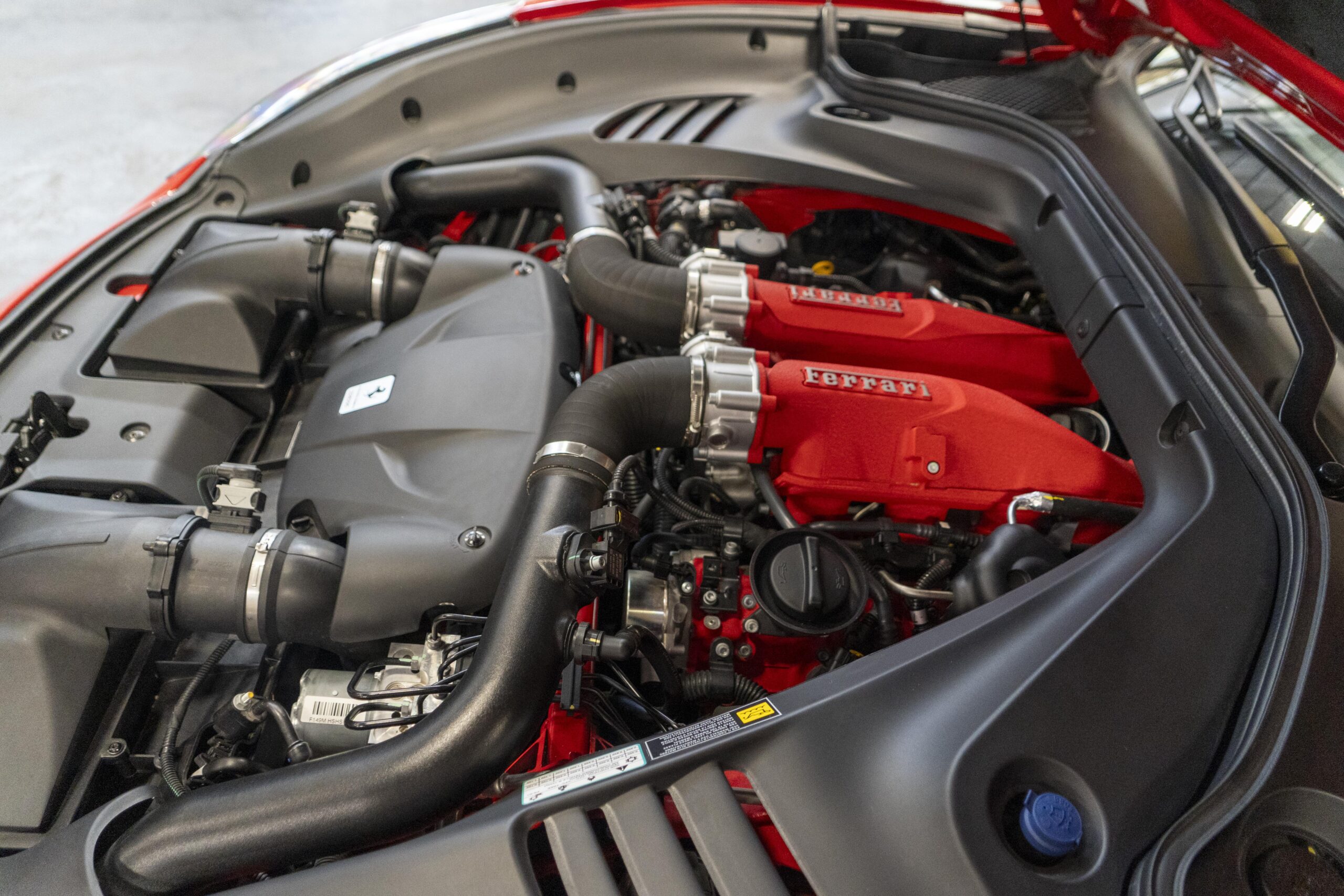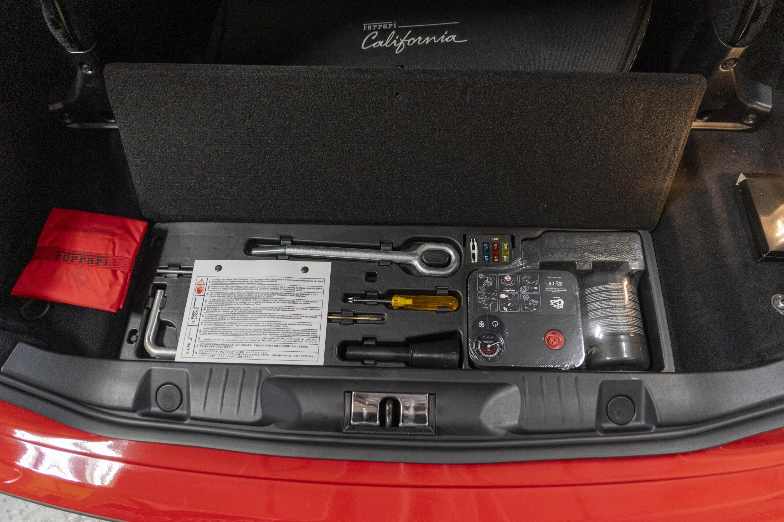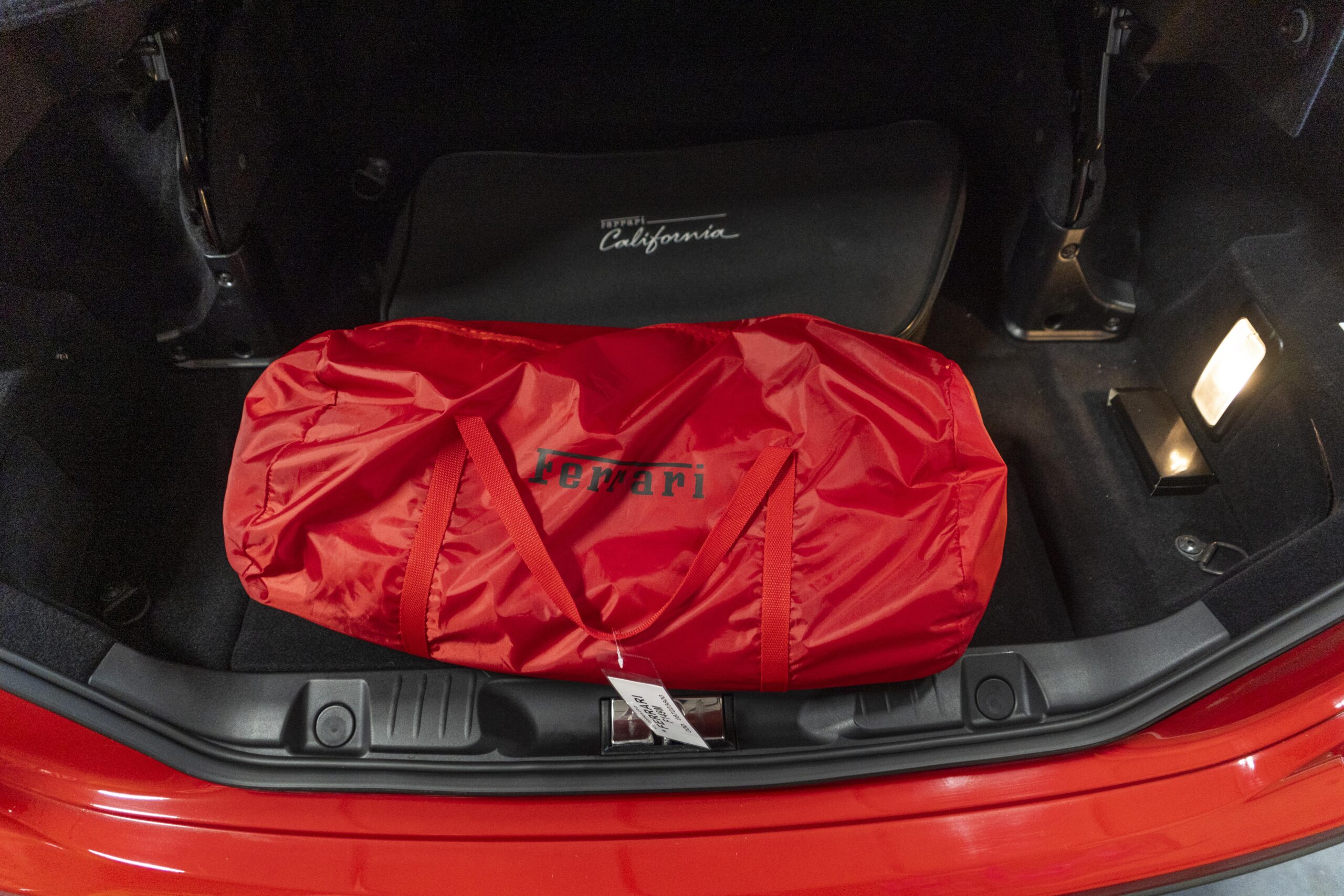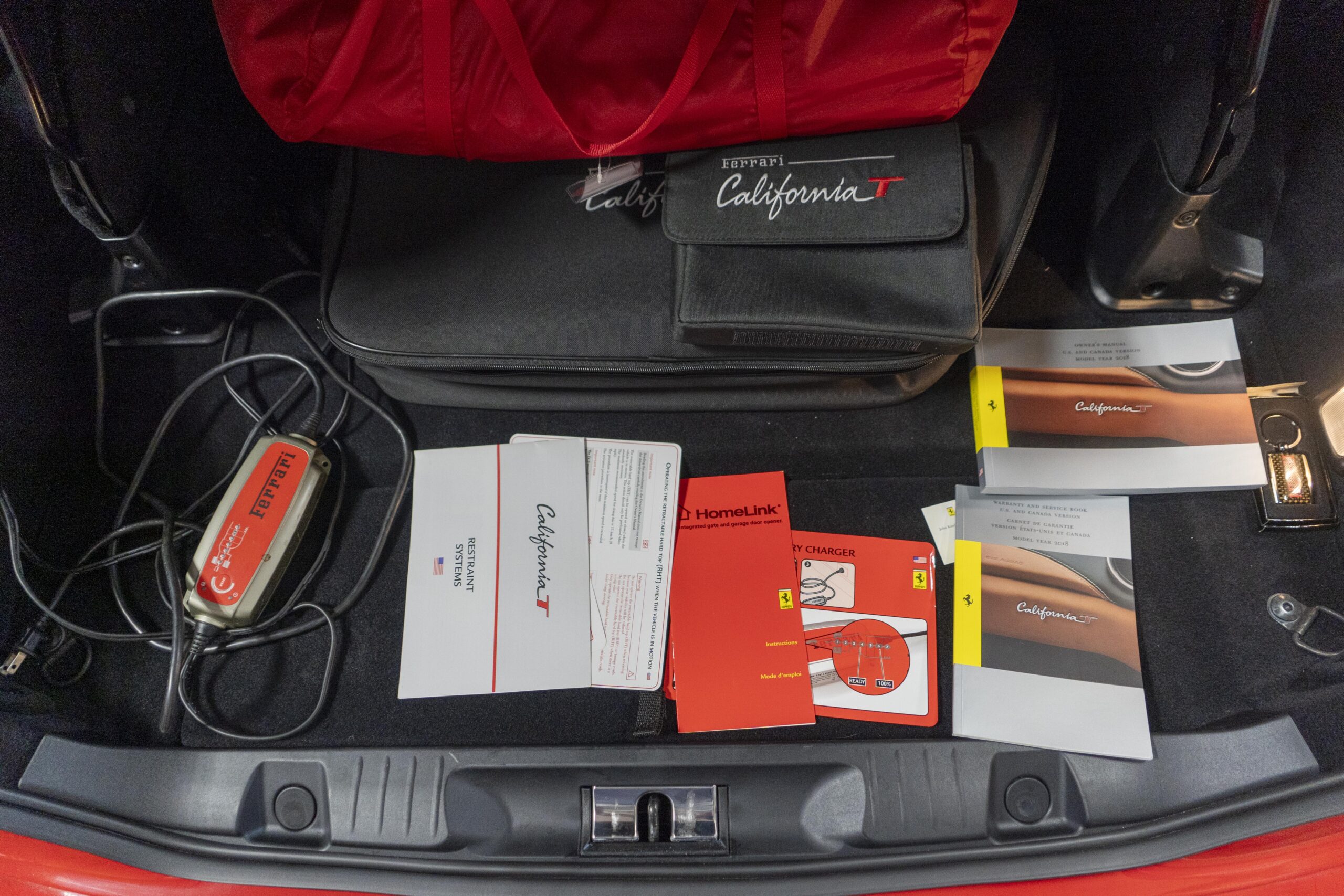 2018 California T s/n 228295 was sold new by Boardwalk Ferrari in Plano, Texas and, as a low mileage one-owner car, has lived in Texas since new. Watching the power top in action, going from down-to-up or vice-versa, in a mere 14 seconds, is a show unto itself! She comes with all the goodies including two keys; the owner’s manual in it’s pouch; the full tool set in its case; the air compressor; the battery tender and the red Factory car cover in its carrying bag. It even has the Factory white gloves, in their small red bag, should a tire change be necessary! An interesting feature of the “T” is a circular digital boost gauge, mounted between the dashboards circular air vents, which monitors the turbo boost, turbo response and turbo efficiency. It is essentially a glorified clock, but it’s great fun to watch in action.