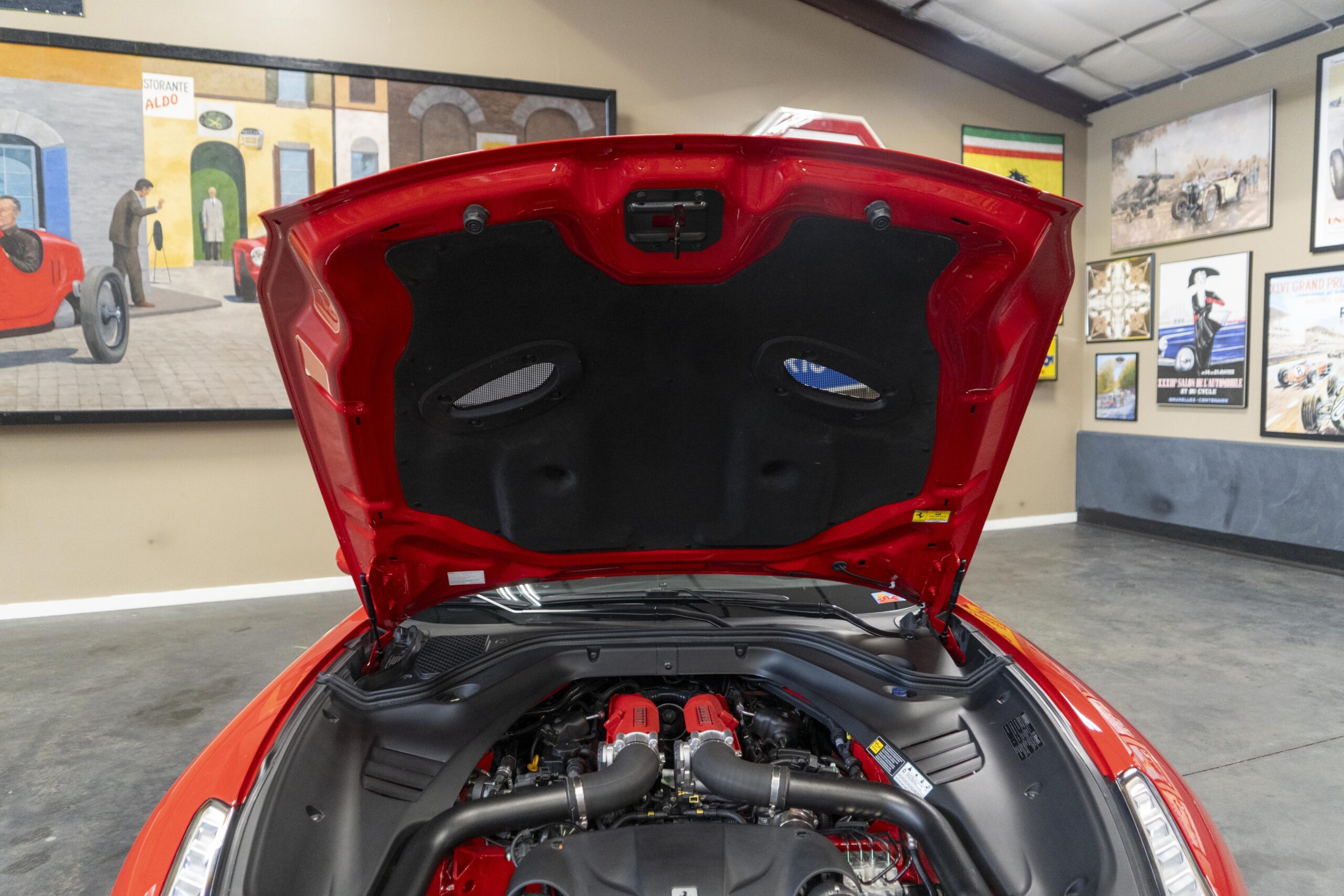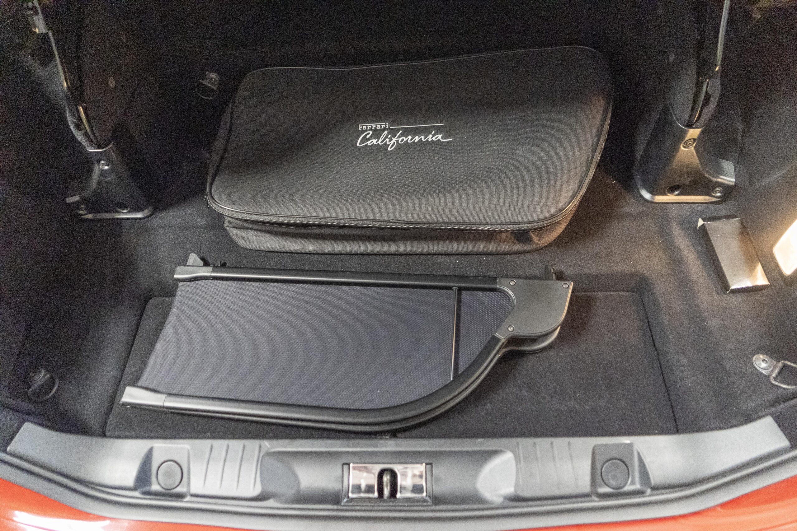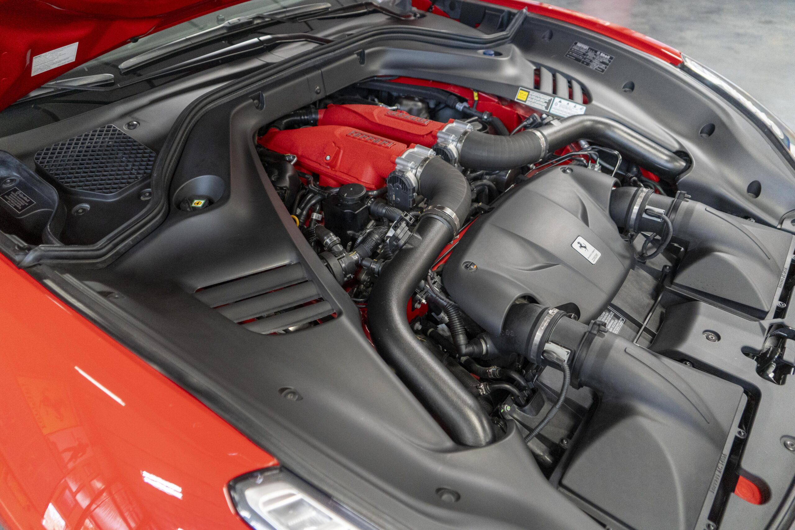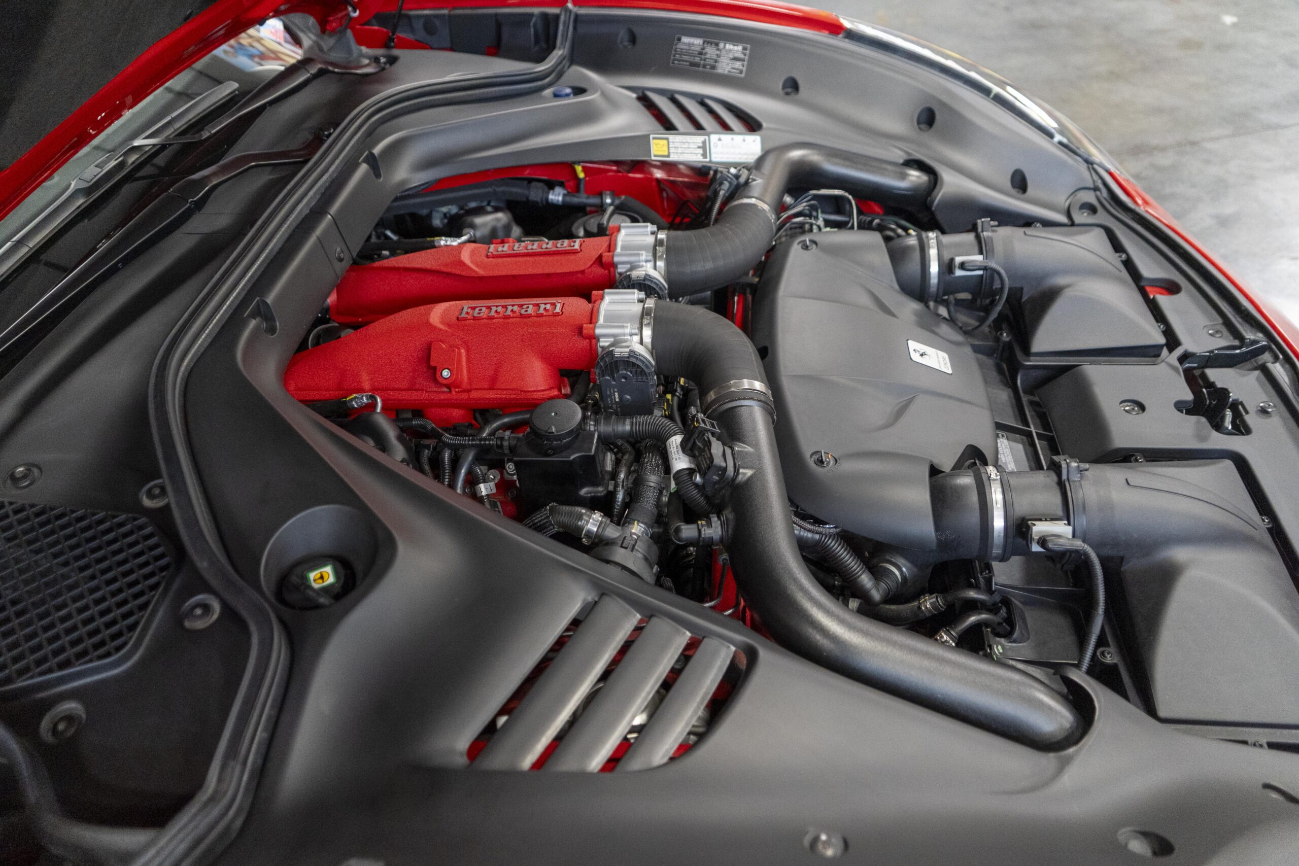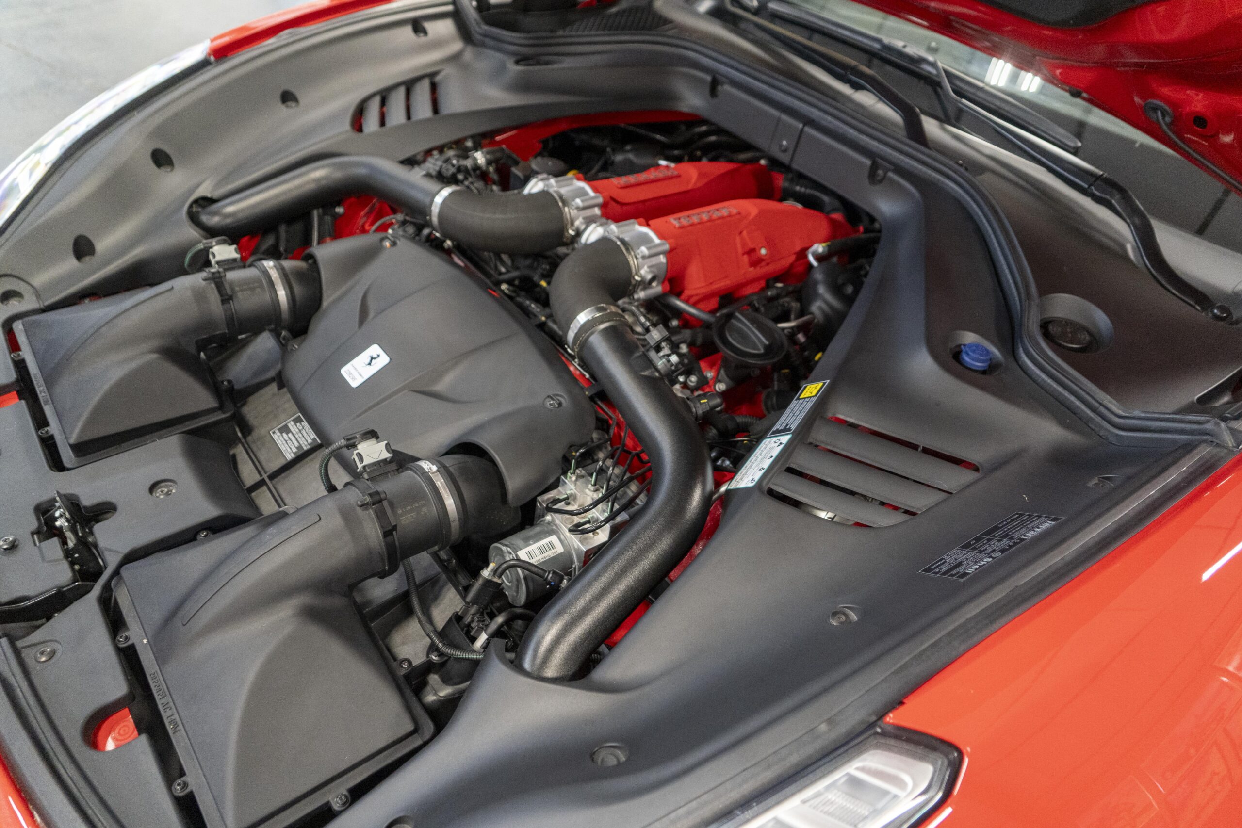 2018 California T s/n 228295 was sold new by Boardwalk Ferrari in Plano, Texas and, as a low mileage one-owner car, has lived in Texas since new. Watching the power top in action, going from down-to-up or vice-versa, in a mere 14 seconds, is a show unto itself! She comes with all the goodies including two keys; the owner’s manual in it’s pouch; the full tool set in its case; the air compressor; the battery tender and the red Factory car cover in its carrying bag. It even has the Factory white gloves, in their small red bag, should a tire change be necessary! An interesting feature of the “T” is a circular digital boost gauge, mounted between the dashboards circular air vents, which monitors the turbo boost, turbo response and turbo efficiency. It is essentially a glorified clock, but it’s great fun to watch in action.