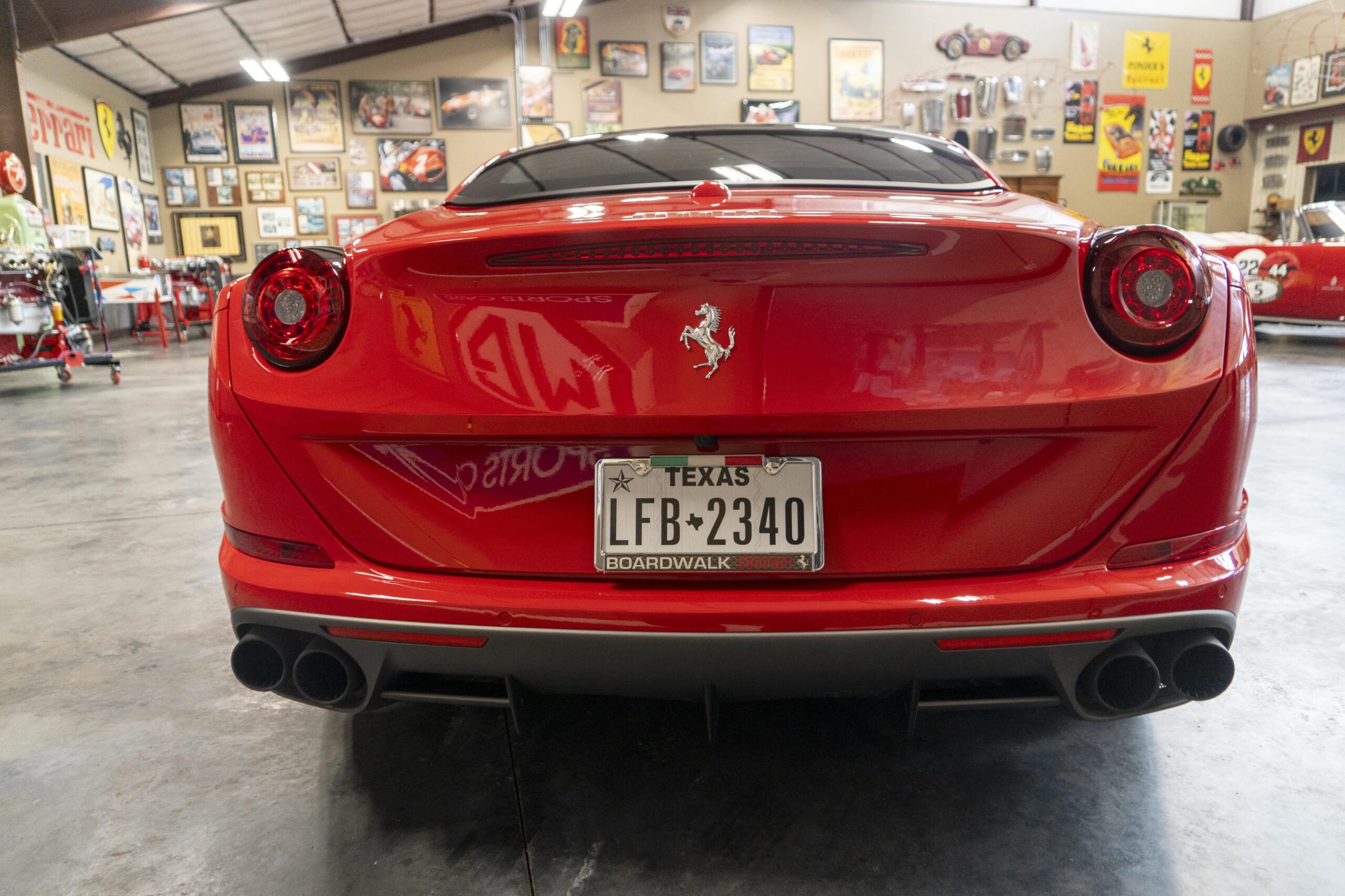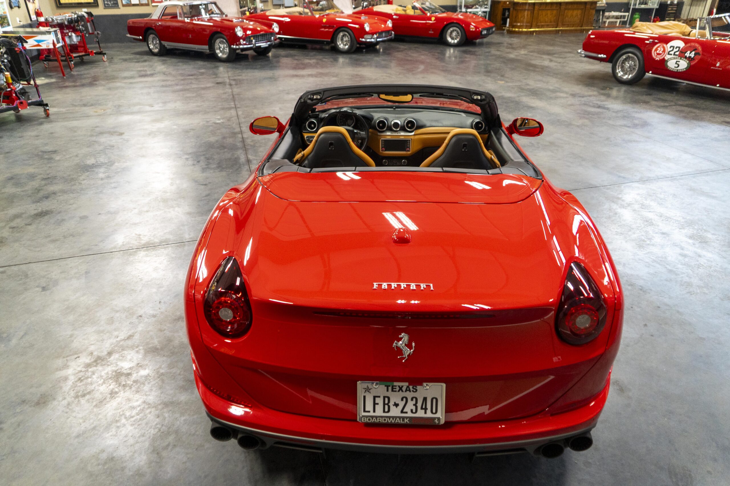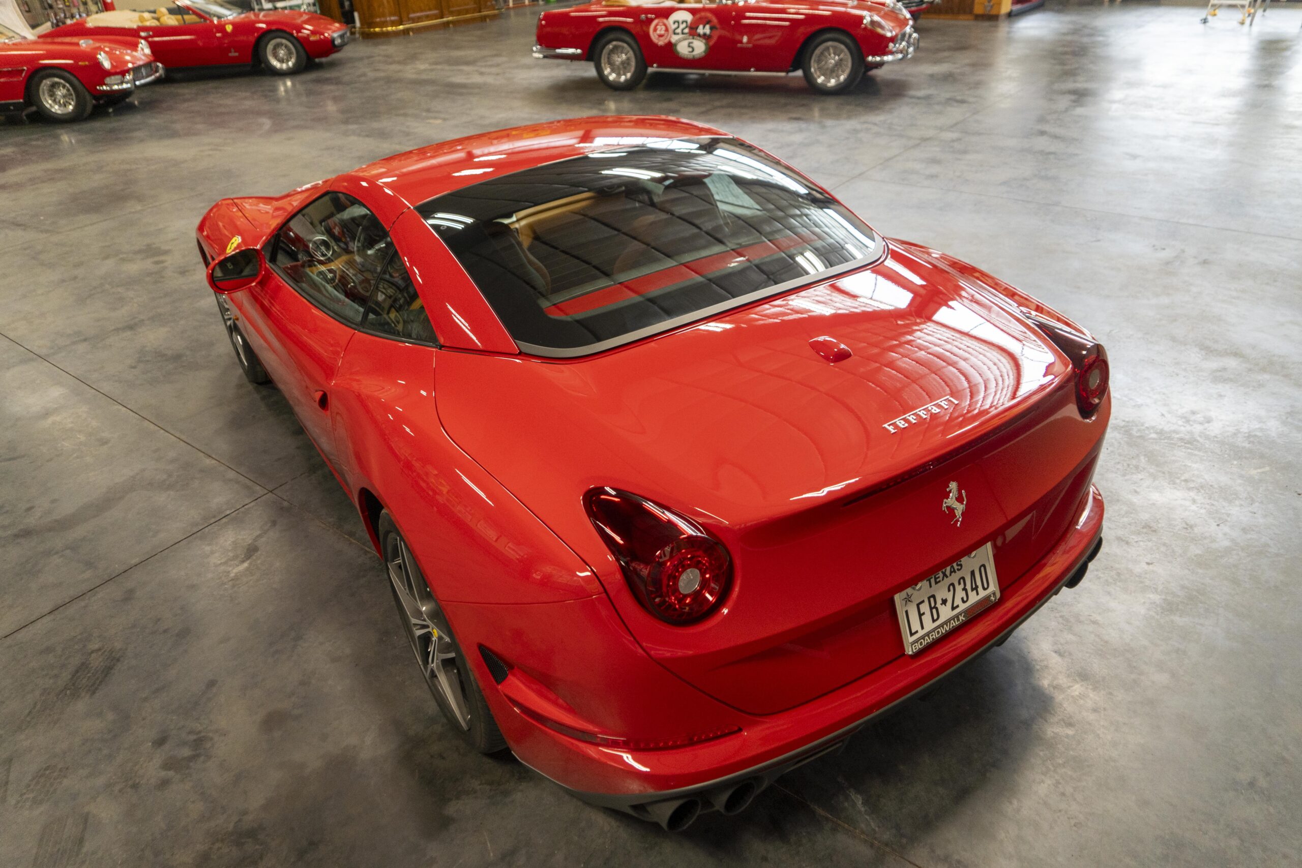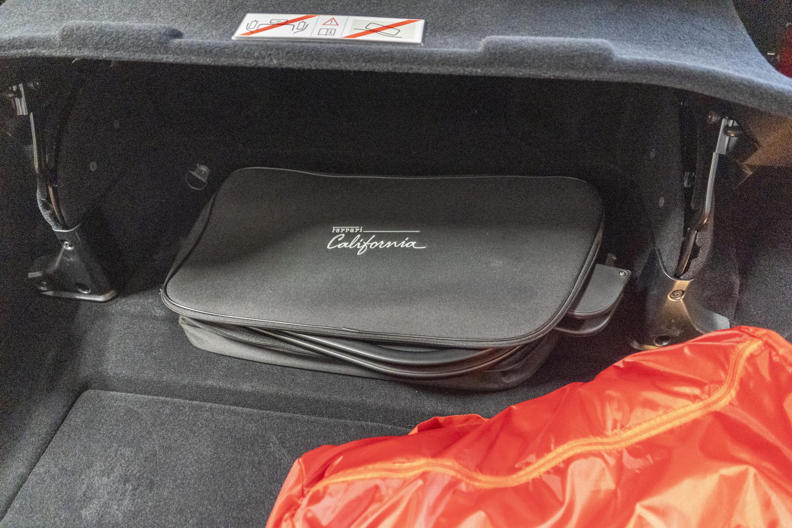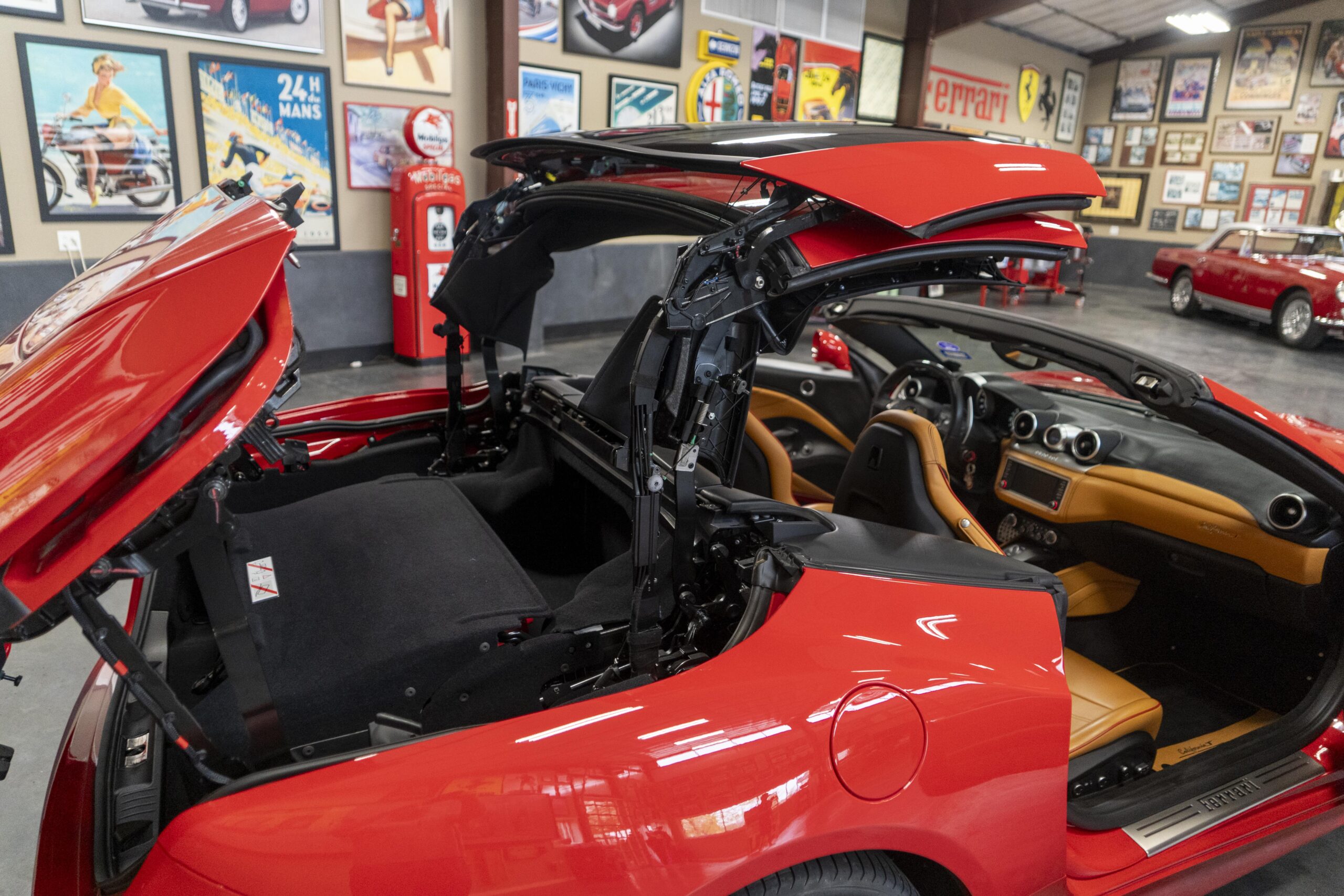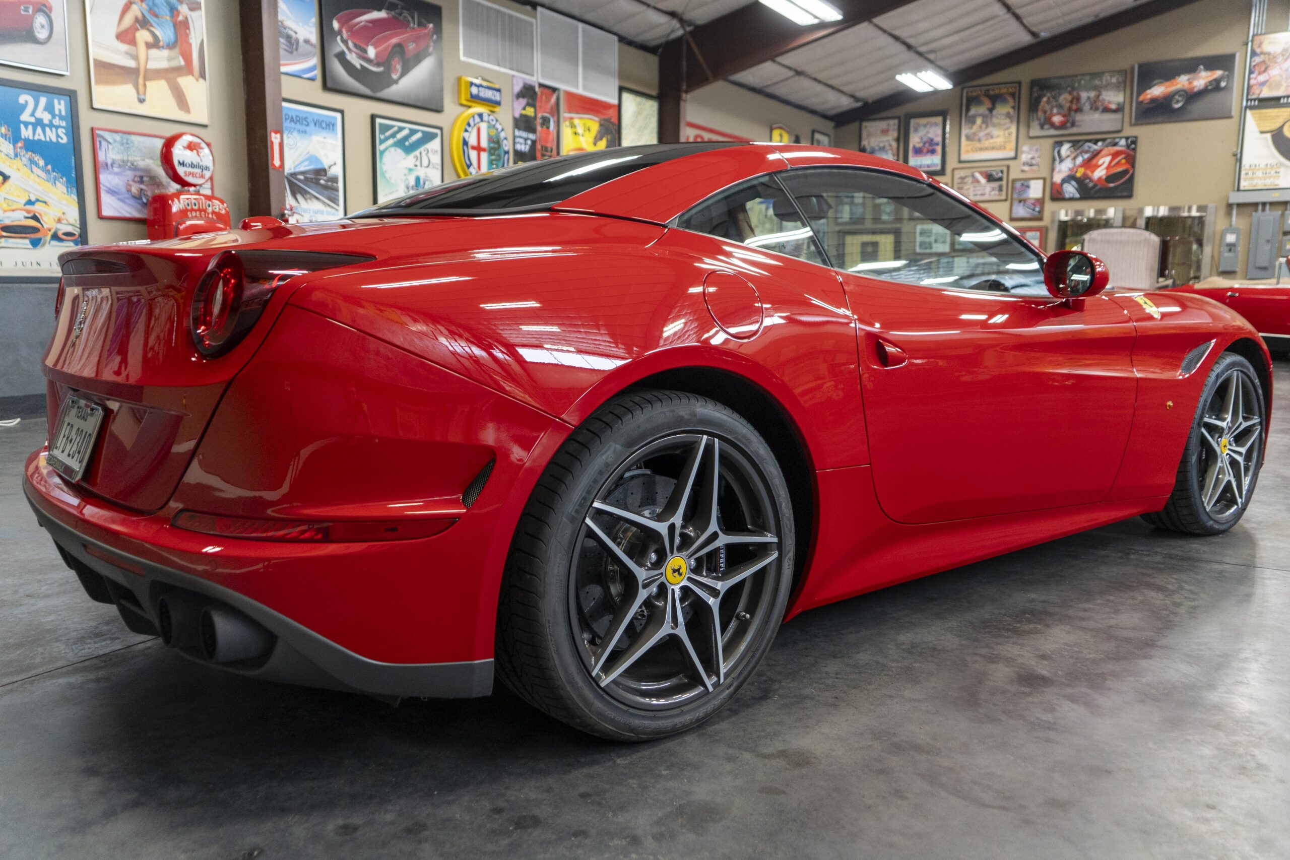 2018 California T s/n 228295 was sold new by Boardwalk Ferrari in Plano, Texas and, as a low mileage one-owner car, has lived in Texas since new. Watching the power top in action, going from down-to-up or vice-versa, in a mere 14 seconds, is a show unto itself! She comes with all the goodies including two keys; the owner’s manual in it’s pouch; the full tool set in its case; the air compressor; the battery tender and the red Factory car cover in its carrying bag. It even has the Factory white gloves, in their small red bag, should a tire change be necessary! An interesting feature of the “T” is a circular digital boost gauge, mounted between the dashboards circular air vents, which monitors the turbo boost, turbo response and turbo efficiency. It is essentially a glorified clock, but it’s great fun to watch in action.
