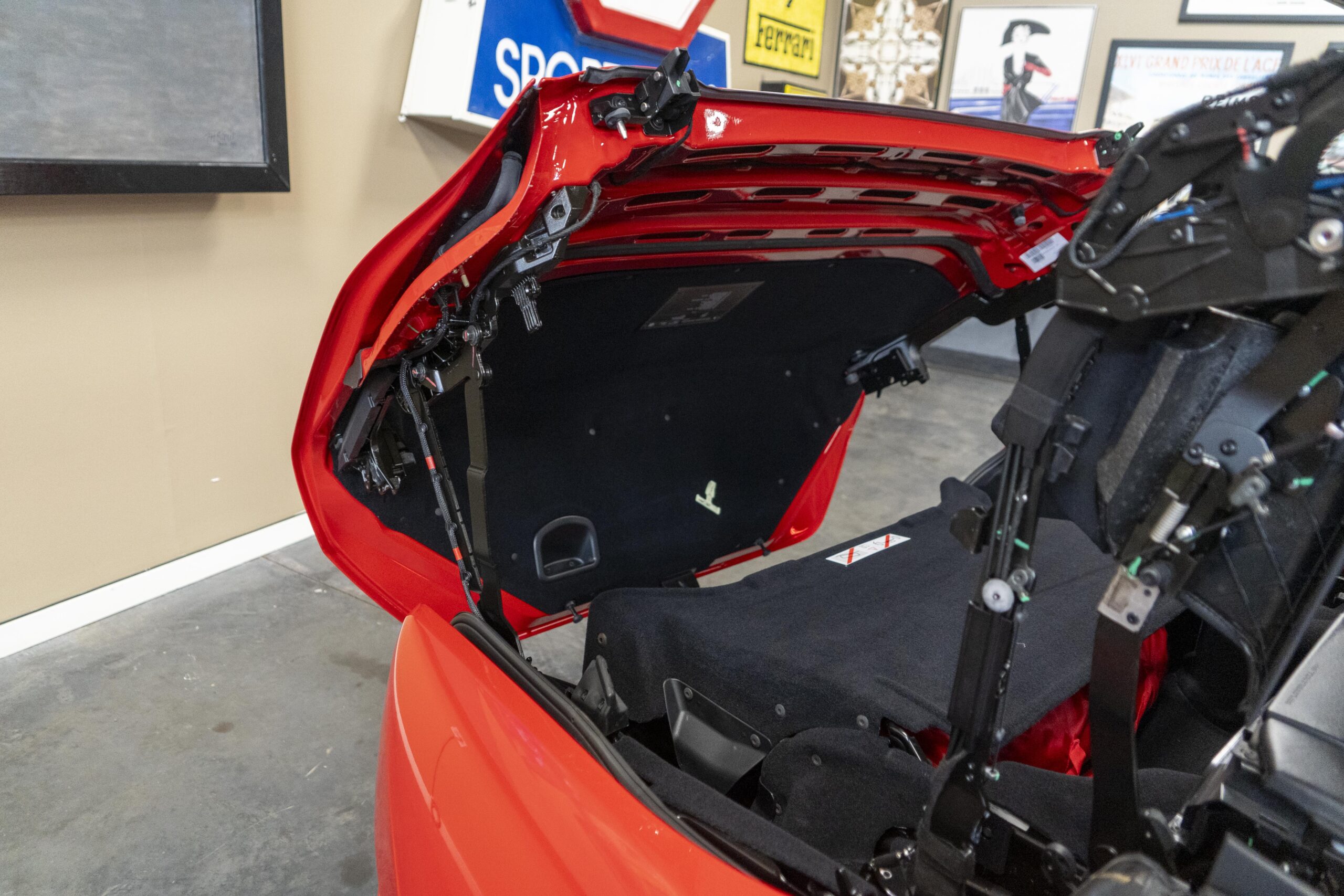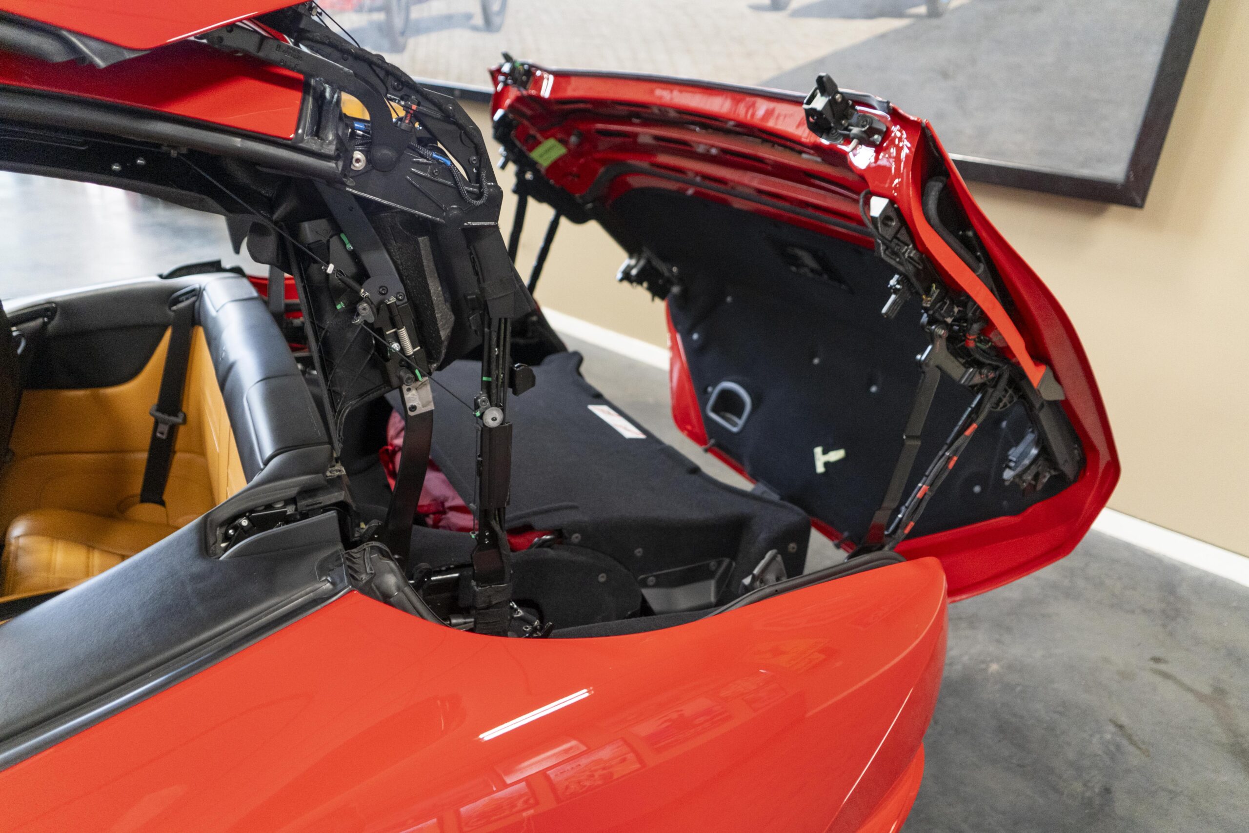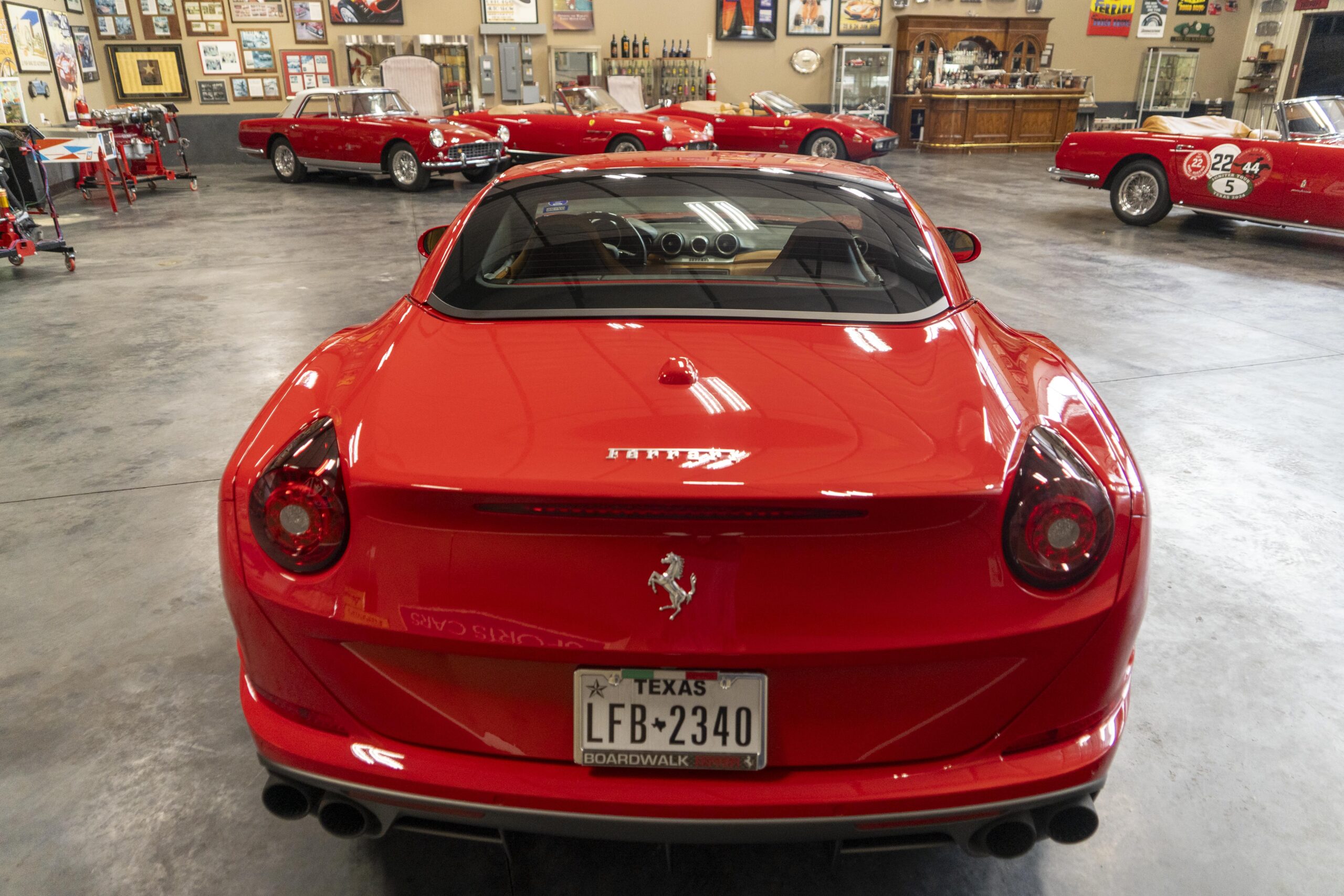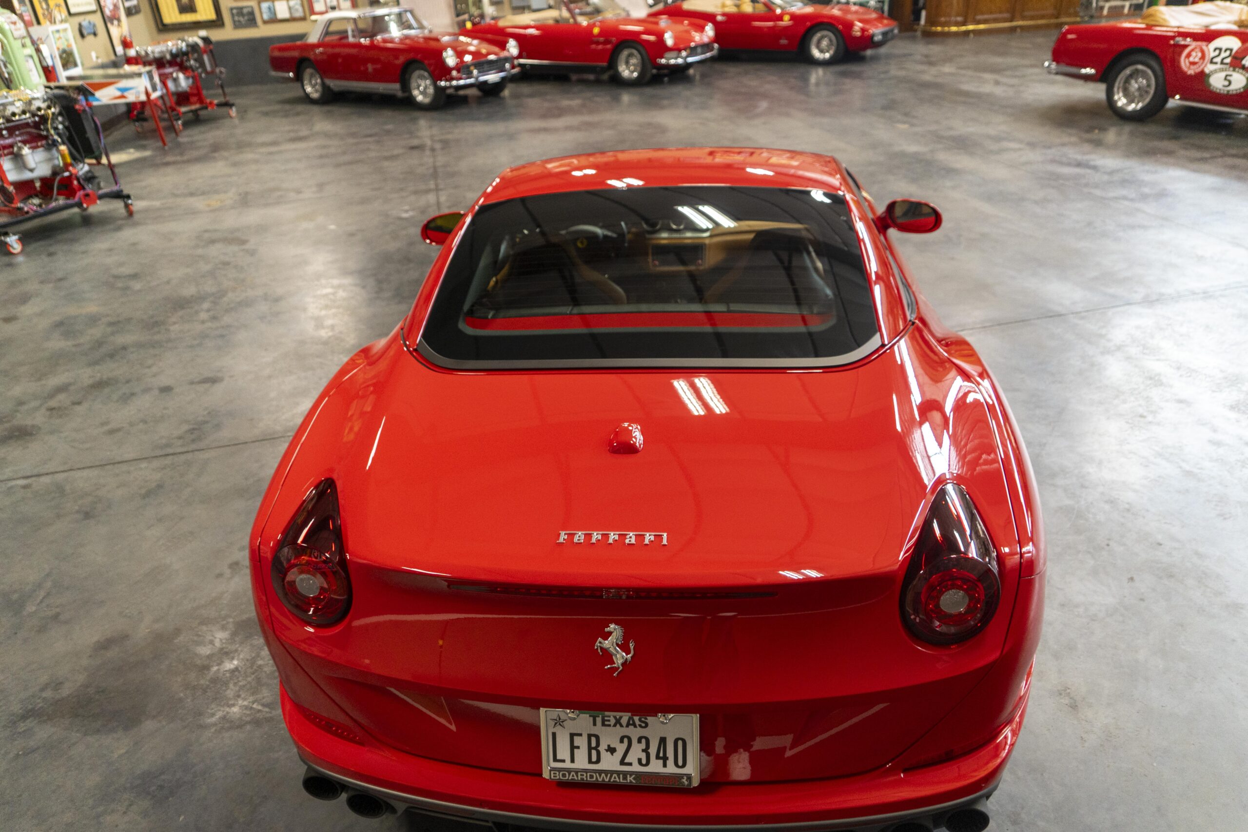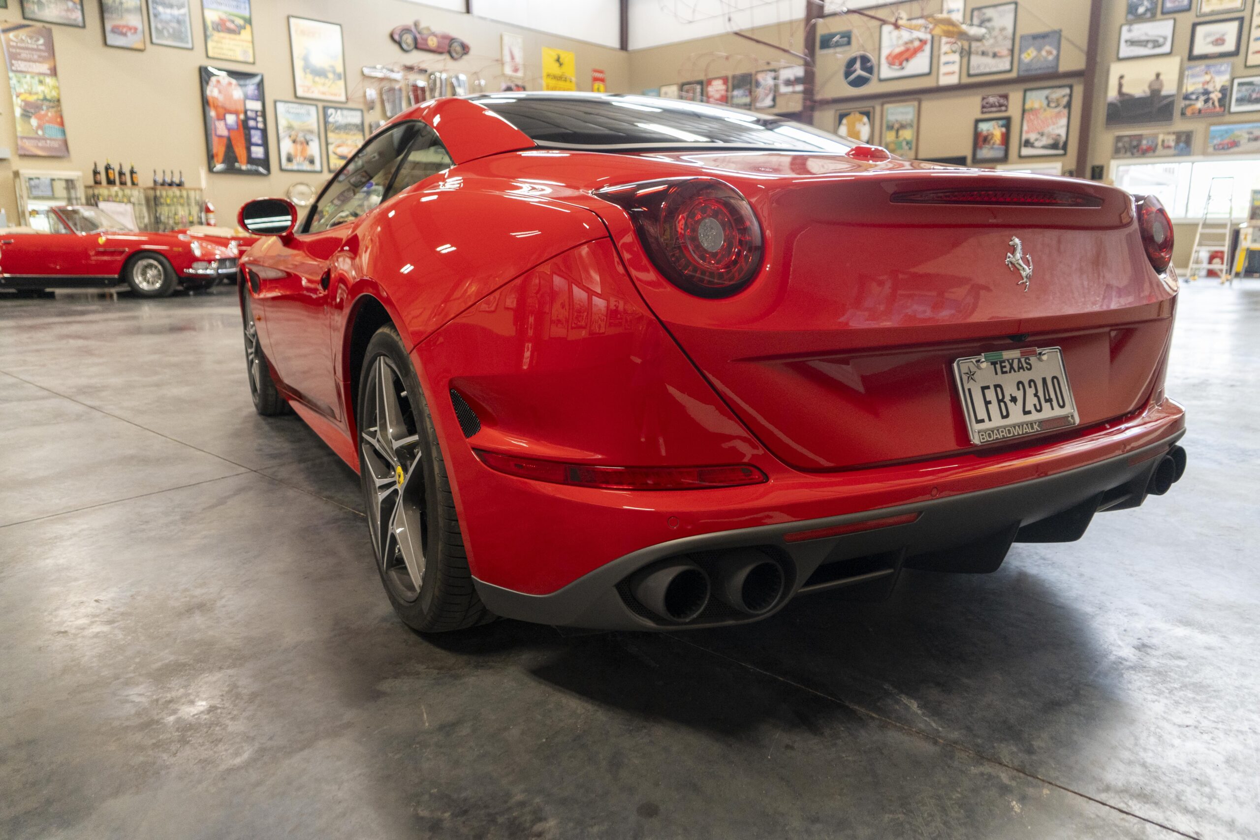 2018 California T s/n 228295 was sold new by Boardwalk Ferrari in Plano, Texas and, as a low mileage one-owner car, has lived in Texas since new. Watching the power top in action, going from down-to-up or vice-versa, in a mere 14 seconds, is a show unto itself! She comes with all the goodies including two keys; the owner’s manual in it’s pouch; the full tool set in its case; the air compressor; the battery tender and the red Factory car cover in its carrying bag. It even has the Factory white gloves, in their small red bag, should a tire change be necessary! An interesting feature of the “T” is a circular digital boost gauge, mounted between the dashboards circular air vents, which monitors the turbo boost, turbo response and turbo efficiency. It is essentially a glorified clock, but it’s great fun to watch in action.