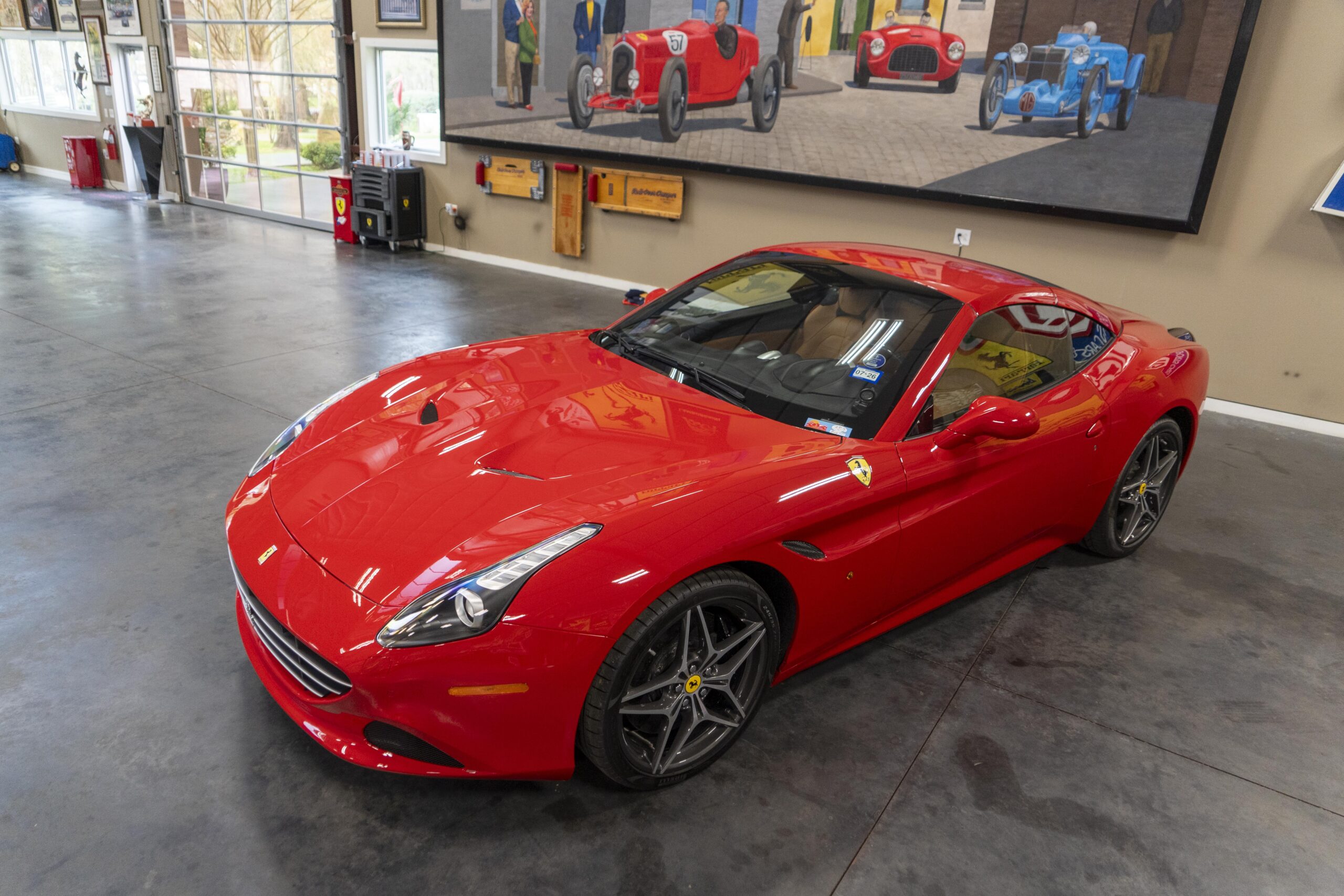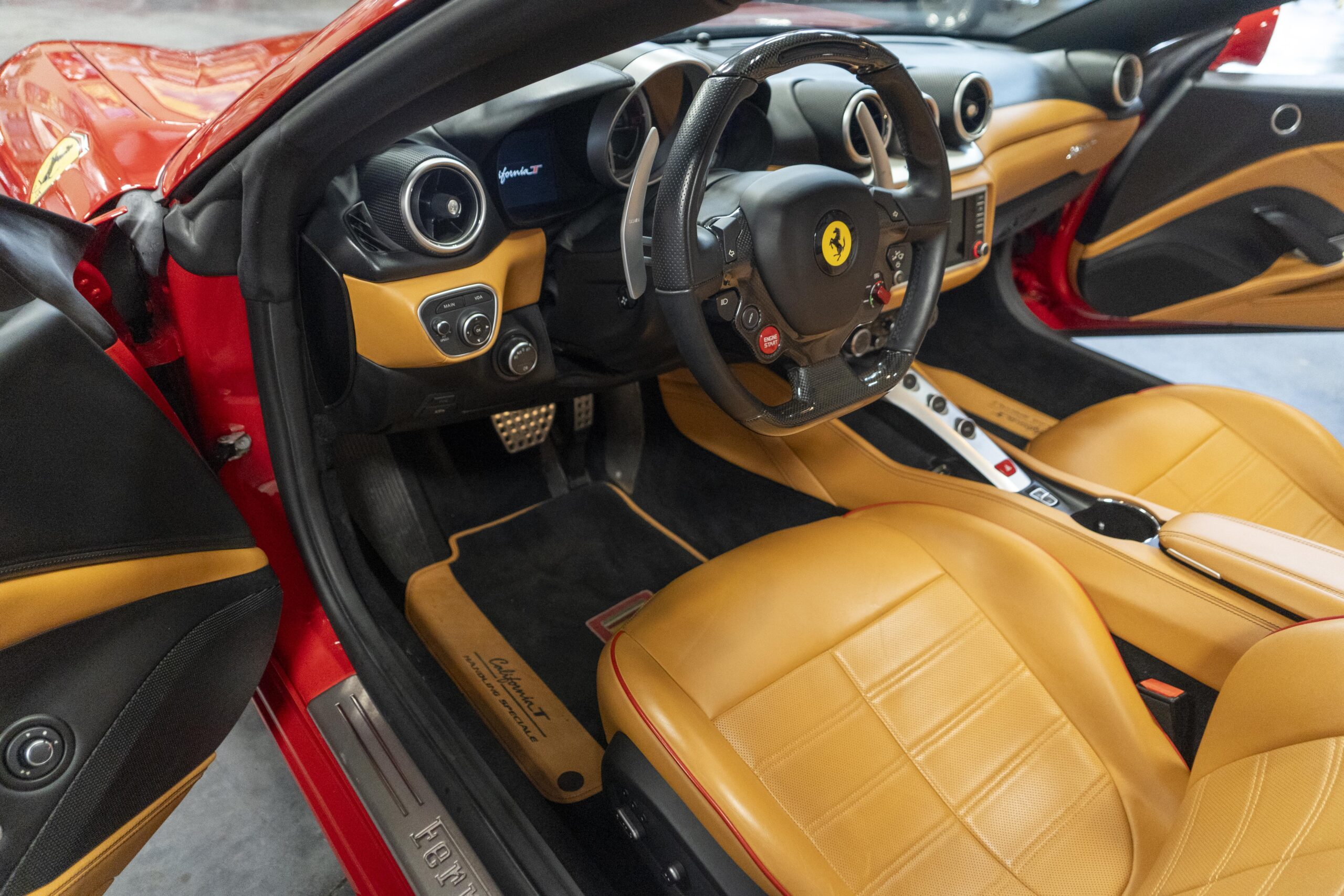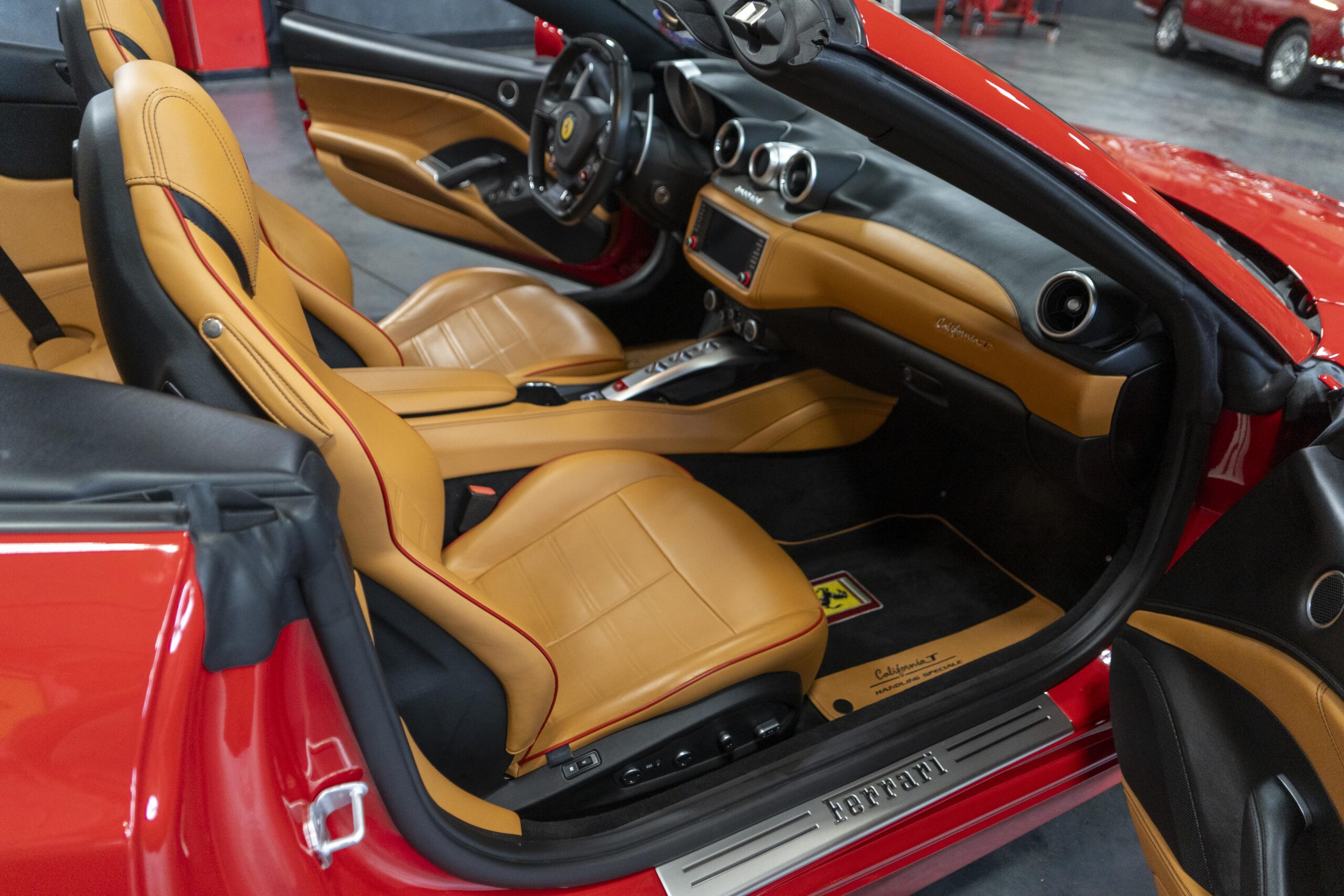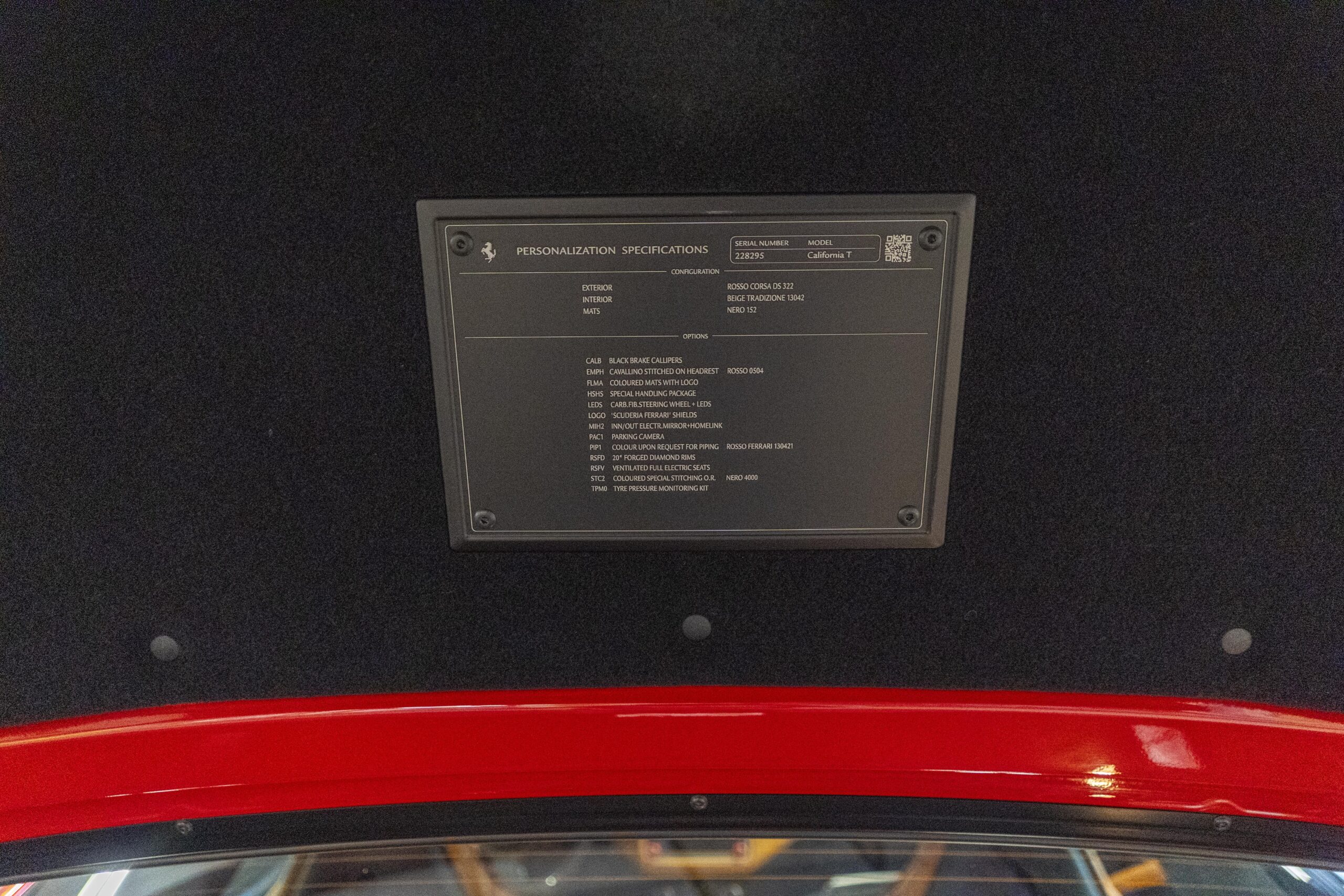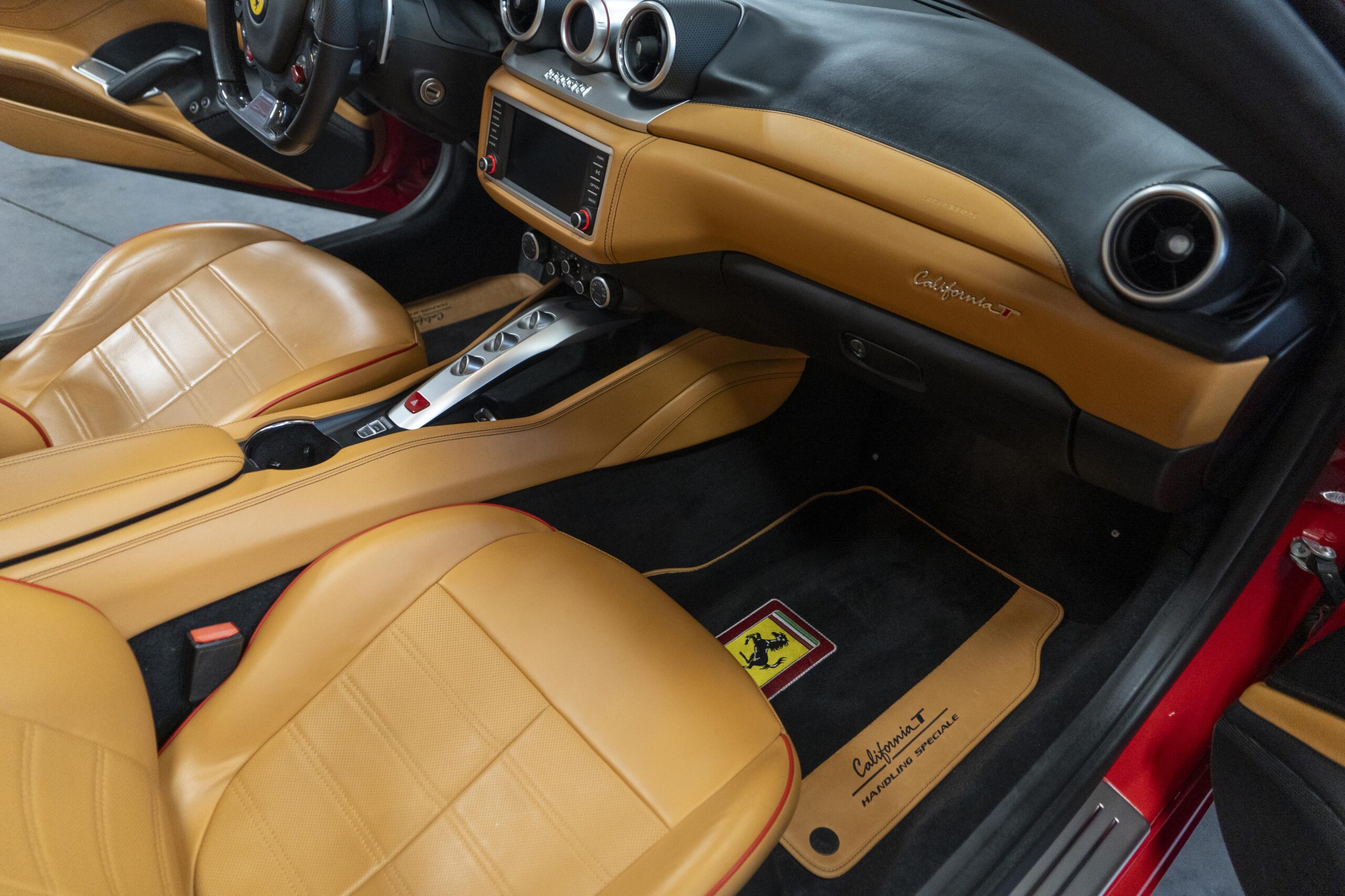 2018 California “T” s/n 228295 is heavily option and finished in Rosso Corsa DS 322 paint with Beige Tradizione 13042 leather with both Rosso 0504 and Rosso Ferrari 130421 stitching, offset with Nero 152 black carpets, still covered in their factory colored throw mats, with both the Ferrari Scuderia and California T Handling Speciale Logos. The base price was $198,973.00 plus $3,750.00 for delivery and handling. A quick walk-around shows the optional Scuderia Shields, ($1,855.00); Black Brake Calipers ($1,517.00) and 20″ Forged Diamond Rims, ($8,099.00). A peak at the interior shows options including a Beige Tradizione 13042 leather interior with Color Upon Request Stitching ($927.00) plus Colored Special Stitching ($759.00); Colored Mats with both logos ($1,349.00); a Carbon fiber steering wheel with LED lights, ($5,145.00); the Special Handling package ($7,227.00); a Backup parking Camera, ($3,712.00); dual Horses stitched on the headrests ($1,265.00); an In/Out Electric Mirror with home link ($3,036.00) and ventilated full electric seats ($7,773.00) for a total of $245,387.00 when new.