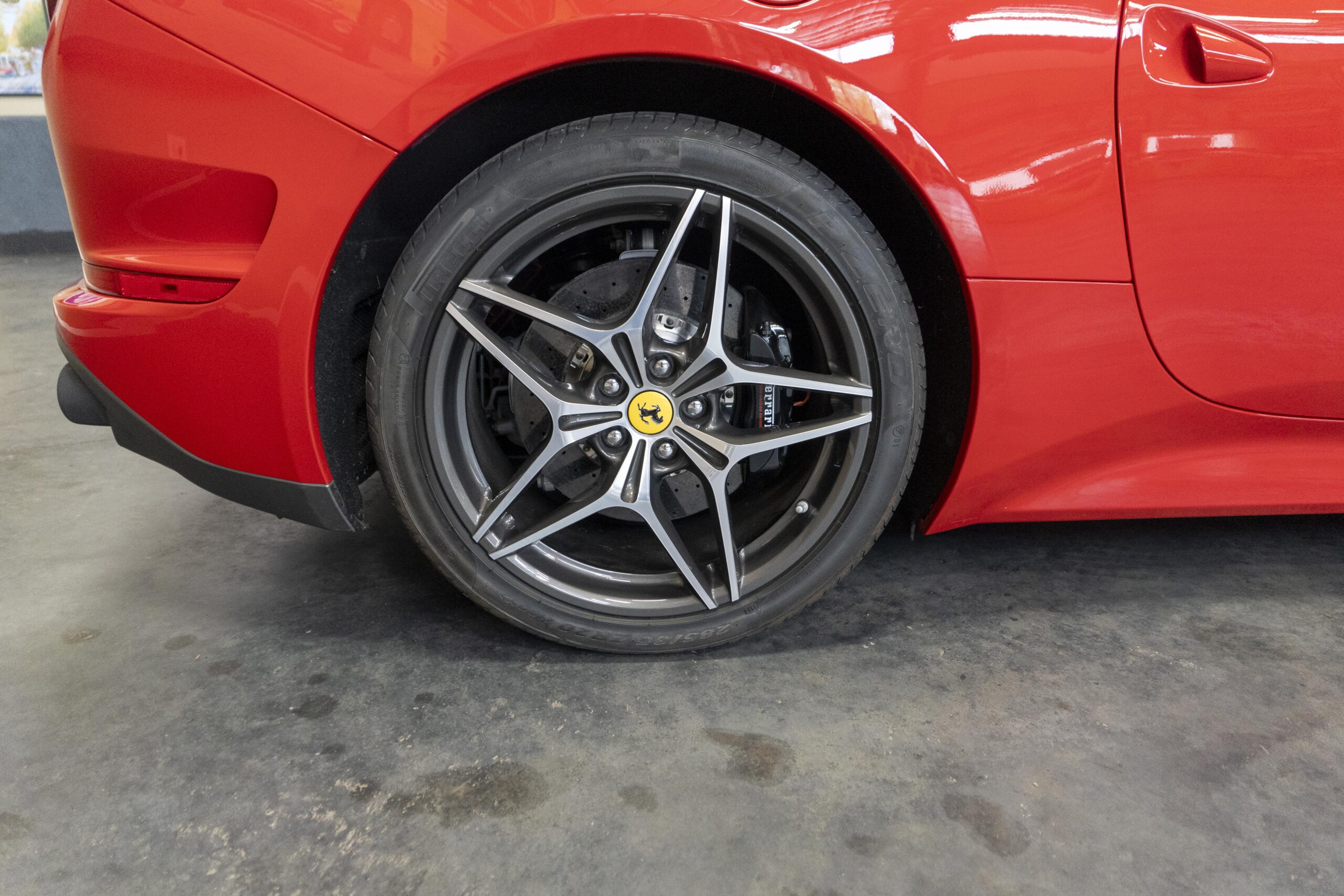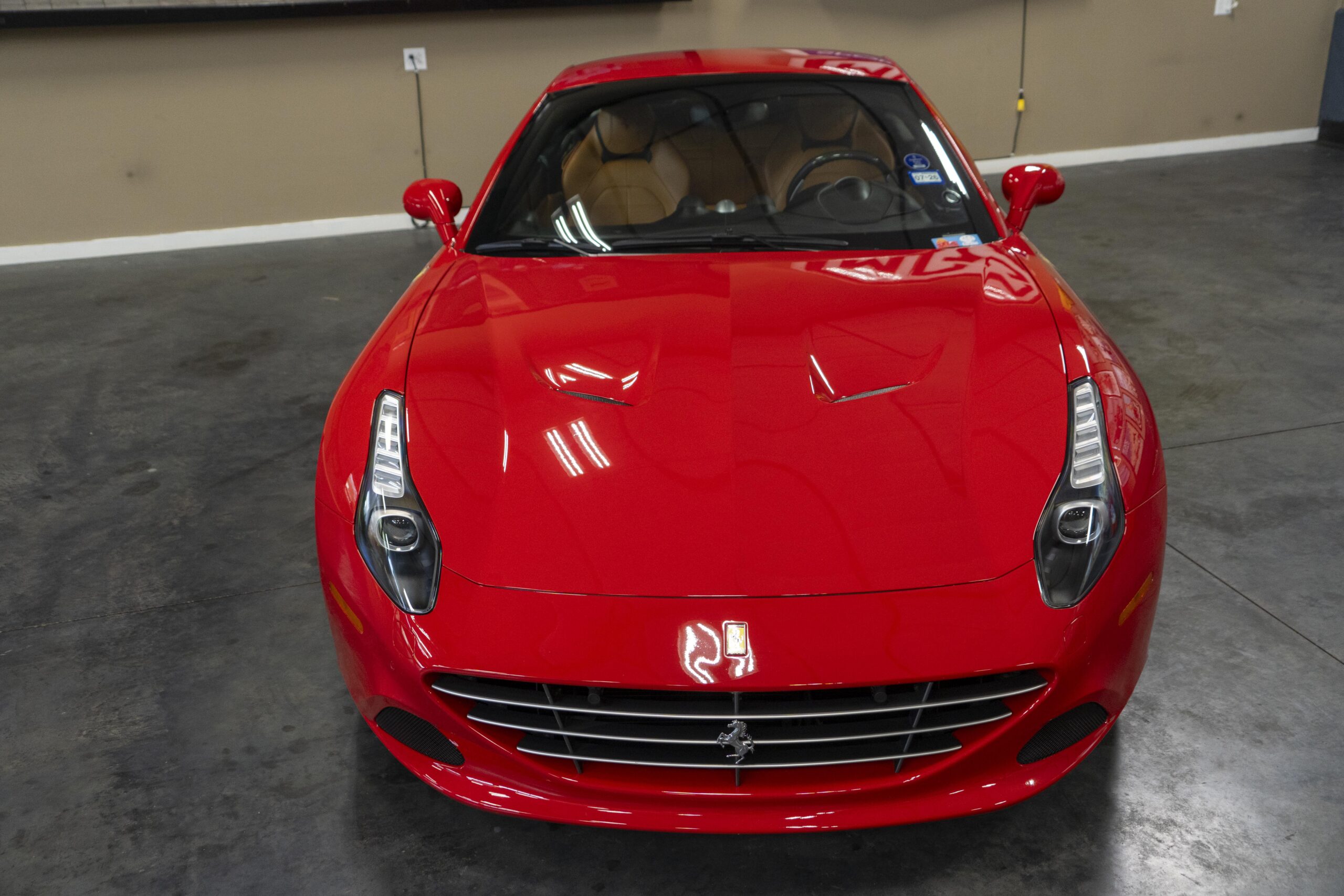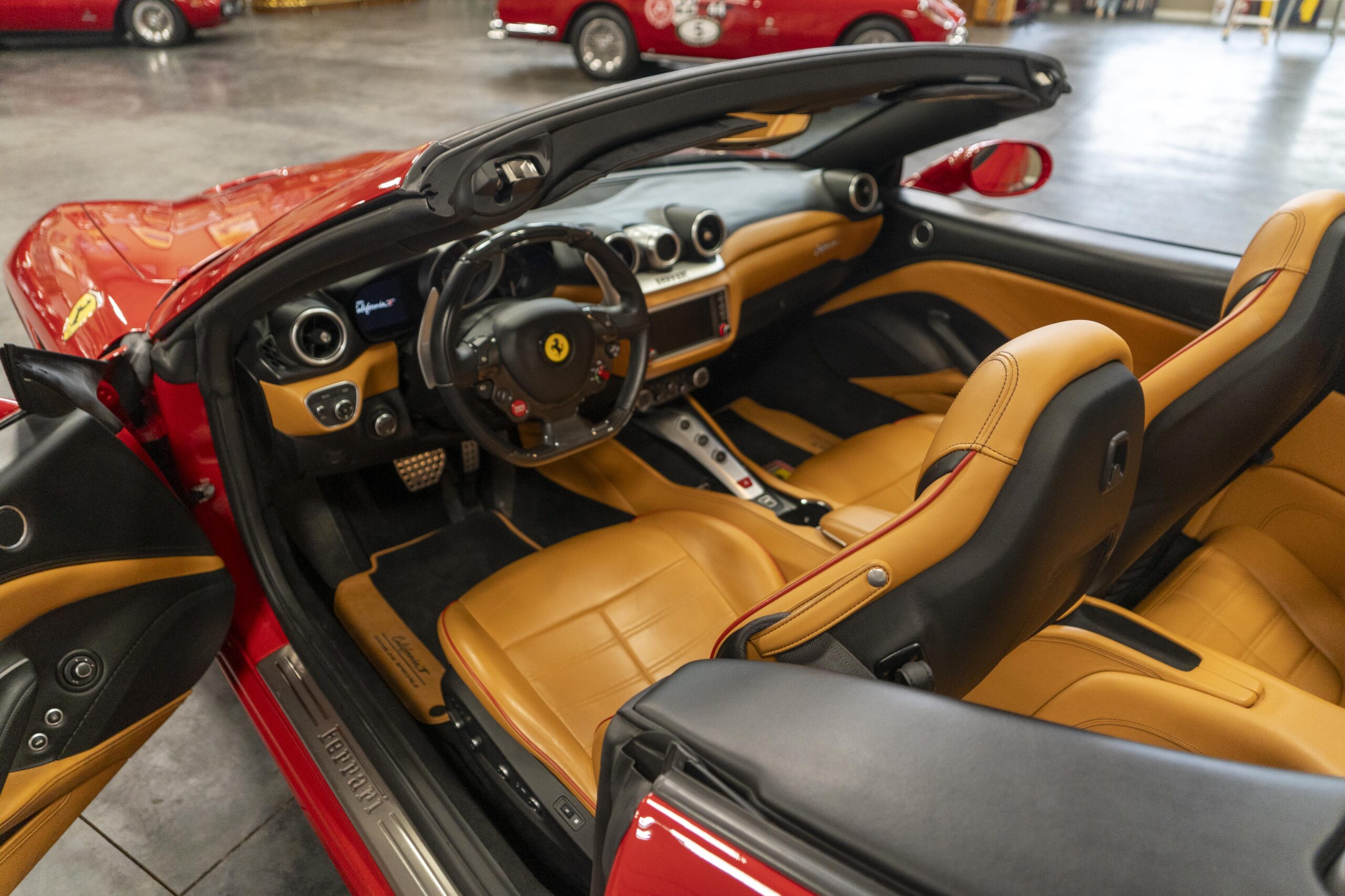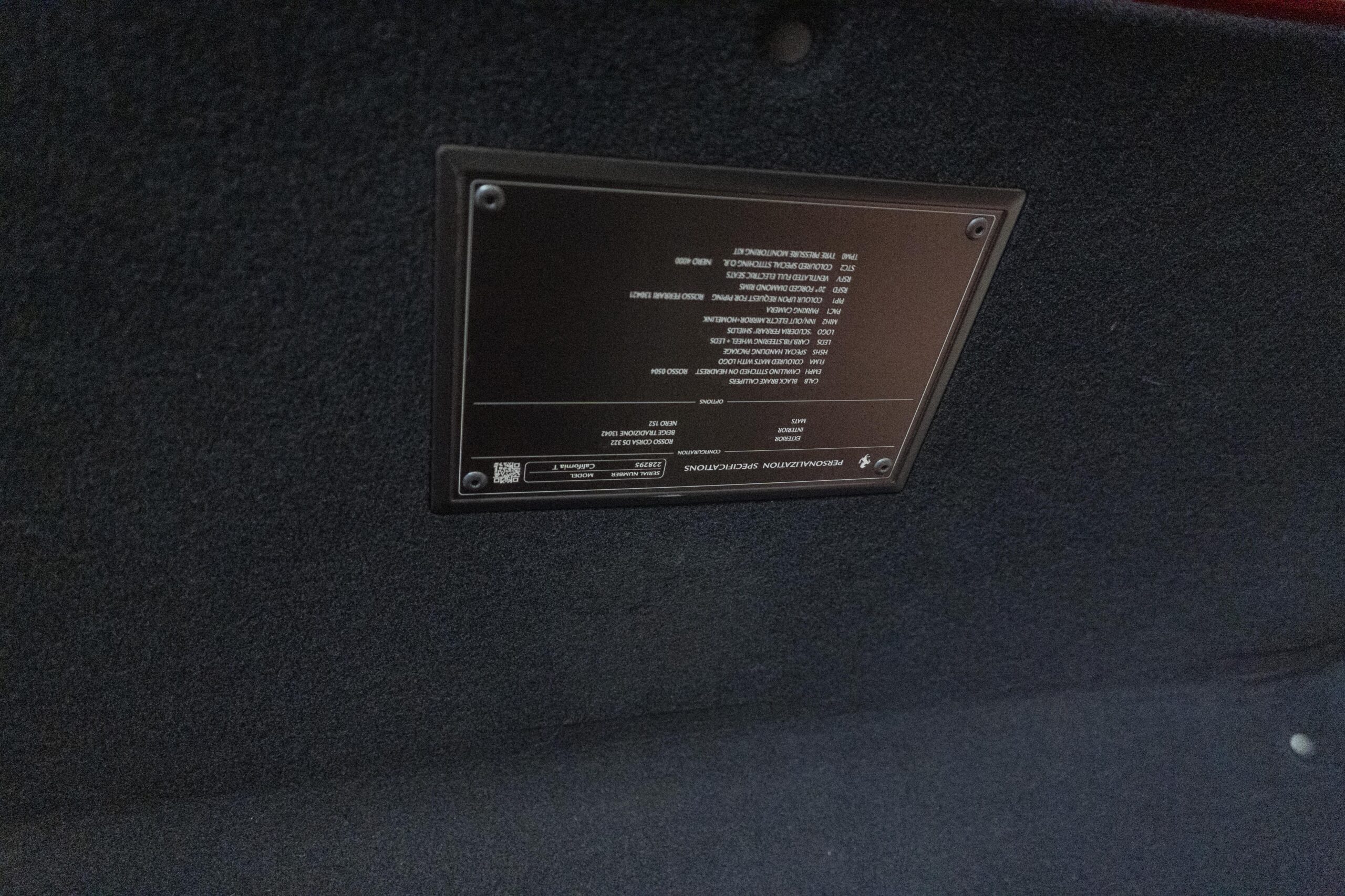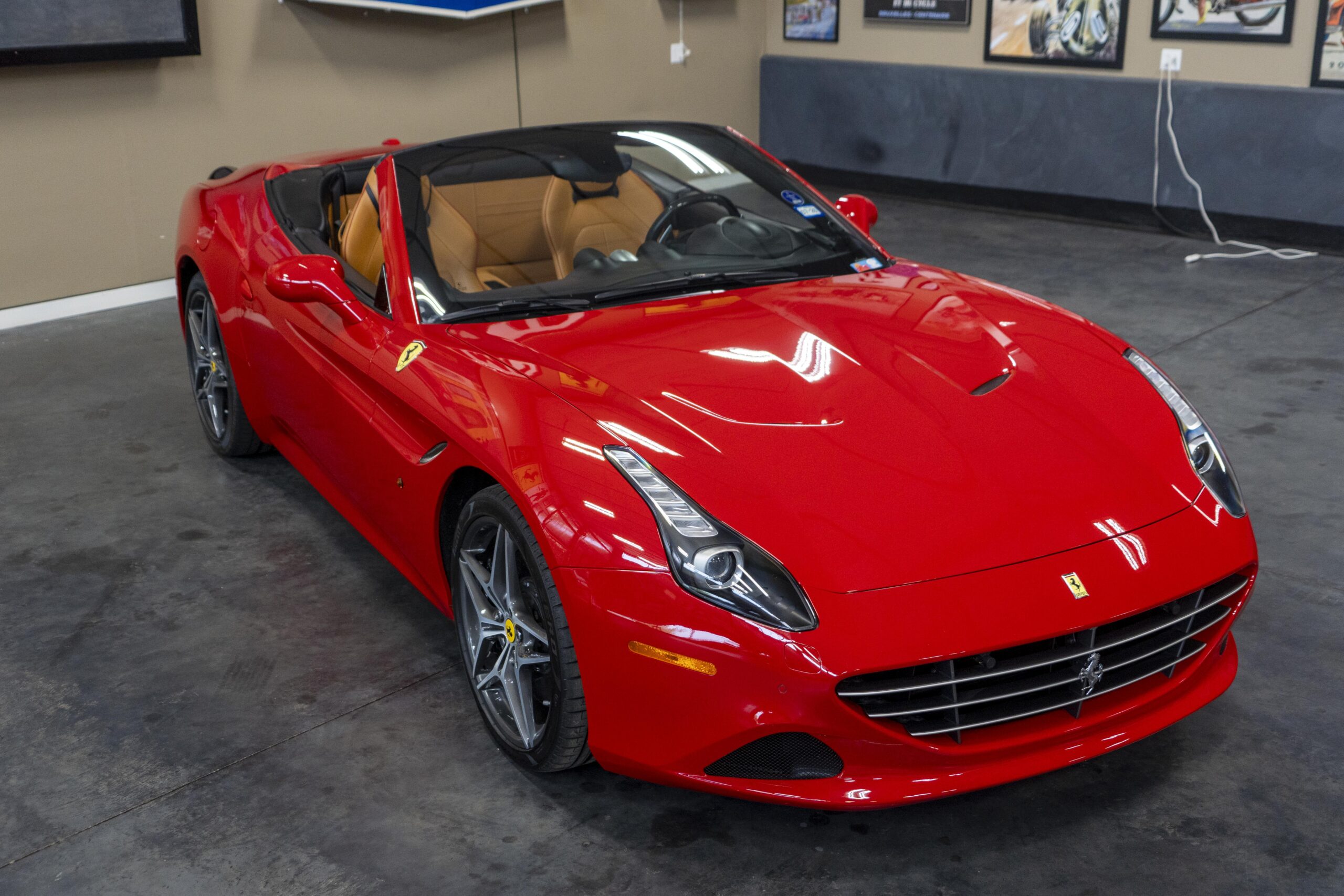 2018 California “T” s/n 228295 is heavily option and finished in Rosso Corsa DS 322 paint with Beige Tradizione 13042 leather with both Rosso 0504 and Rosso Ferrari 130421 stitching, offset with Nero 152 black carpets, still covered in their factory colored throw mats, with both the Ferrari Scuderia and California T Handling Speciale Logos. The base price was $198,973.00 plus $3,750.00 for delivery and handling. A quick walk-around shows the optional Scuderia Shields, ($1,855.00); Black Brake Calipers ($1,517.00) and 20″ Forged Diamond Rims, ($8,099.00). A peak at the interior shows options including a Beige Tradizione 13042 leather interior with Color Upon Request Stitching ($927.00) plus Colored Special Stitching ($759.00); Colored Mats with both logos ($1,349.00); a Carbon fiber steering wheel with LED lights, ($5,145.00); the Special Handling package ($7,227.00); a Backup parking Camera, ($3,712.00); dual Horses stitched on the headrests ($1,265.00); an In/Out Electric Mirror with home link ($3,036.00) and ventilated full electric seats ($7,773.00) for a total of $245,387.00 when new.