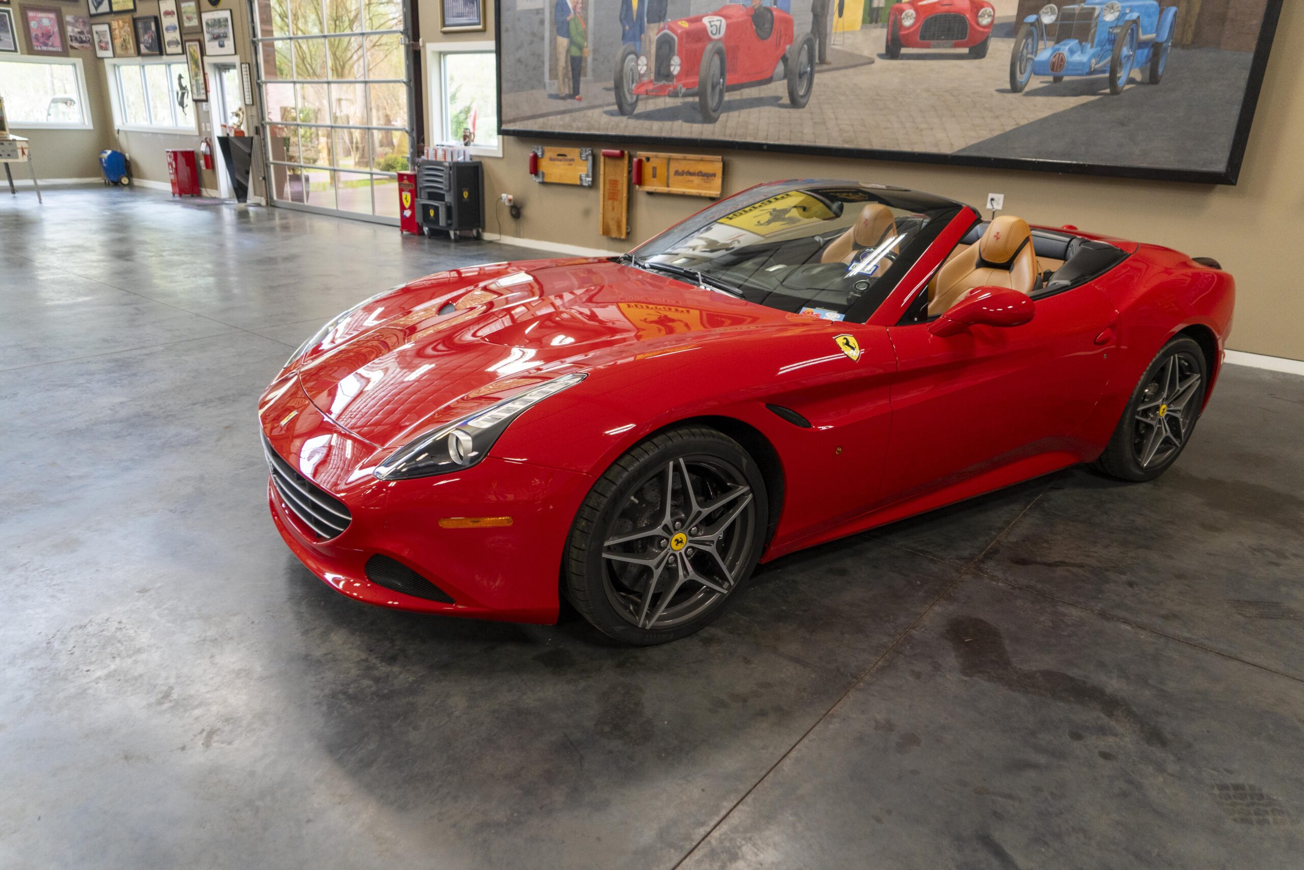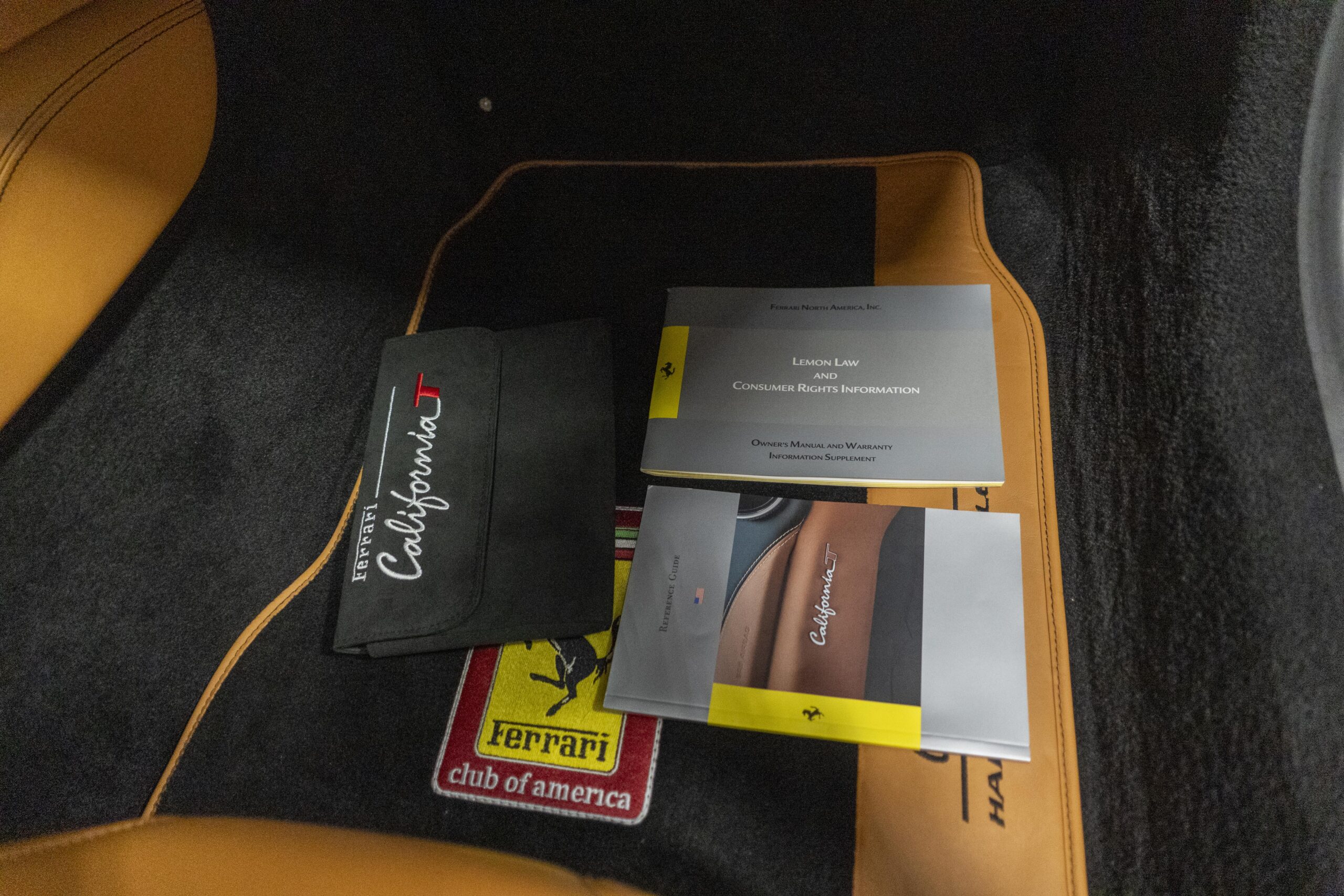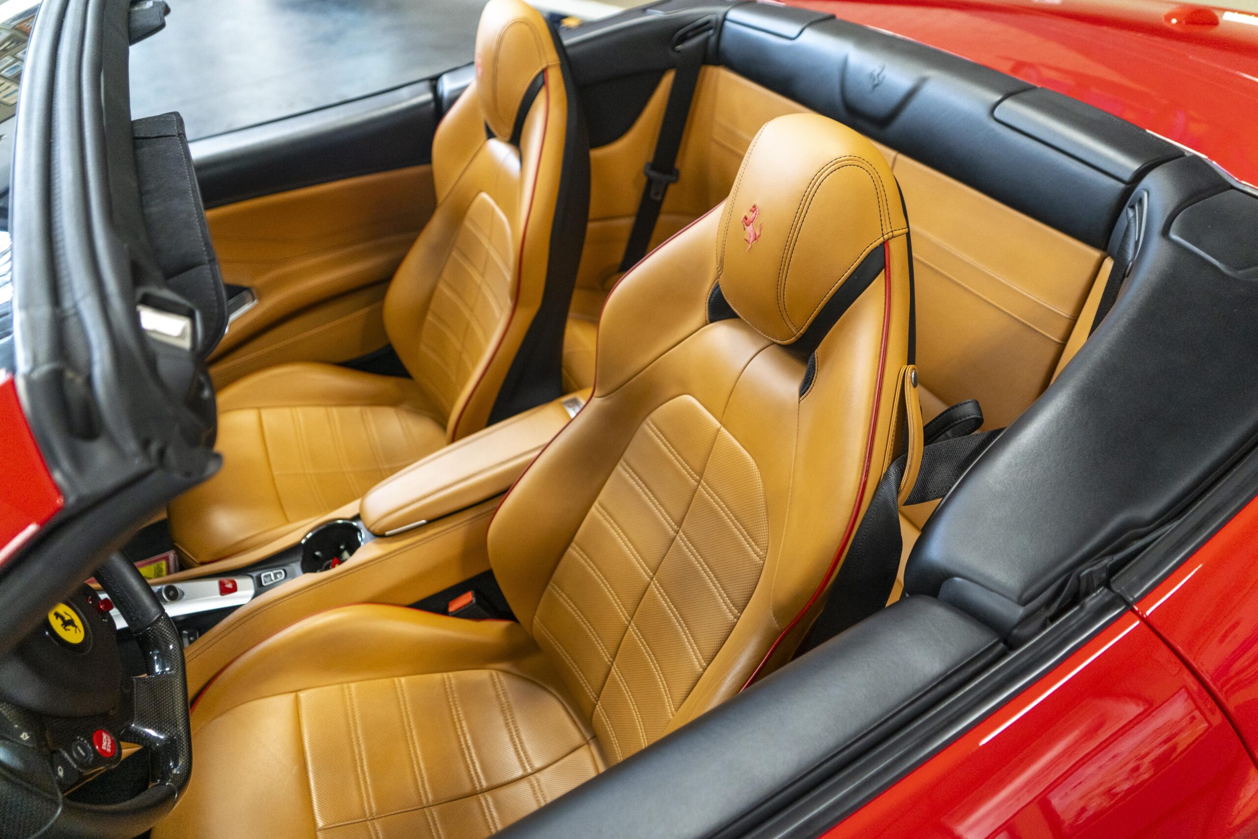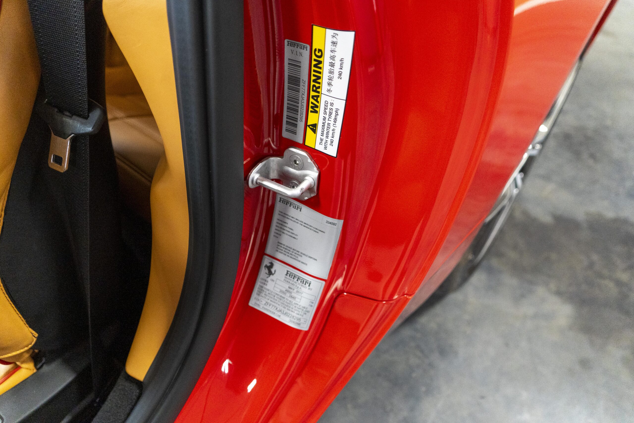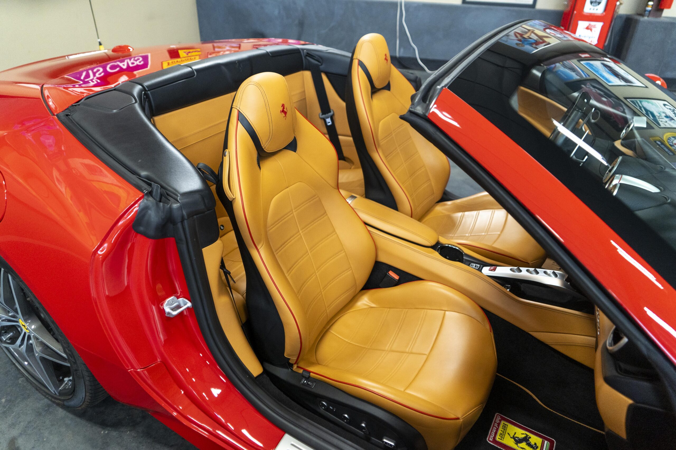 2018 California “T” s/n 228295 is heavily option and finished in Rosso Corsa DS 322 paint with Beige Tradizione 13042 leather with both Rosso 0504 and Rosso Ferrari 130421 stitching, offset with Nero 152 black carpets, still covered in their factory colored throw mats, with both the Ferrari Scuderia and California T Handling Speciale Logos. The base price was $198,973.00 plus $3,750.00 for delivery and handling. A quick walk-around shows the optional Scuderia Shields, ($1,855.00); Black Brake Calipers ($1,517.00) and 20″ Forged Diamond Rims, ($8,099.00). A peak at the interior shows options including a Beige Tradizione 13042 leather interior with Color Upon Request Stitching ($927.00) plus Colored Special Stitching ($759.00); Colored Mats with both logos ($1,349.00); a Carbon fiber steering wheel with LED lights, ($5,145.00); the Special Handling package ($7,227.00); a Backup parking Camera, ($3,712.00); dual Horses stitched on the headrests ($1,265.00); an In/Out Electric Mirror with home link ($3,036.00) and ventilated full electric seats ($7,773.00) for a total of $245,387.00 when new.