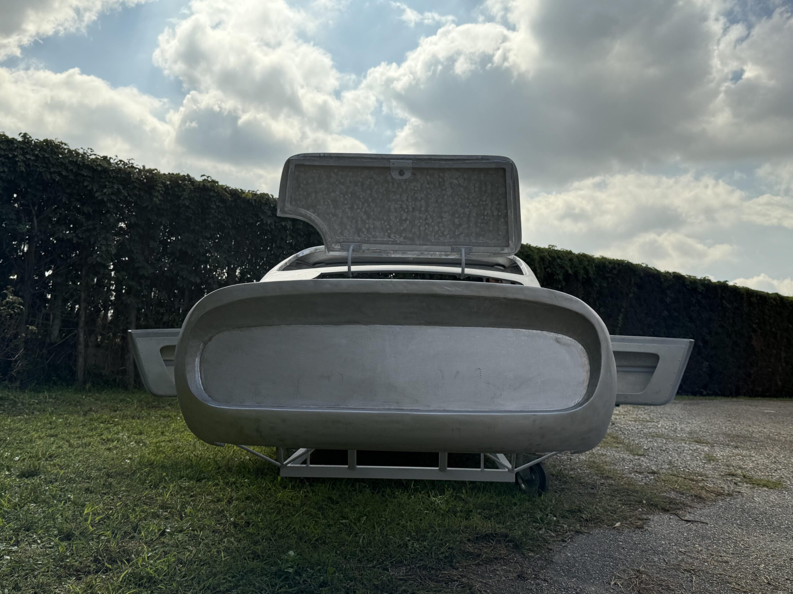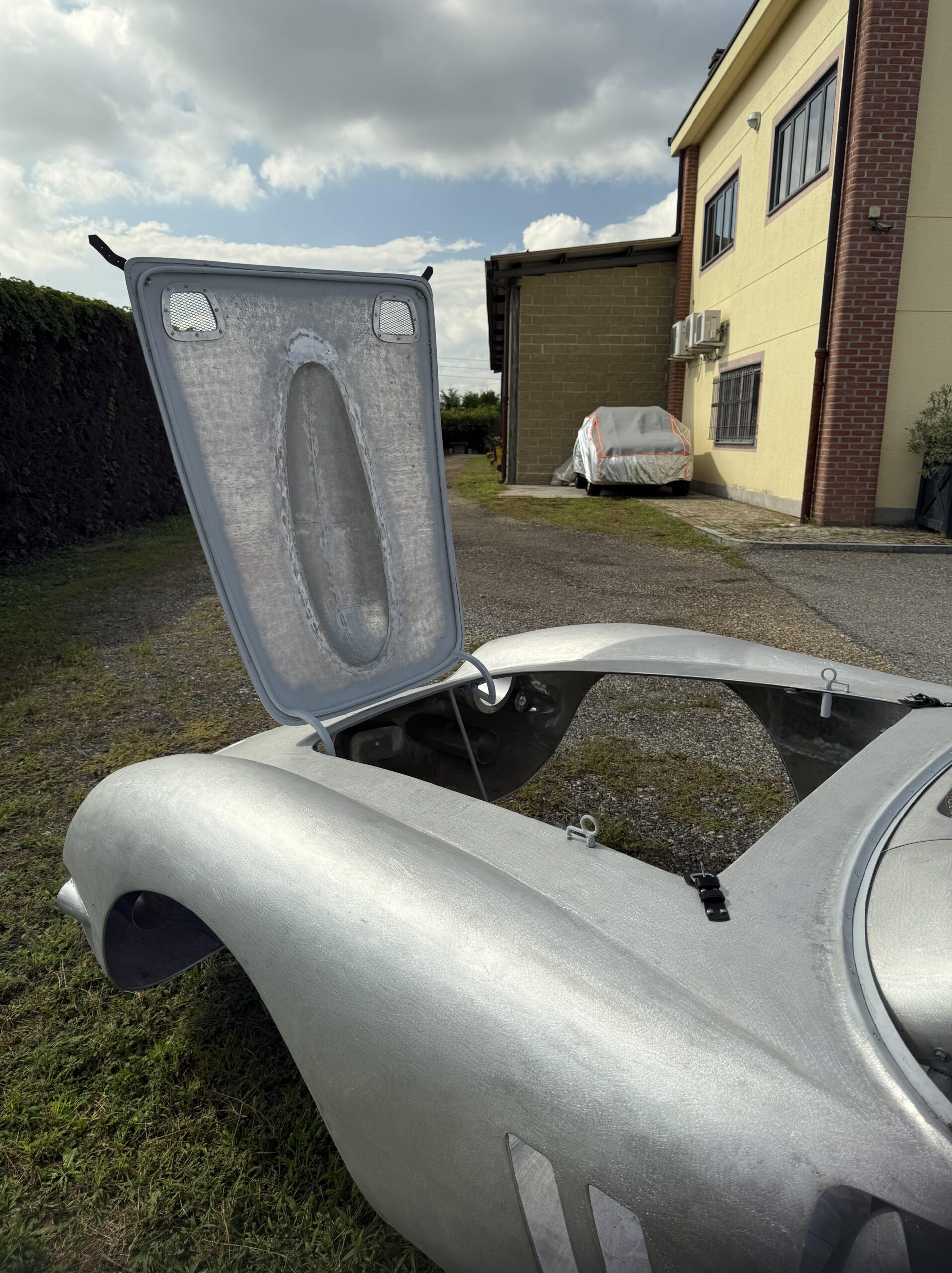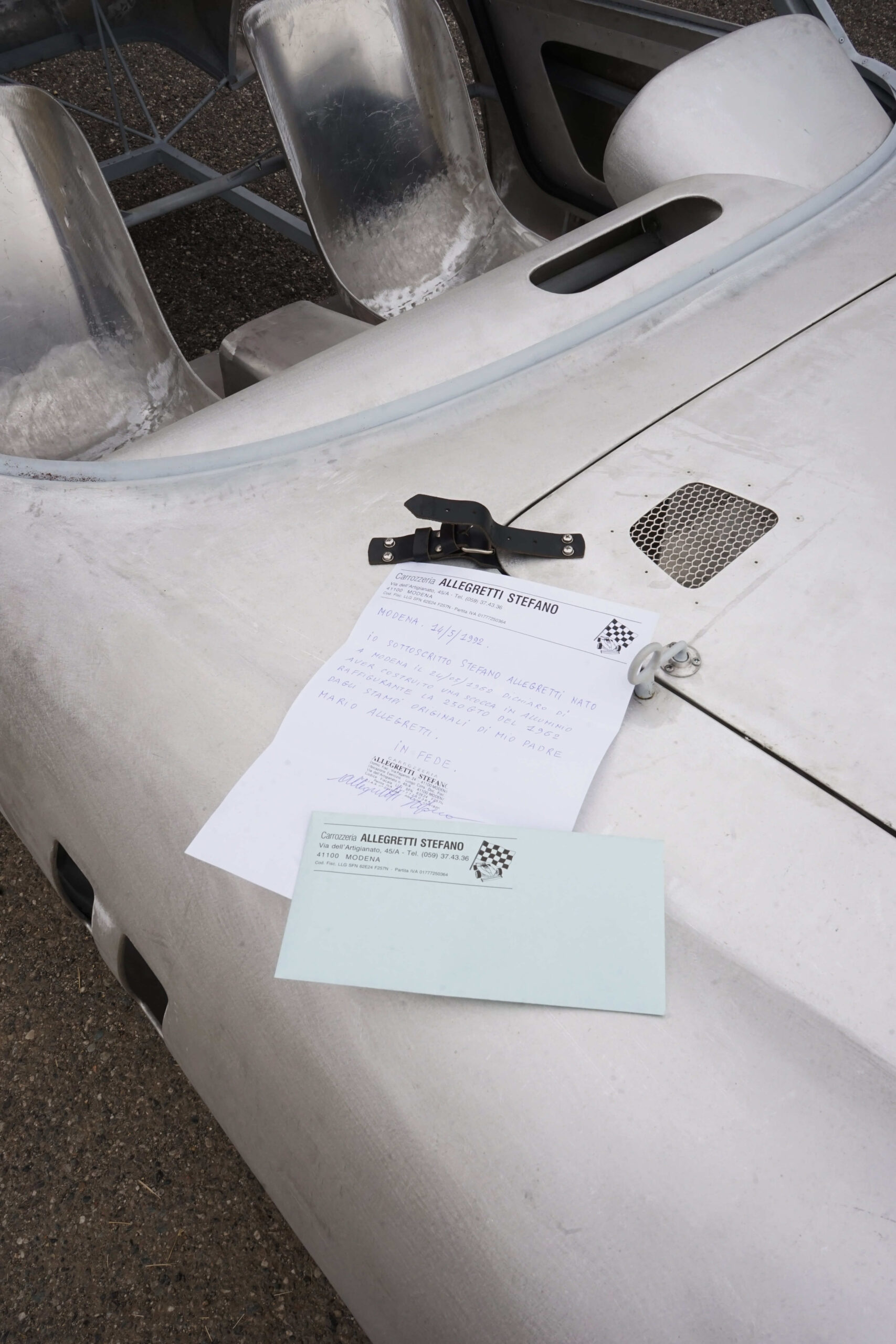 We are pleased to offer a new and unused 250 GTO Series I alloy body by Stefano Allegretti, based on the molds and patterns passed down by his father, Mario Allegretti, complete with the secondary and tertiary supporting framework for the front cowl frame, roof inner frame, hood skin, hood frame and hood hinges, door skins, door frames, door posts and door hinges, door pull handles and door latches; the dash, the center tunnel, the cockpit floor, both seat skins, seat frames and mounts and the trunk skin, frame, mounts and hinges. It also comes with the hood vent screens, the leather hood straps and spring loaded hood hold-downs. The body was completed by Stefano Allegretti in 2022 and has been in storage since 2022.